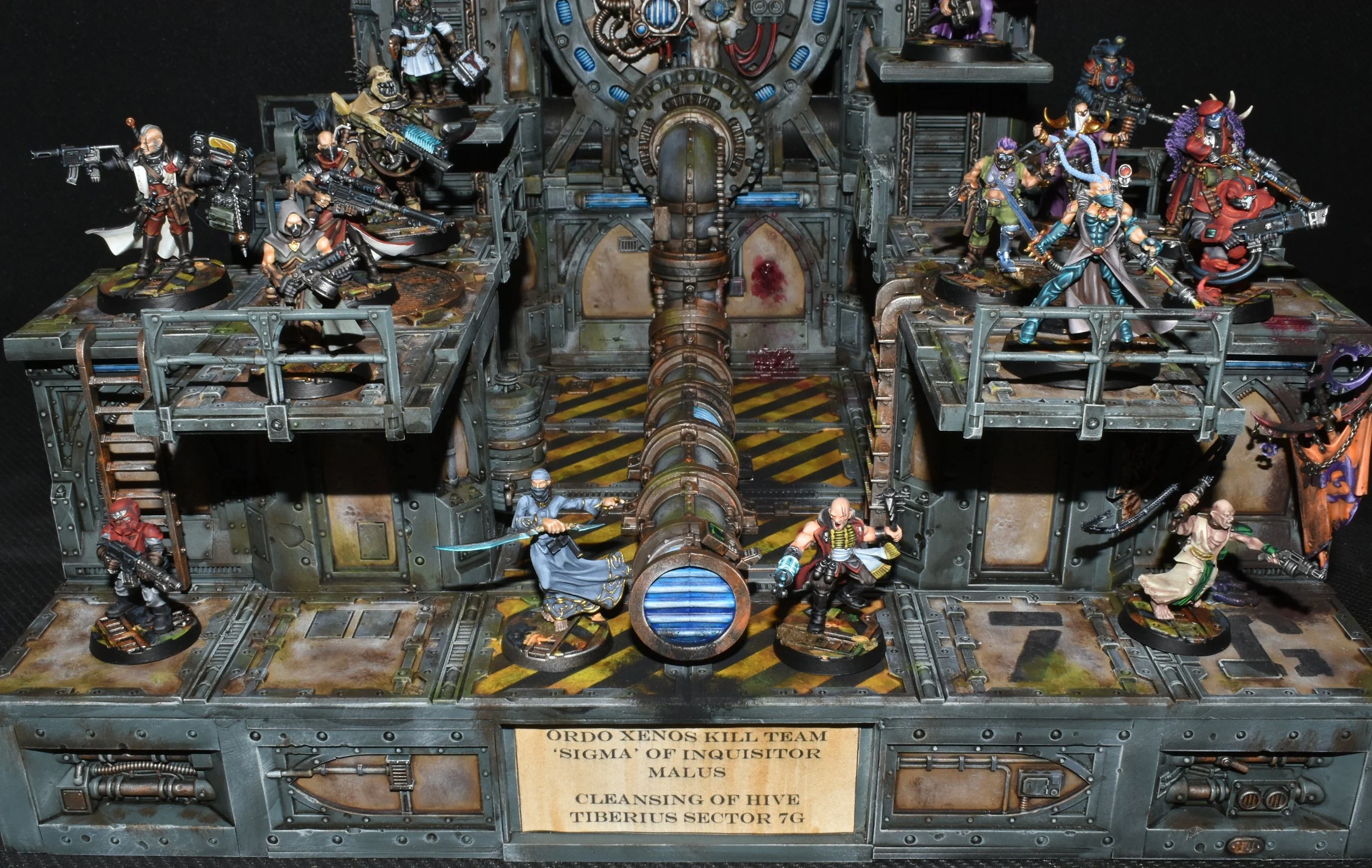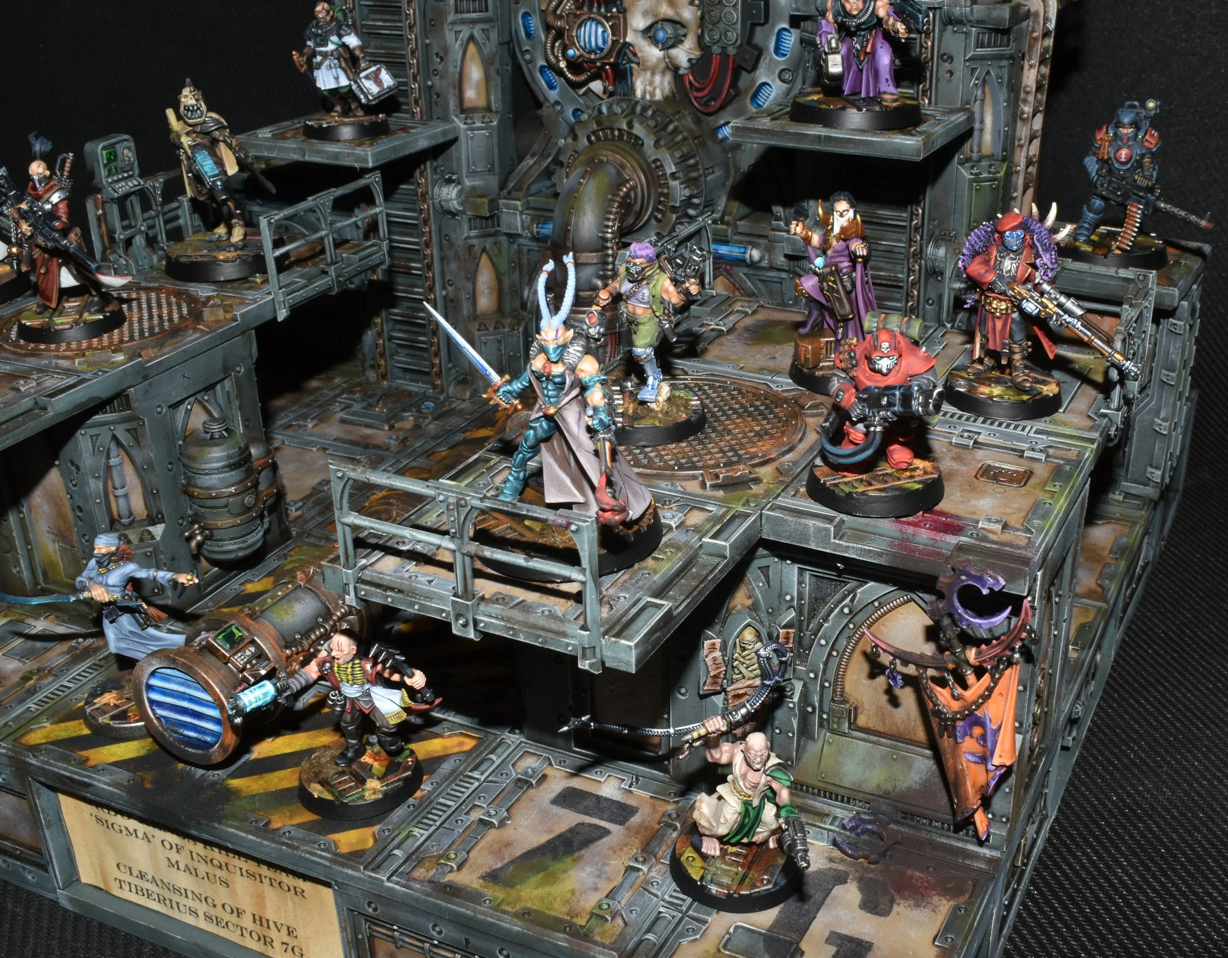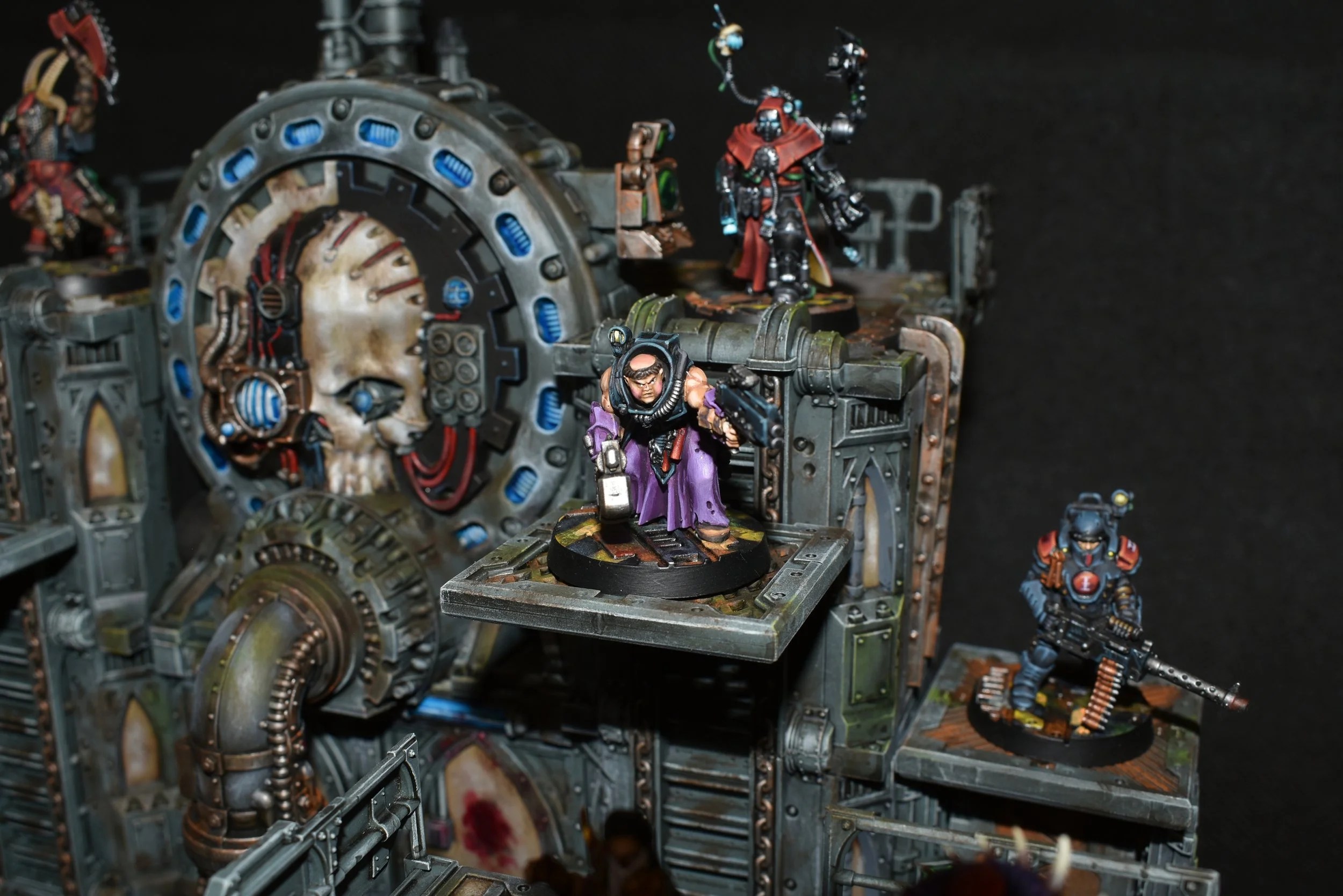 The theme for the army is an inquisitorial retinue of an Ordo Xenos inquisitor purging the underhive, following rumours of a Genestealer cult infestation. The scene would have them having cleared a sector of the hive, showing some subtle clues to the GSC being there.