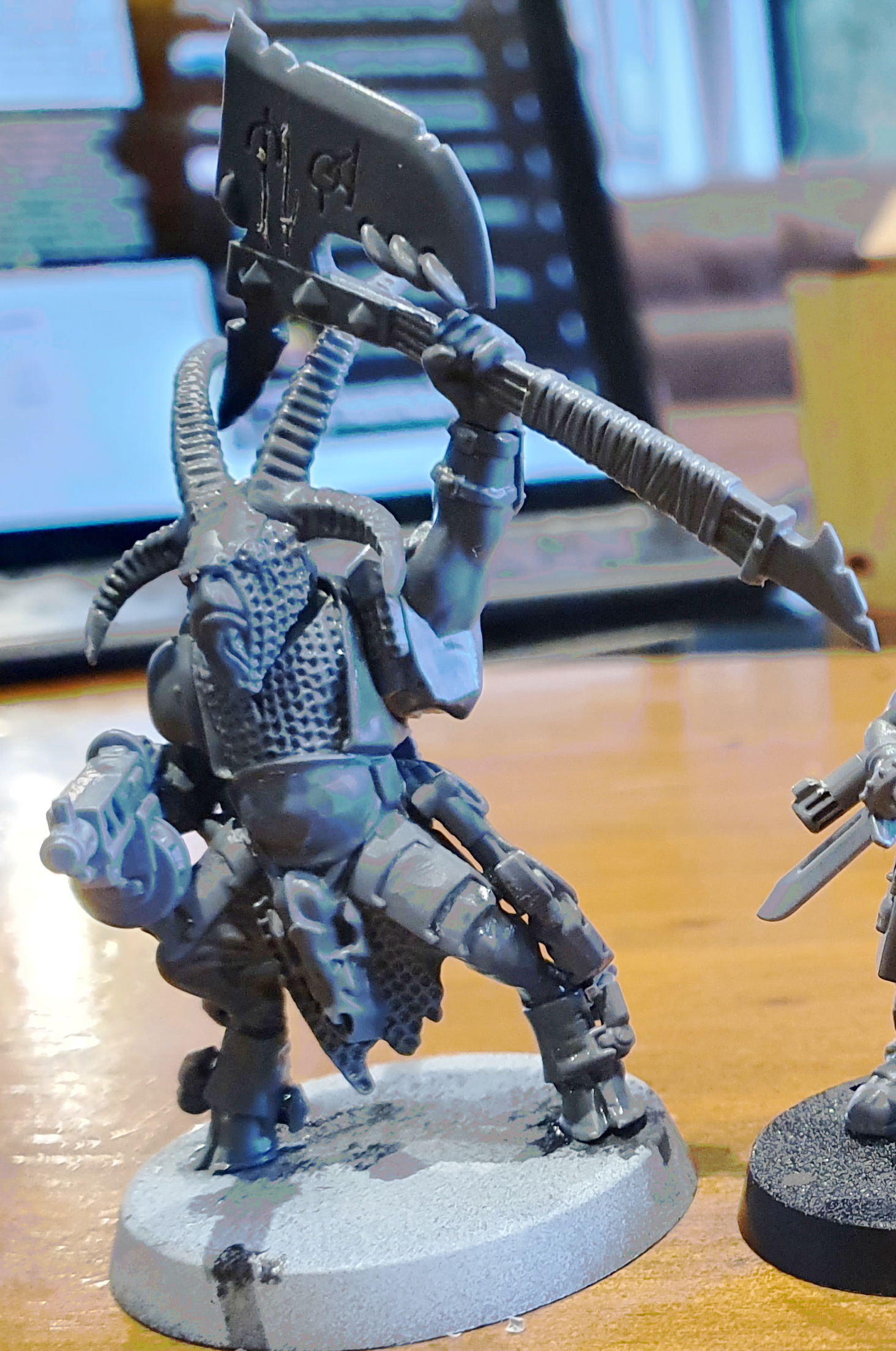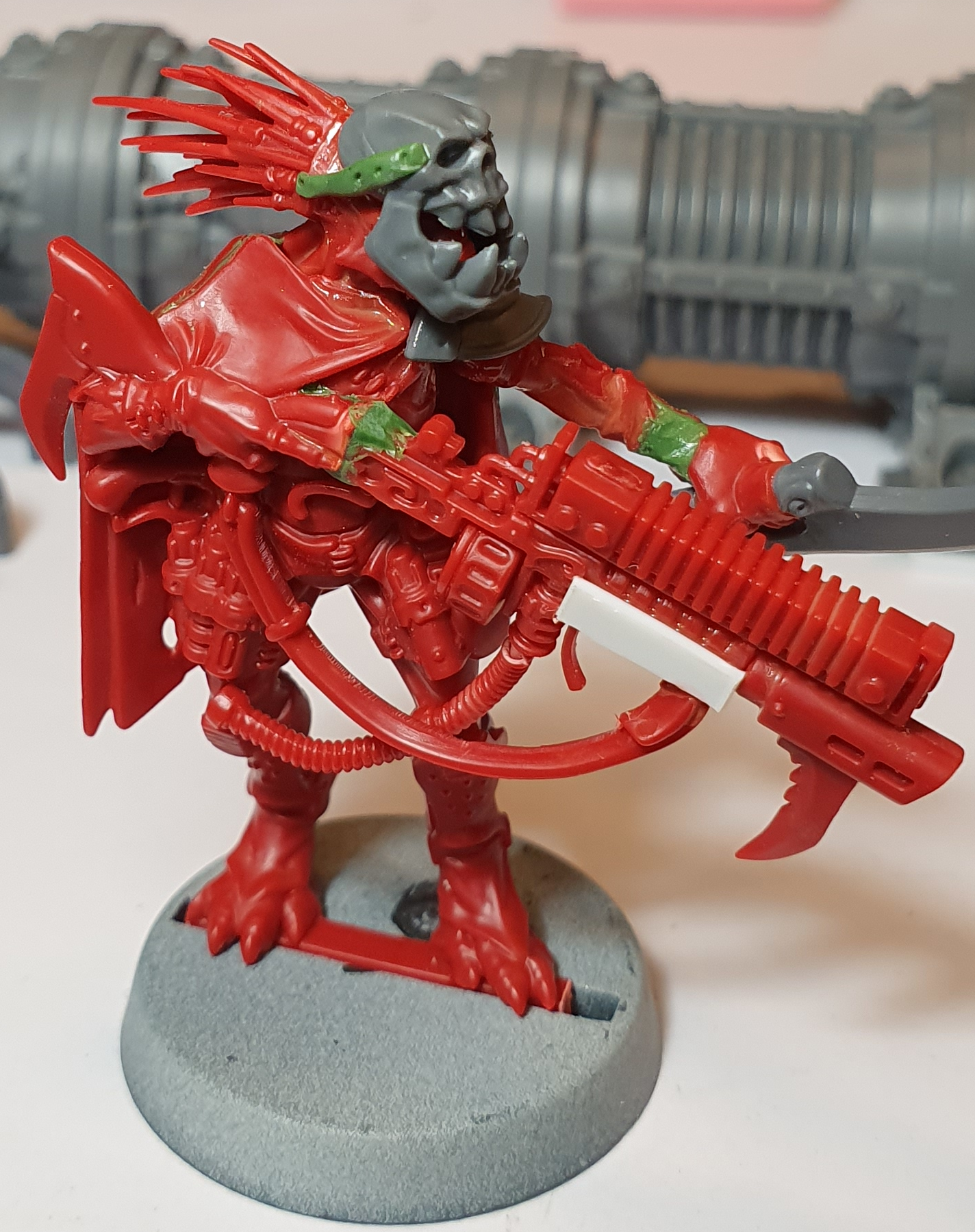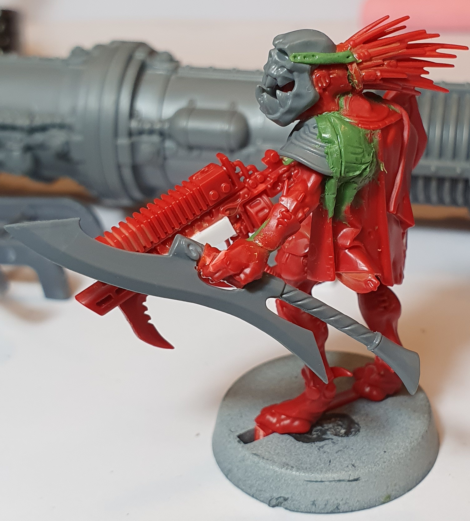 I had wanted a Kroot from early stages but could not find any cheap but i got the Dayak Ghrek instead. its a very flat model. i changed his gun to a mechanicus one but added back in the blade. i took his bracing arm and twisted it and added it as the handle of the gladeguard giant blade. added an orlock shoulder pad, sculpted a bunch of stuff and then added in the ork skull as a mask. probably my least favourite for all the work, though it turned out ok. the gun pipe got tucked between his legs and glued in.