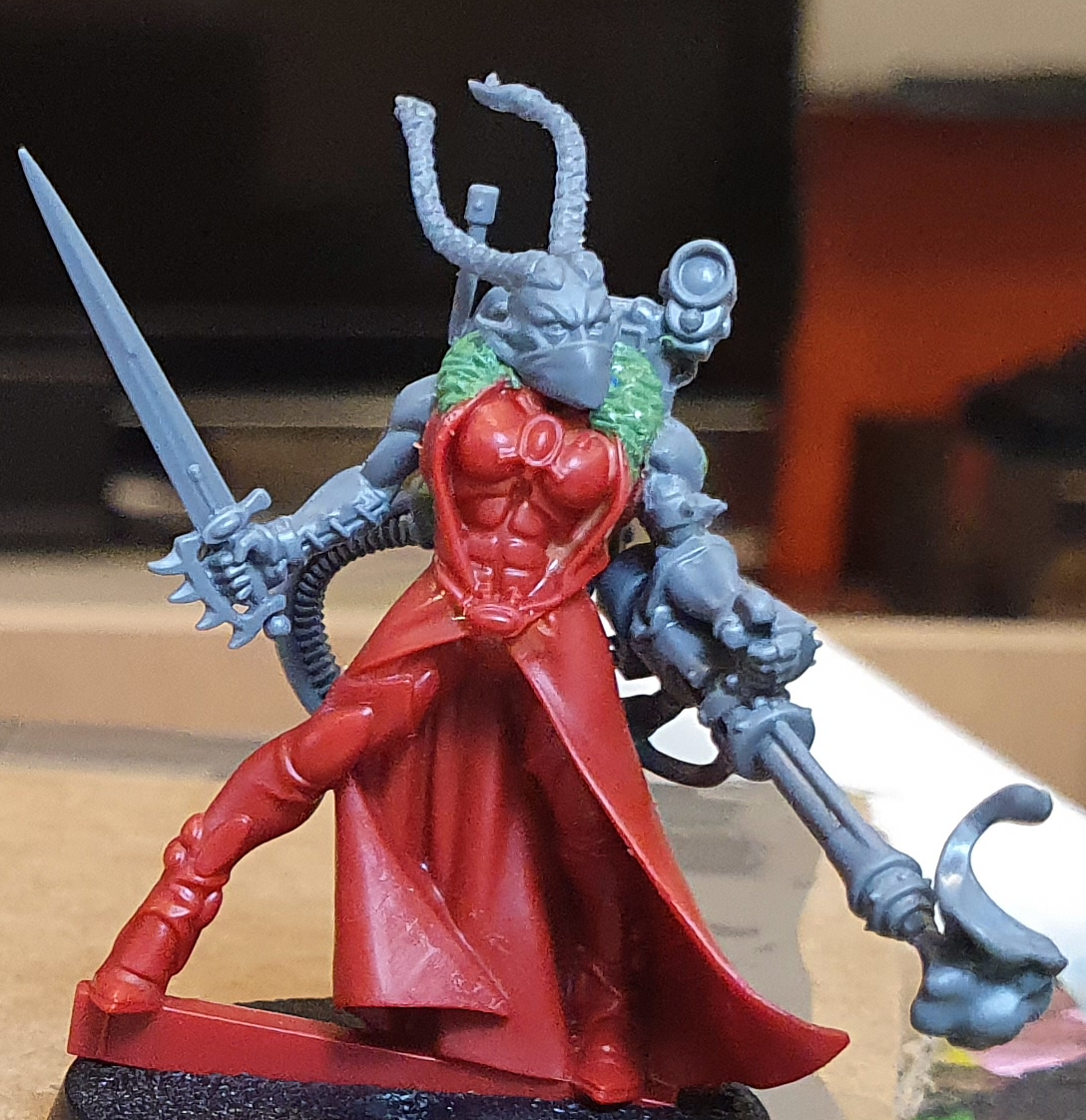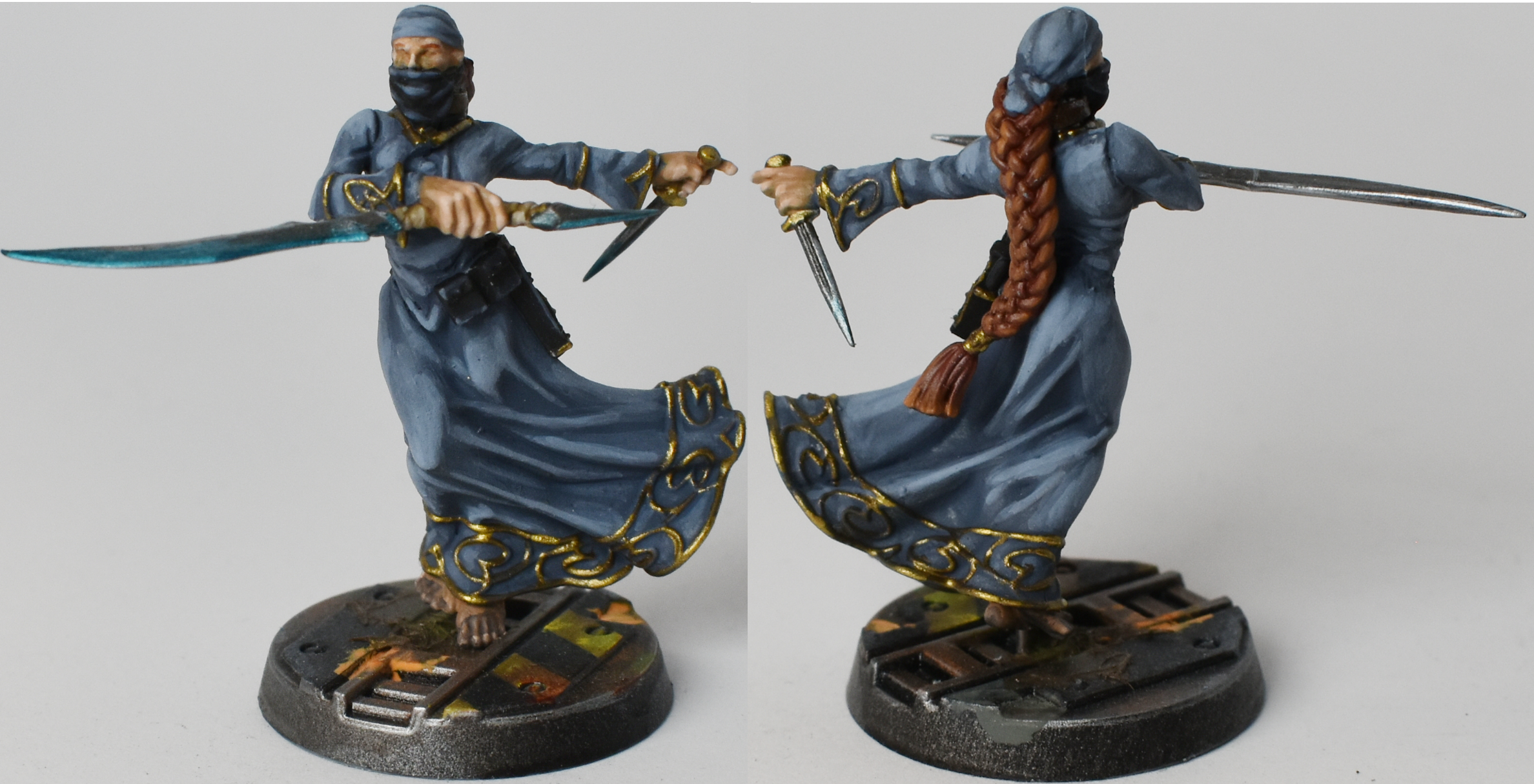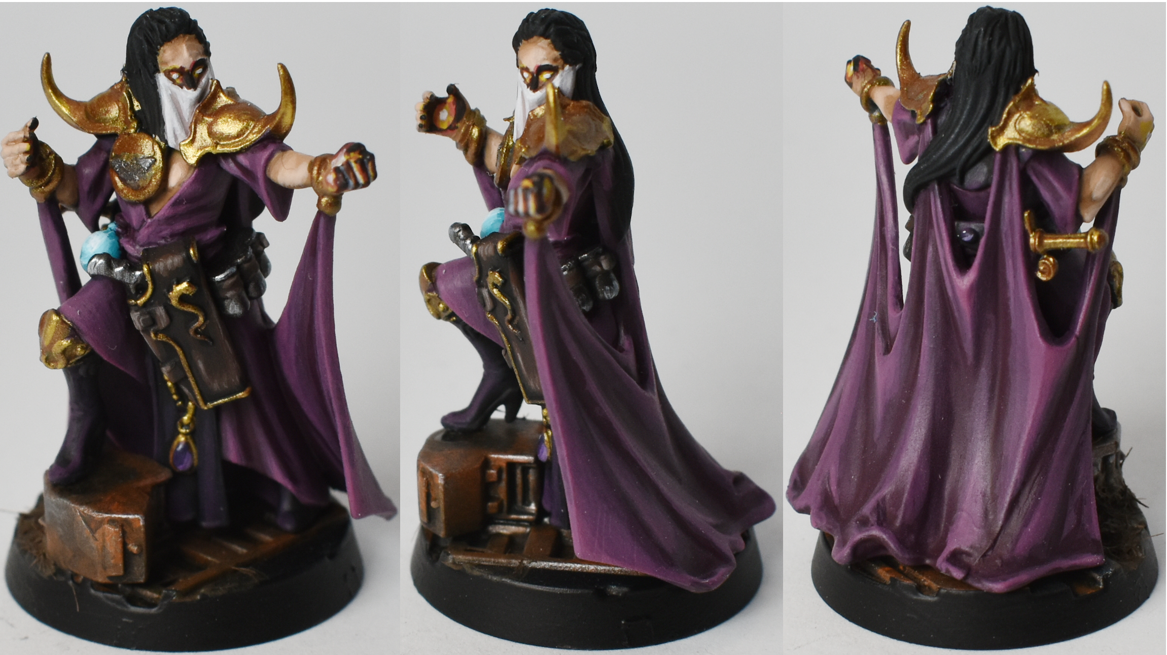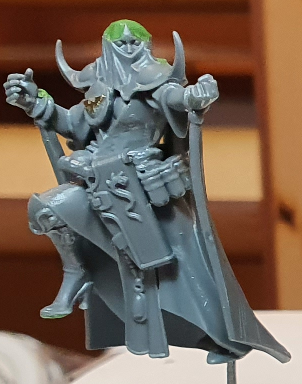 This model is the Lumineth wizard, from here i got into converting up AOS models just for the fun of it. i had envisaged a death cult assassin in the guise of a noble lady but when i saw the giant sword from the Dark Elf horse guys i had to give it to her, so not quite as subtle. I used the female catachan head and sculpted on the veil and added the hair from the wizard back in. i was going to try and paint her clothes as translucent but chose not to, but i liked painting her feet as dirty. I had to sculpt in the hole in her stomach from the odd elf thing she had but it worked out ok. Somehow i forgot to paint the rim of her base, but no one noticed.