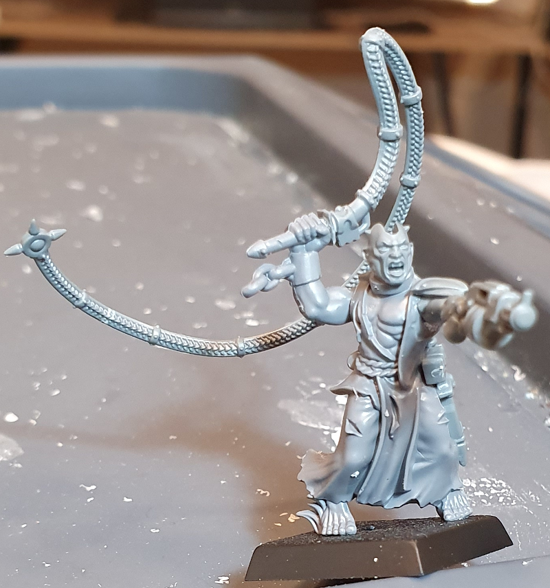 A WHFB flagellant with a goliath head, escher whip and gun and some pouches. At this point i could see the scale creep of the older models as he is quite short. not a huge issue as it makes them look more motley.