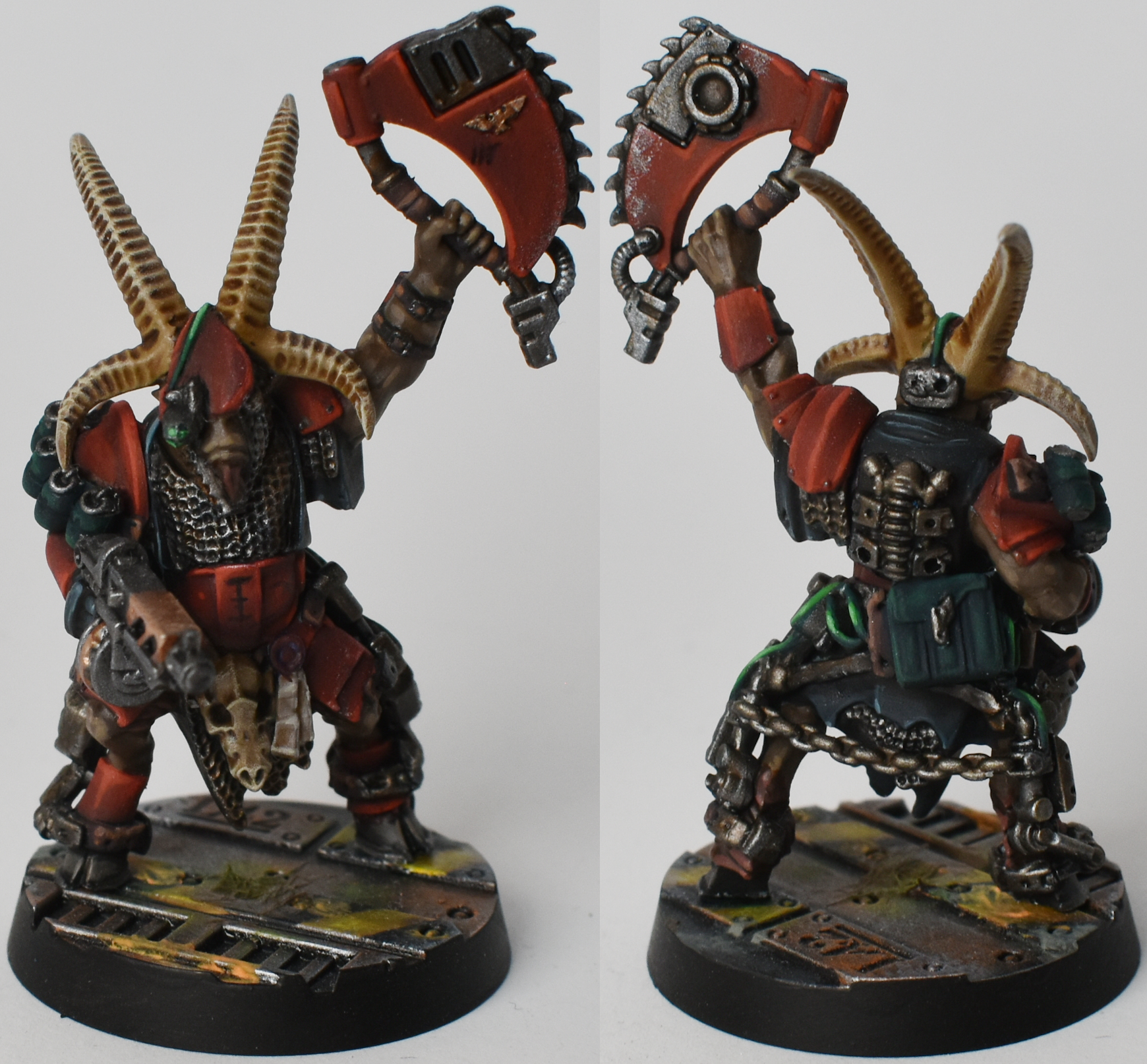 An Ordo Xenos who is not super straight and narrow would have some odd allies. I had these cool beastmen and had to use one. I sculpted on his head piece and eye and added a bunch of chains and exo skeleton stuff from the Orlocks to his back. i was going to keep his axe but changed my mind and went for one from the Corpse Grinders. His pistol is from the Goliaths and i added grenades and bits, and his axe got an eagle from some Forgeworld etched brass. This guy was actually part of my 2nd batch but i got the ordering wrong.