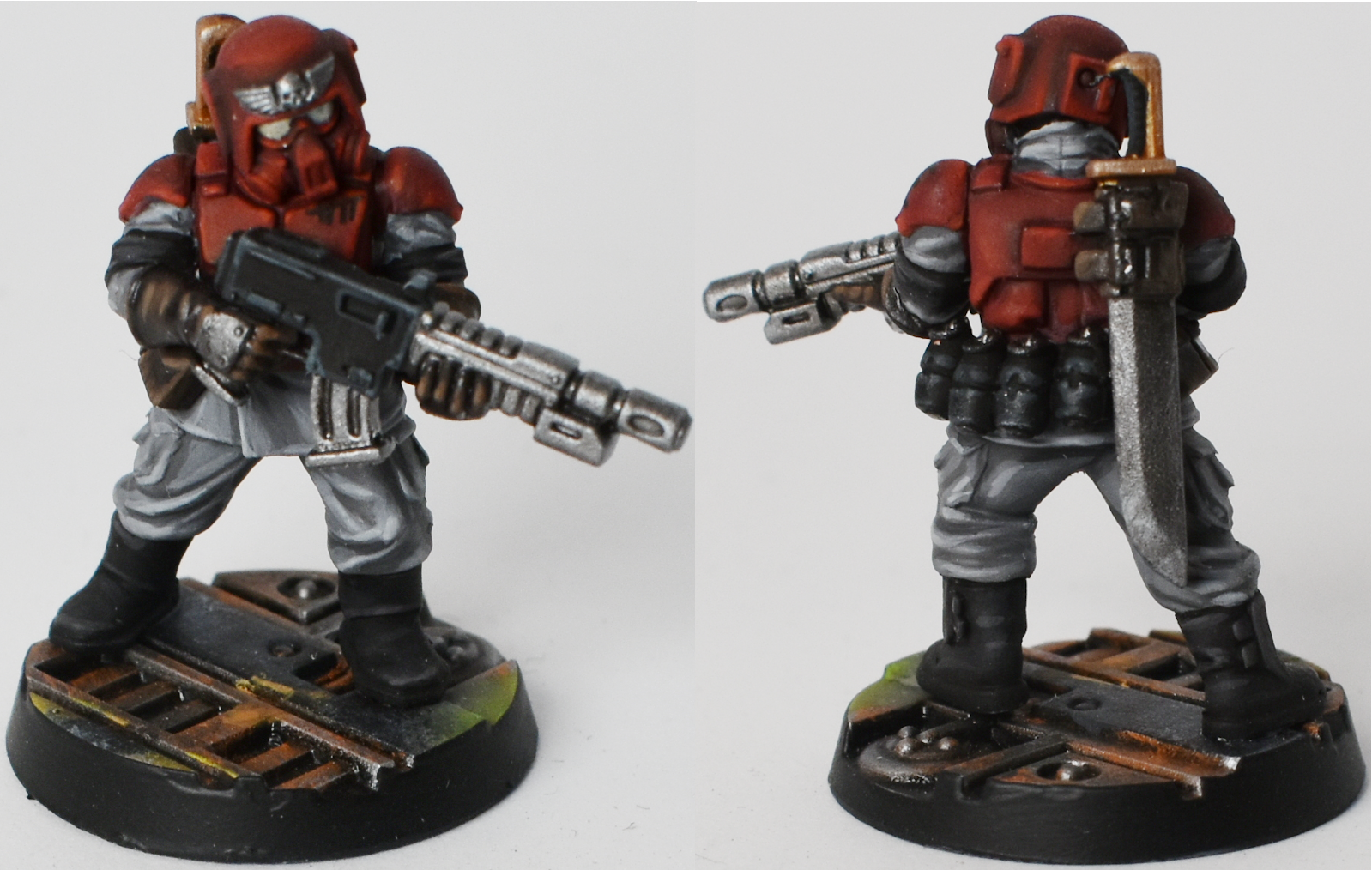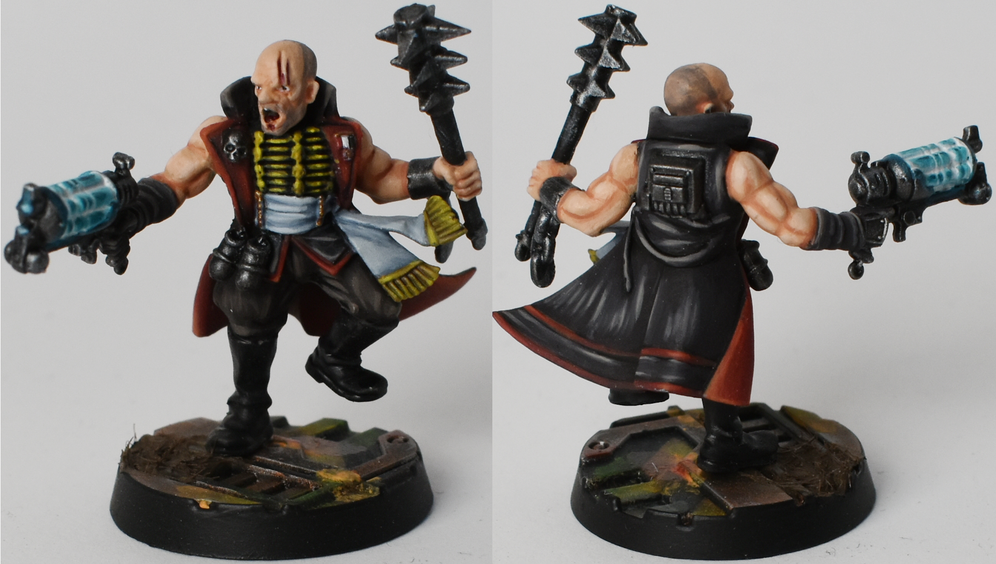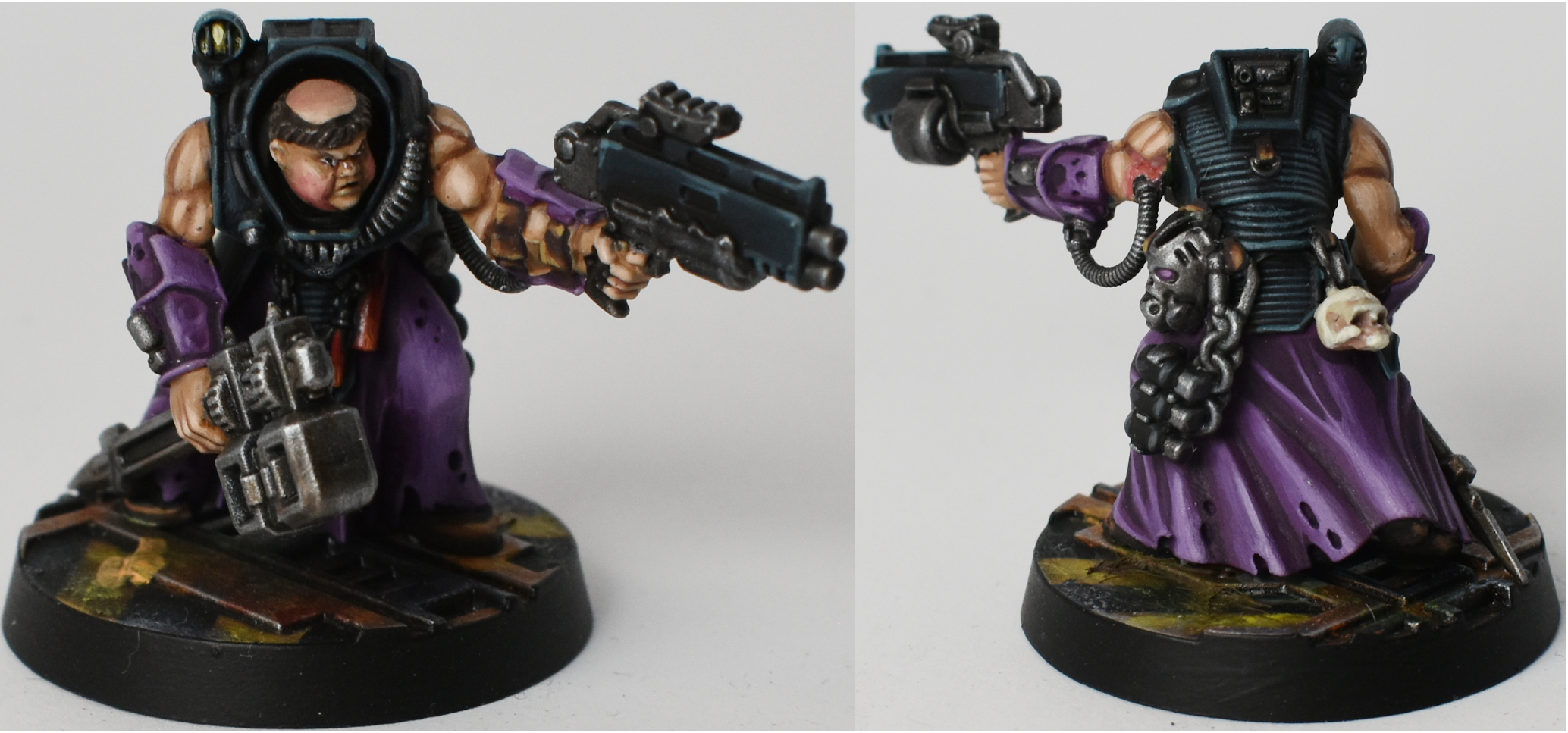 The heavy. he is an enforcer body, carefully converted to carry a Genestealer cult Stubber and backpack. I used a brettonian man at arms head and added some gubbins to him. simple conversion but he came out well.