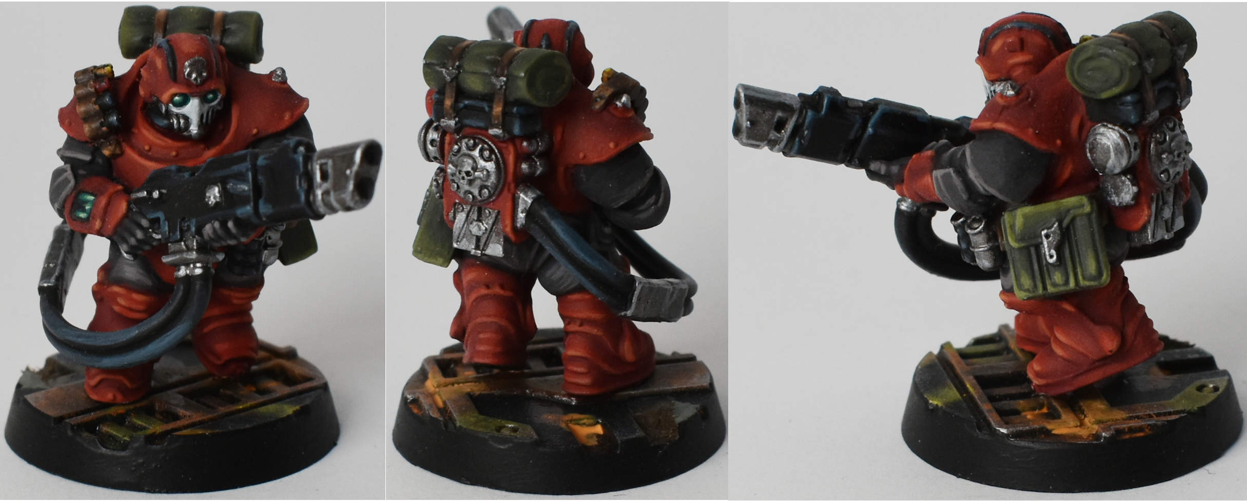 The leader and last of batch 1 (which were models 1-5, 8 and 9). I had this guy from a trademe deal and thought he would be cool converted. he got a Scion head, and a mechanicus gun arm and greenstuff to make it fit. the loin cloth to rough him up a bit.