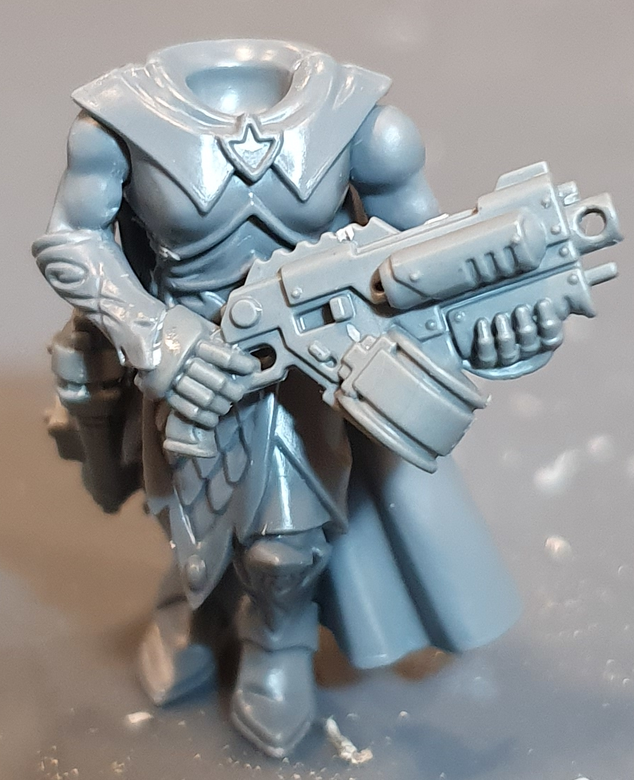 Ive always liked the gladeguard models, and so it was cool to use one. I used an enforcer bolter and had to sculpt it a bit to fit it with the small arms. the hardest bit was the face. its the hooded head from the elf but i carefully scraped out the face and then carved down an escher face to fit it in. I like the fact that you really cannot tell.