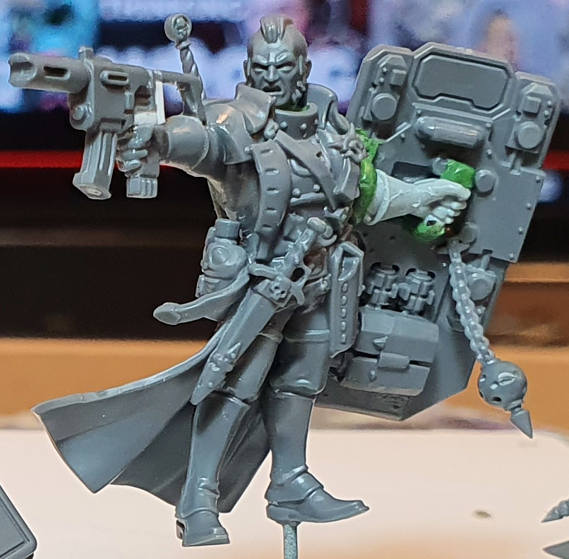 Really liked this model. its a Techpriest model. i gave him an Orlock powerfist and an enforcer arm and gun. the head - i added in an enforcer face mask and sculpted the hood forward to cover it. again i like it because it looks like its meant to look like that.