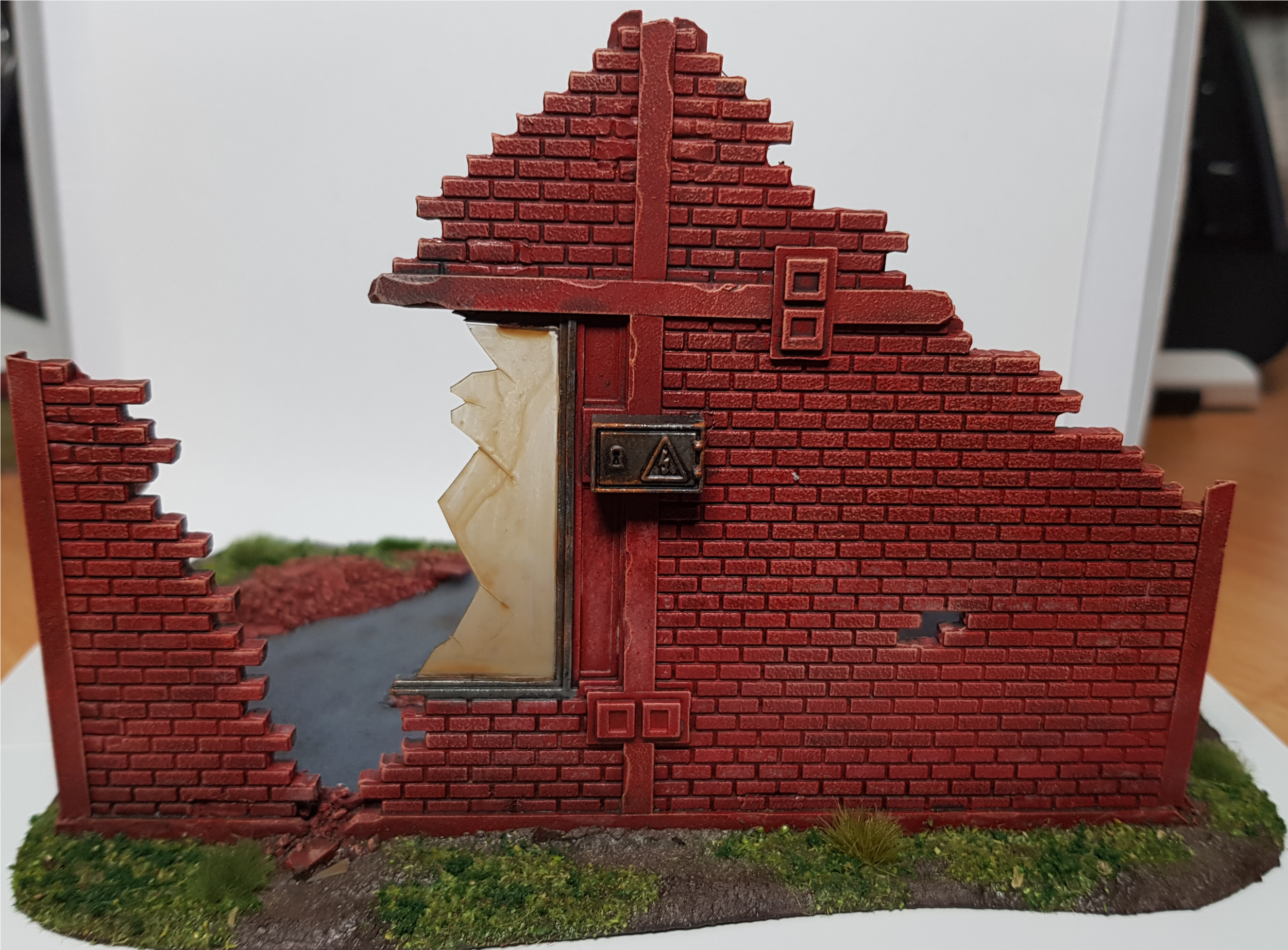 So as per his plans i greenstuff molded the holes in the walls and i did the plastic card on the gaps, but went further and did a bit more coverage. I sprayed with Dragon red spray and inked Agrax. i then drybrushed it with Astorath Red, then with Tyrant skull, then a bit with Cadian Flesh.