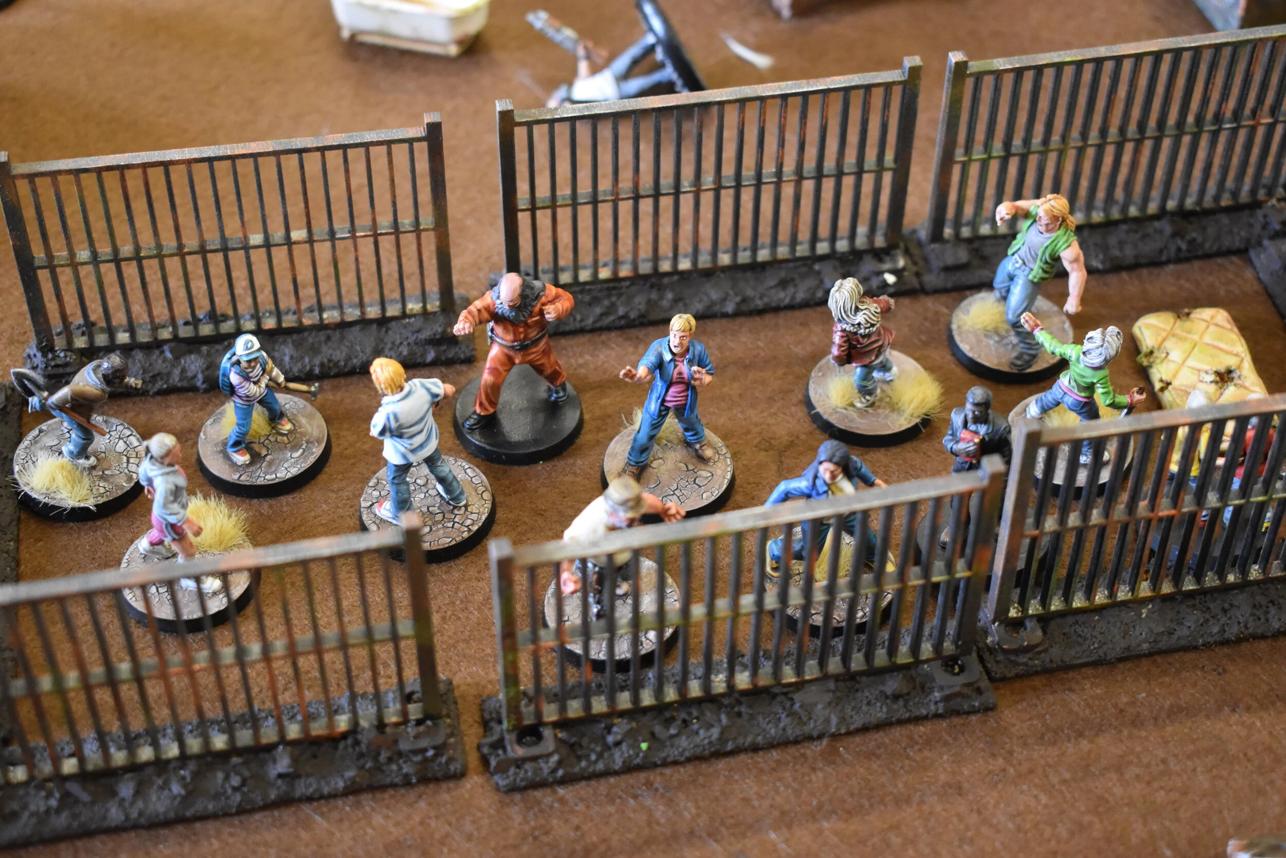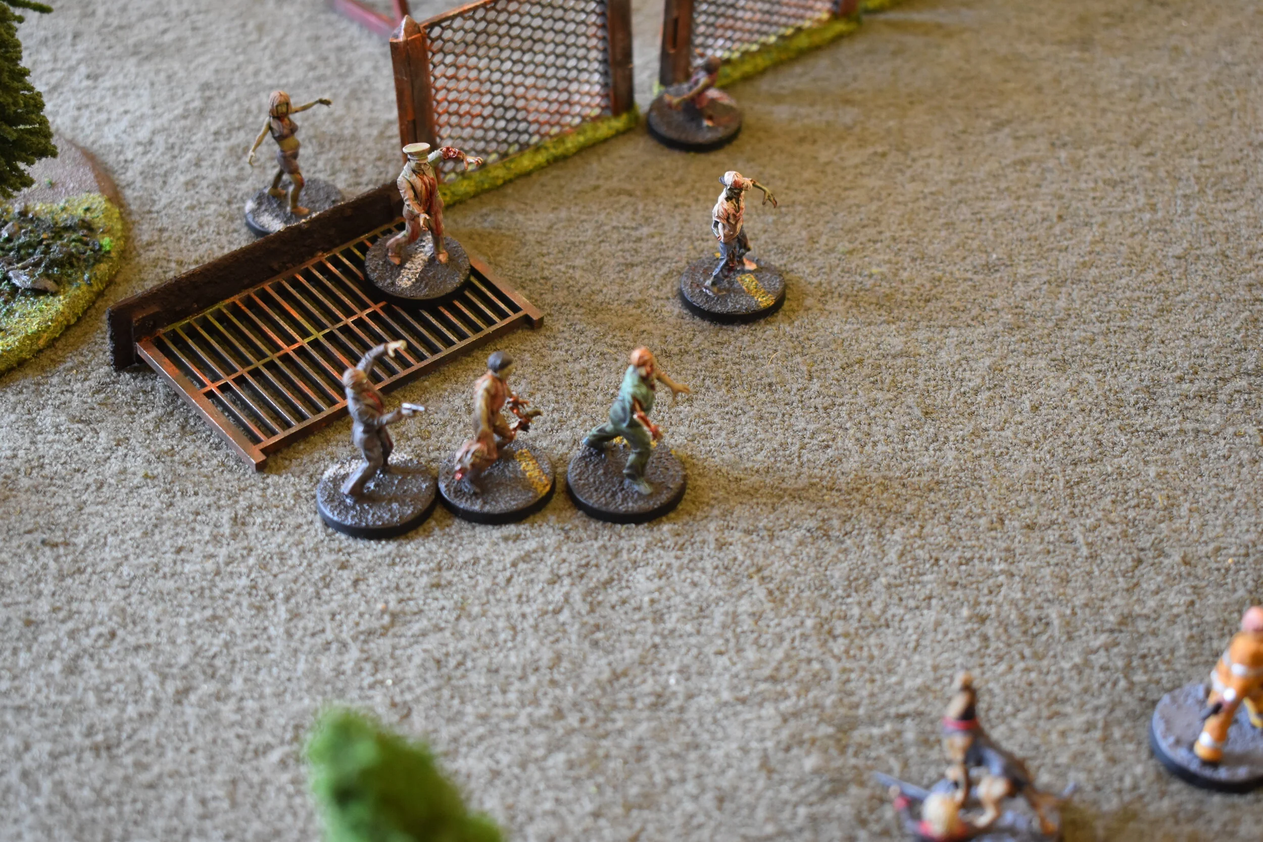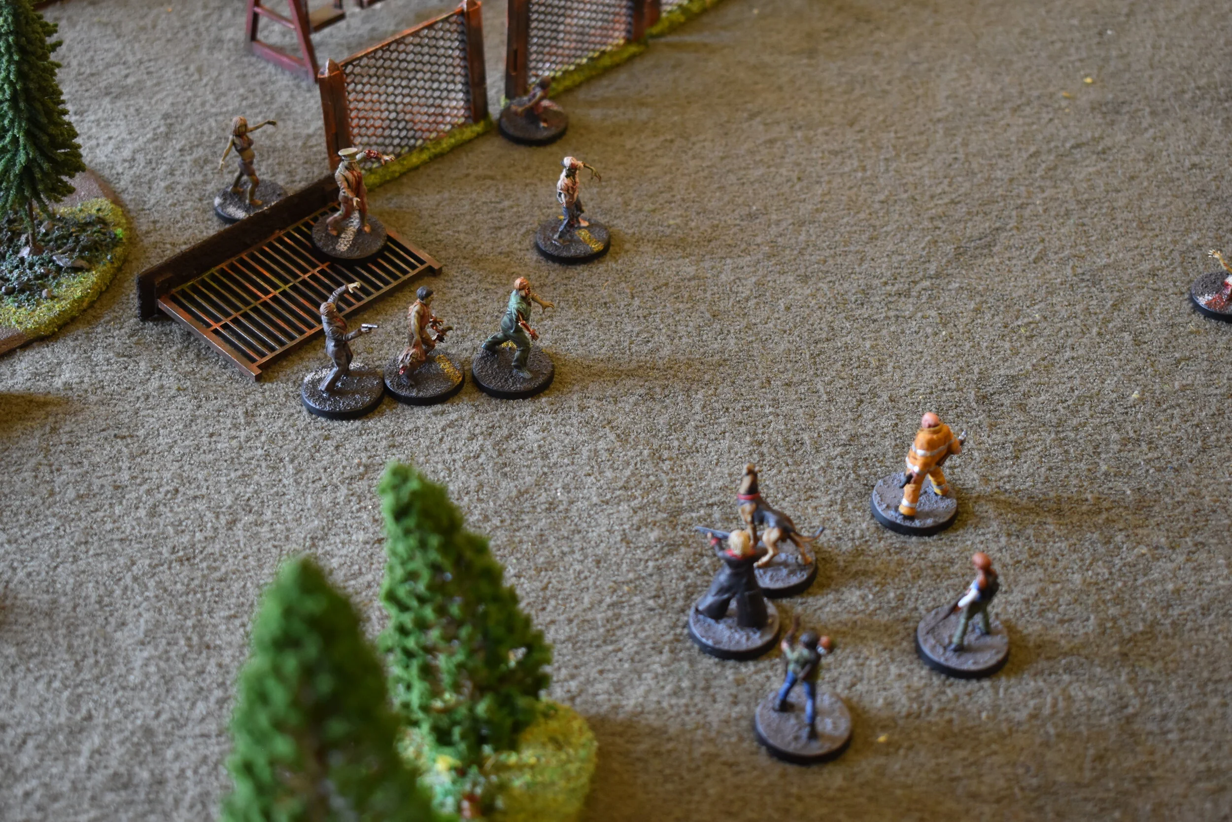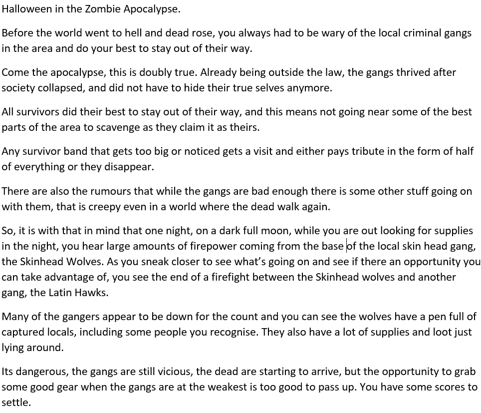 The game went well, and went in a direction i did not expect. the two NPC gangs tore themselves apart and then turned on the players. Richard discovered the big secret in the barn, which is that there were butchering and eating people (hence the prisoners), this became clearer when they all turned into werewolves a couple turns later. John lost a couple of people to werewolves during the game, but Richard got away clean. both players looted the pickup trucks the latino gang had used to get to the game, and buggered off with the gear.