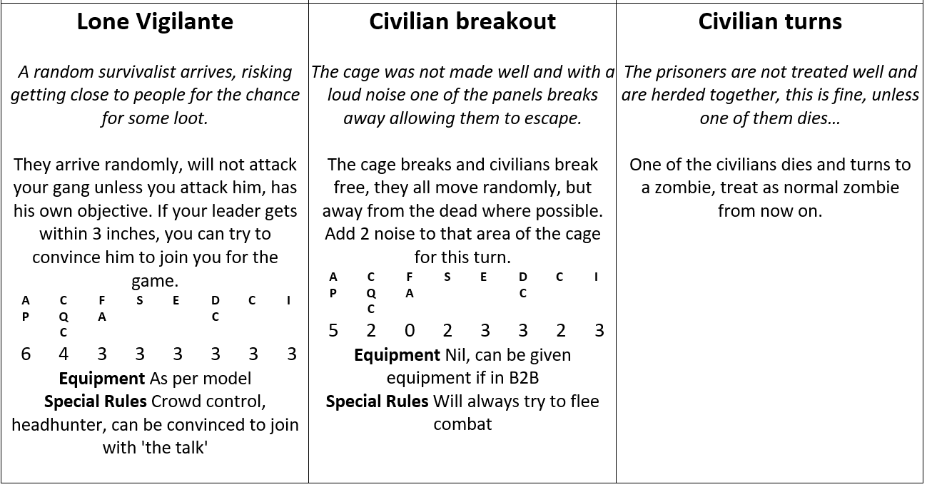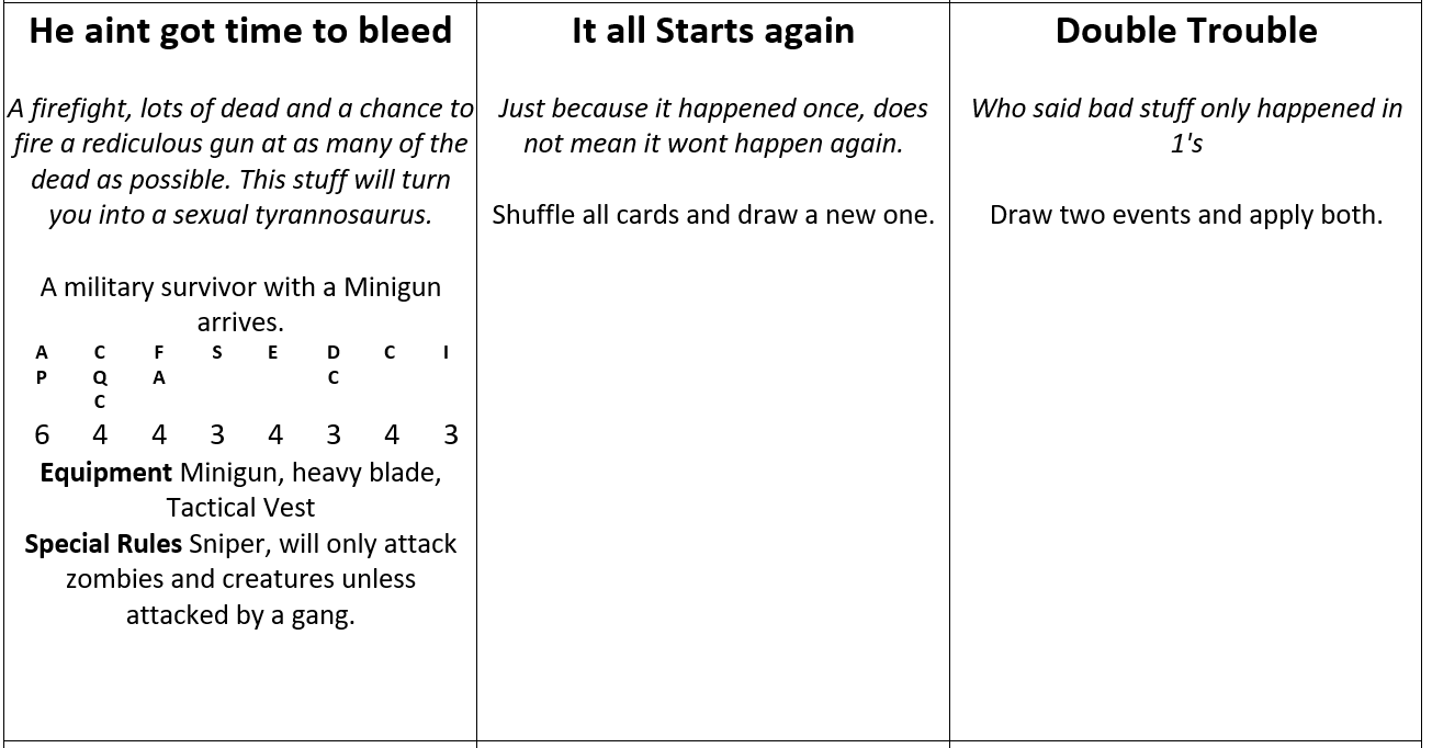 I also like the idea of random events, so i decided i wanted to incorporate some that gave me an opportunity to paint up some other models so they could arrive as random events. I was inspired by some from TWD All out war, and made my own, to use the terrain i had, and models.