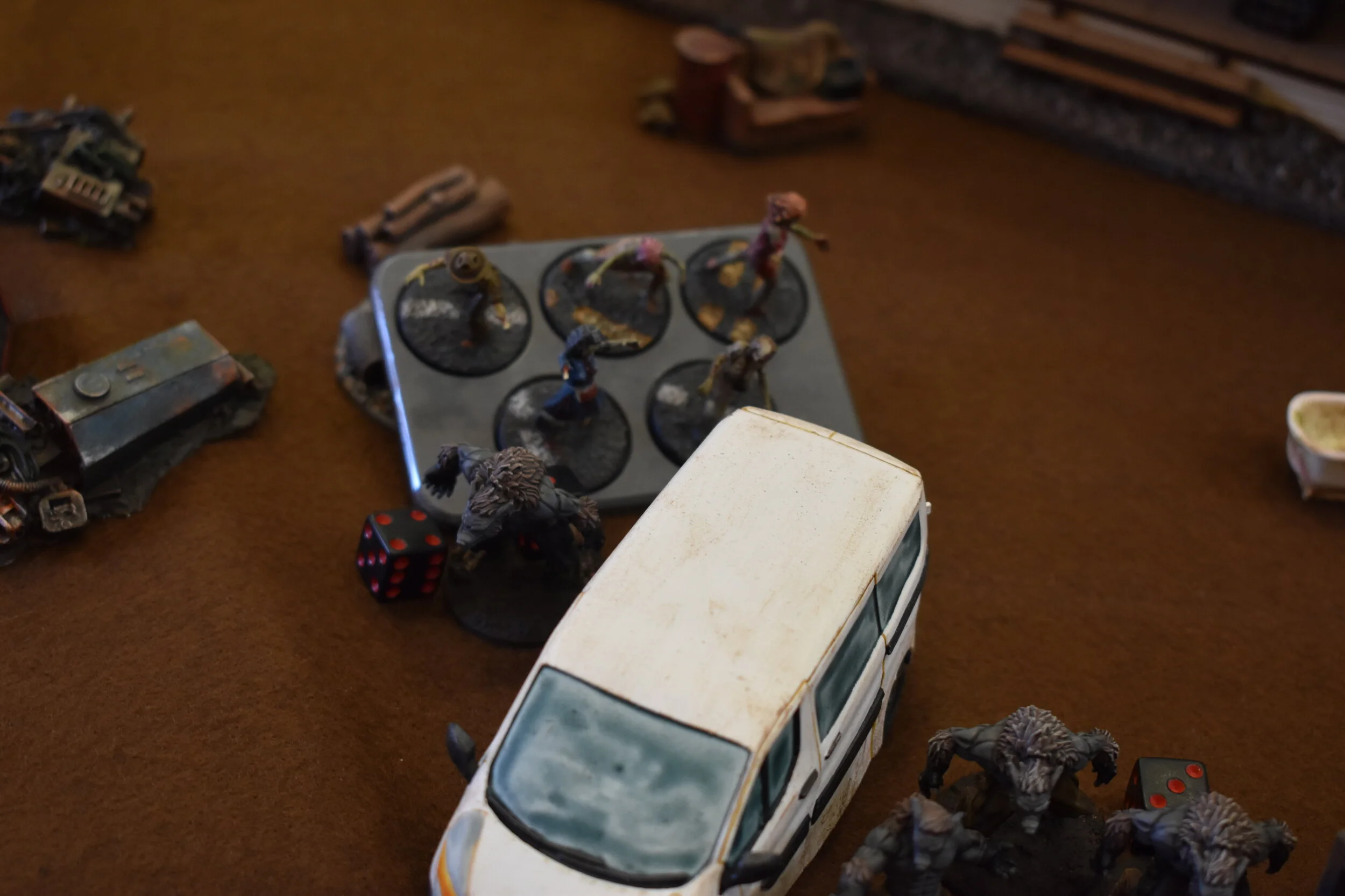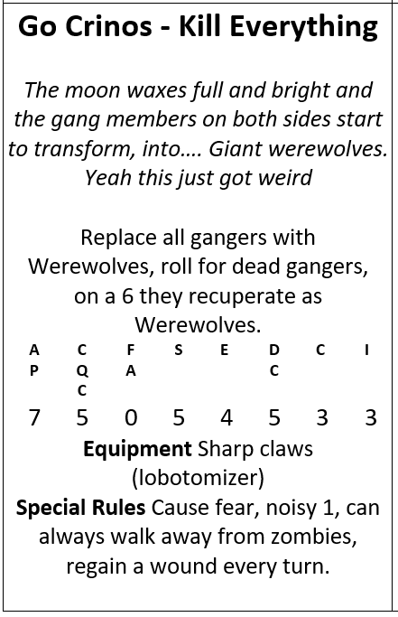 the trick was, that at some point during the game, the gangs turned into Werewolves, oh and i did not tell the players, all they knew was that some of the ‘dead’ gangers got back up during the game ( i had to add this in as they were dying way too fast). Richards comment when this happened, was “well fuck”! thought that was the right result. I made sure that event was only going happen between turns 6-10, so even i was not 100% sure when.