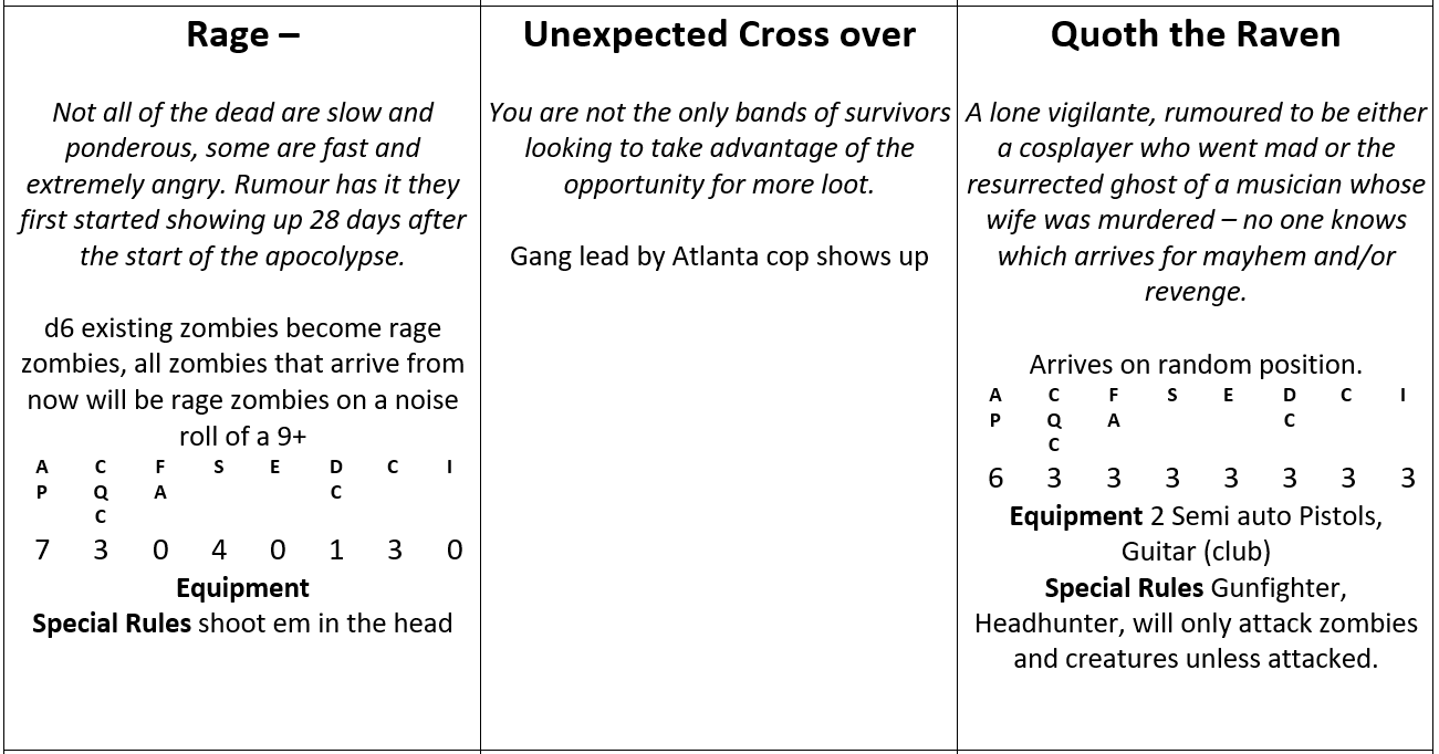 i had way too many random events so most did not show up and many had minor impact. The Crow showed up as did Ricks gang (but they got bogged down by zombies), and we had a herd. i was hoping for rage zombies but oh well. more for next time.