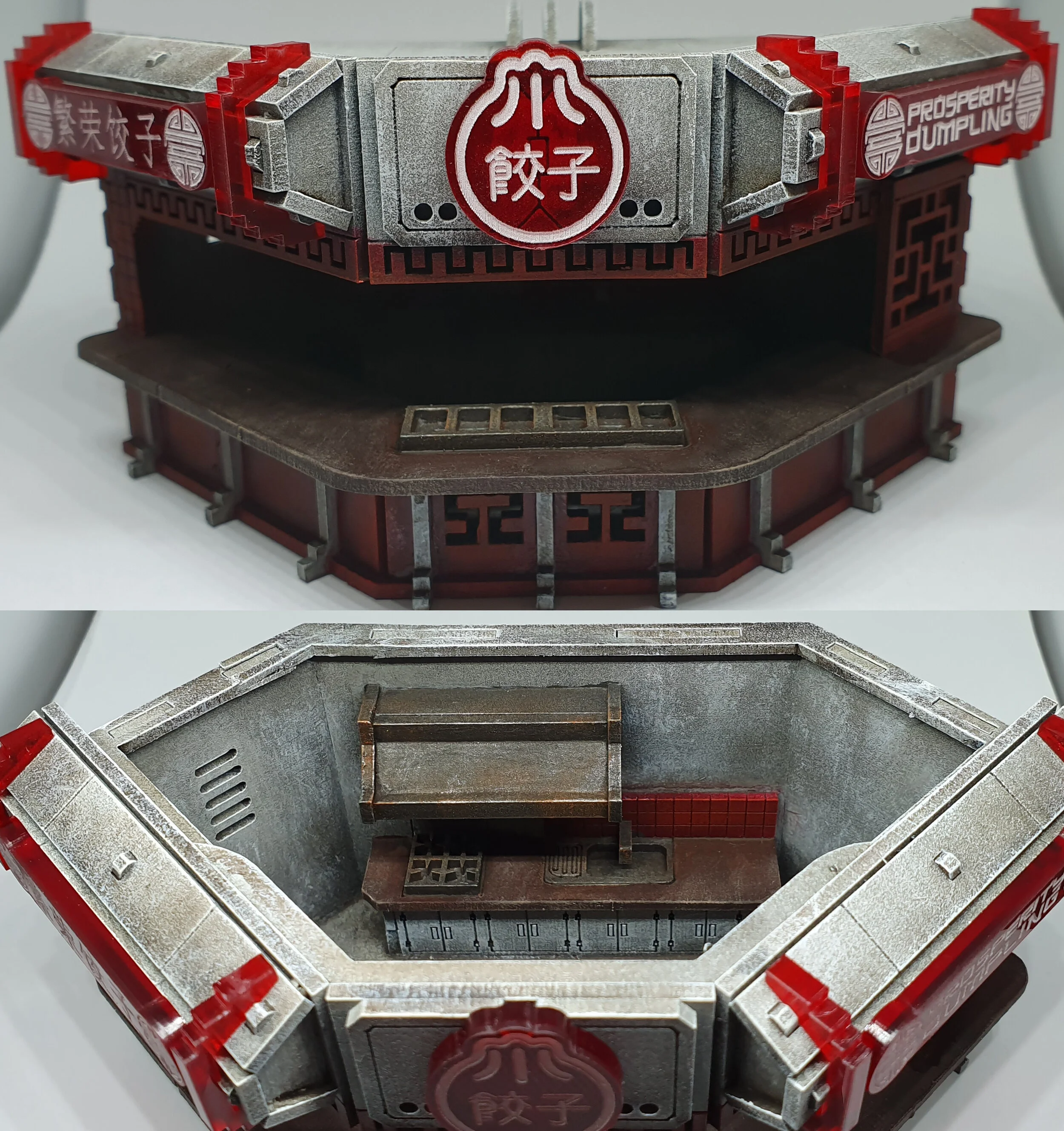 Foodcourt - this is an awesome set of kits from Knights of Dice. they assembled really well (though i screwed up with the panels on the red one, as i did not realise they were not interchangeable), and this was a blessing as i next tried to do the TT Combat comms tower (a total pig). i like how they are basically the same, but the small differences in trim and the perspex makes them unique. Instructions were easy to follow, and the pieces want to fit together. the only change i made was to trim the bottom lugs on the 3 fins at the top of the lid smaller so it fits in easier, but thats nothing.