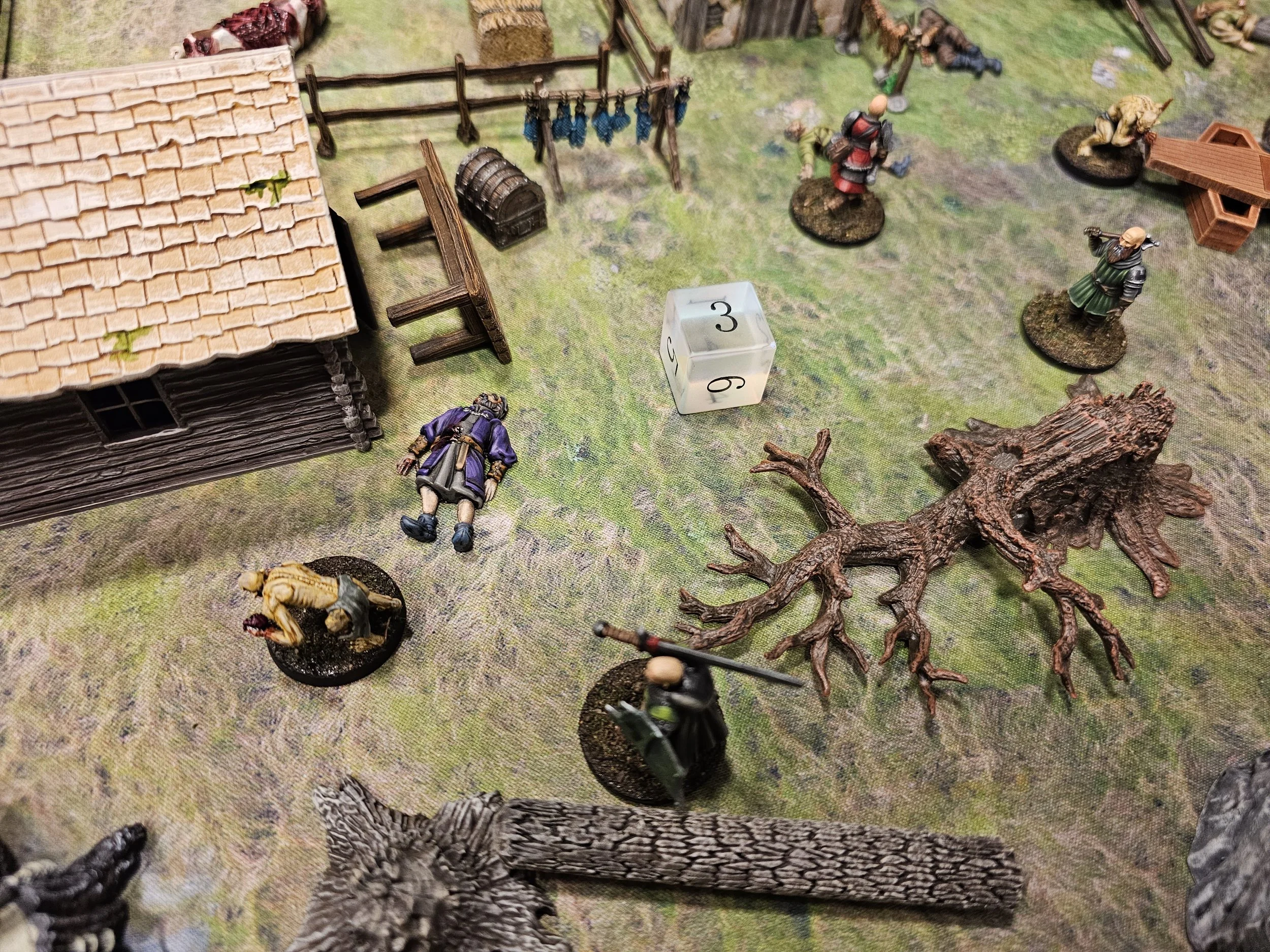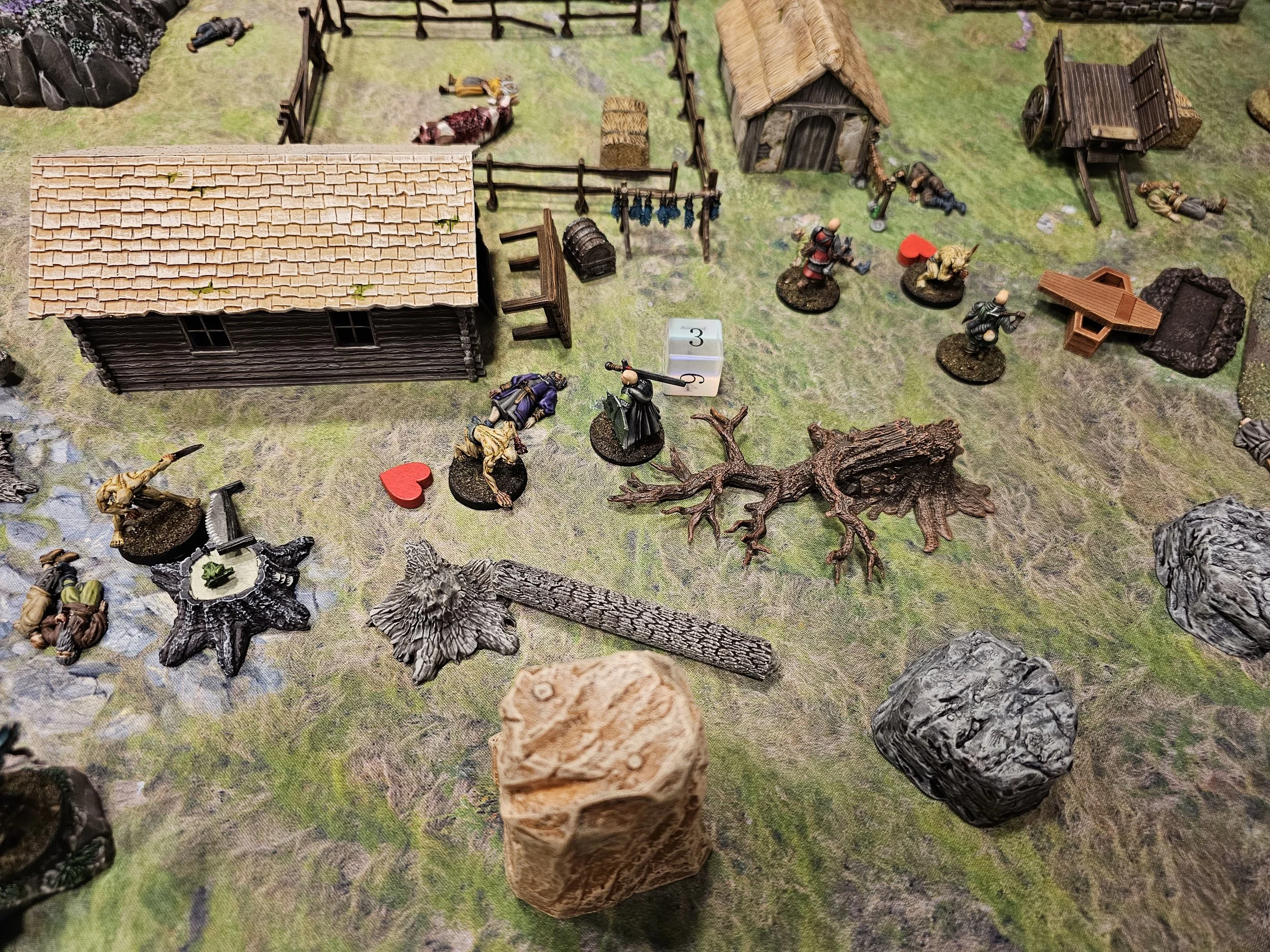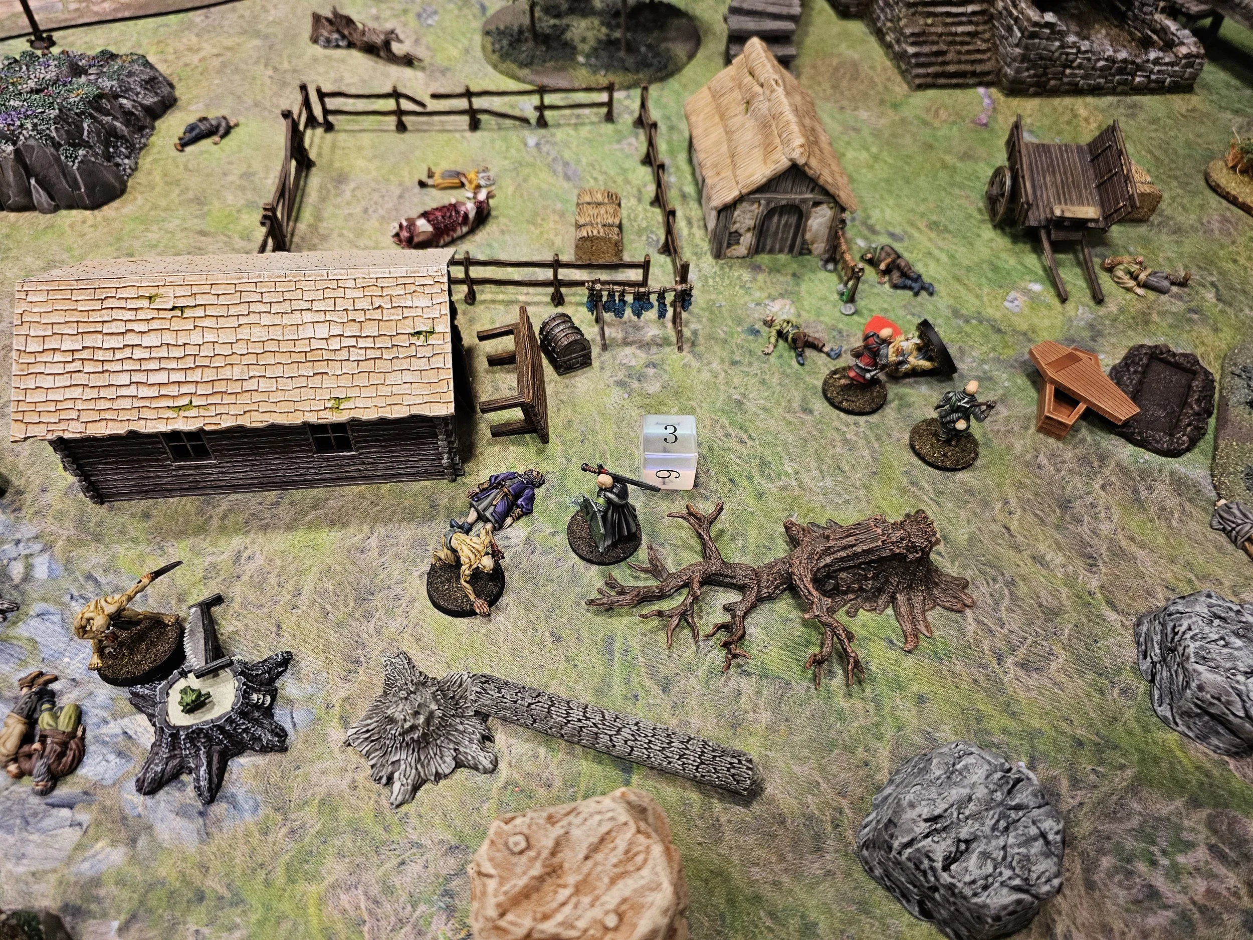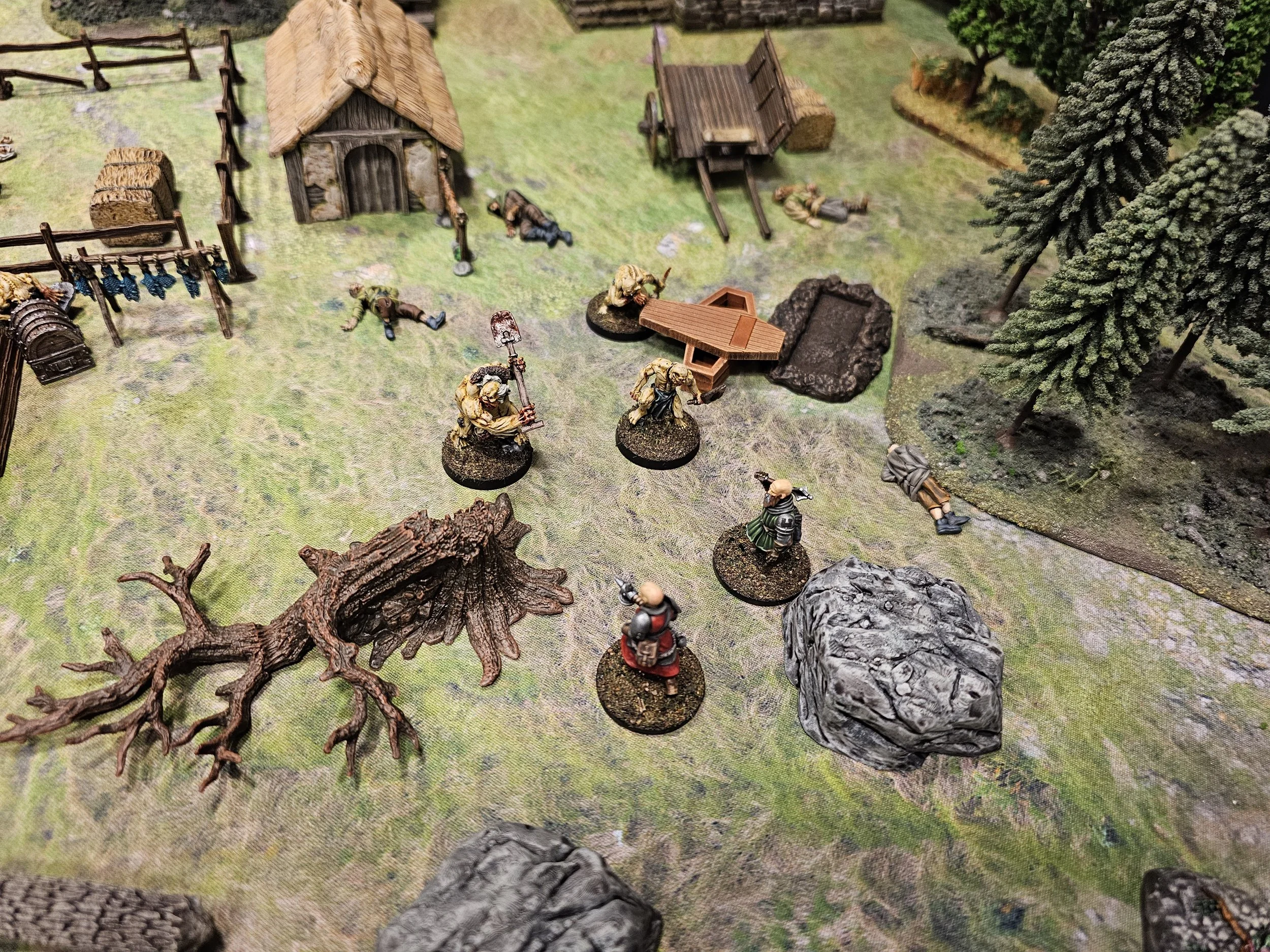 Mission details: Contract from villagers to investigate the Kettleford Farm family's prolonged absence from market. Deployment began in sneak-up phase with crew starting one inch from table edge. Objective was to investigate the farm and deal with discovered threats.