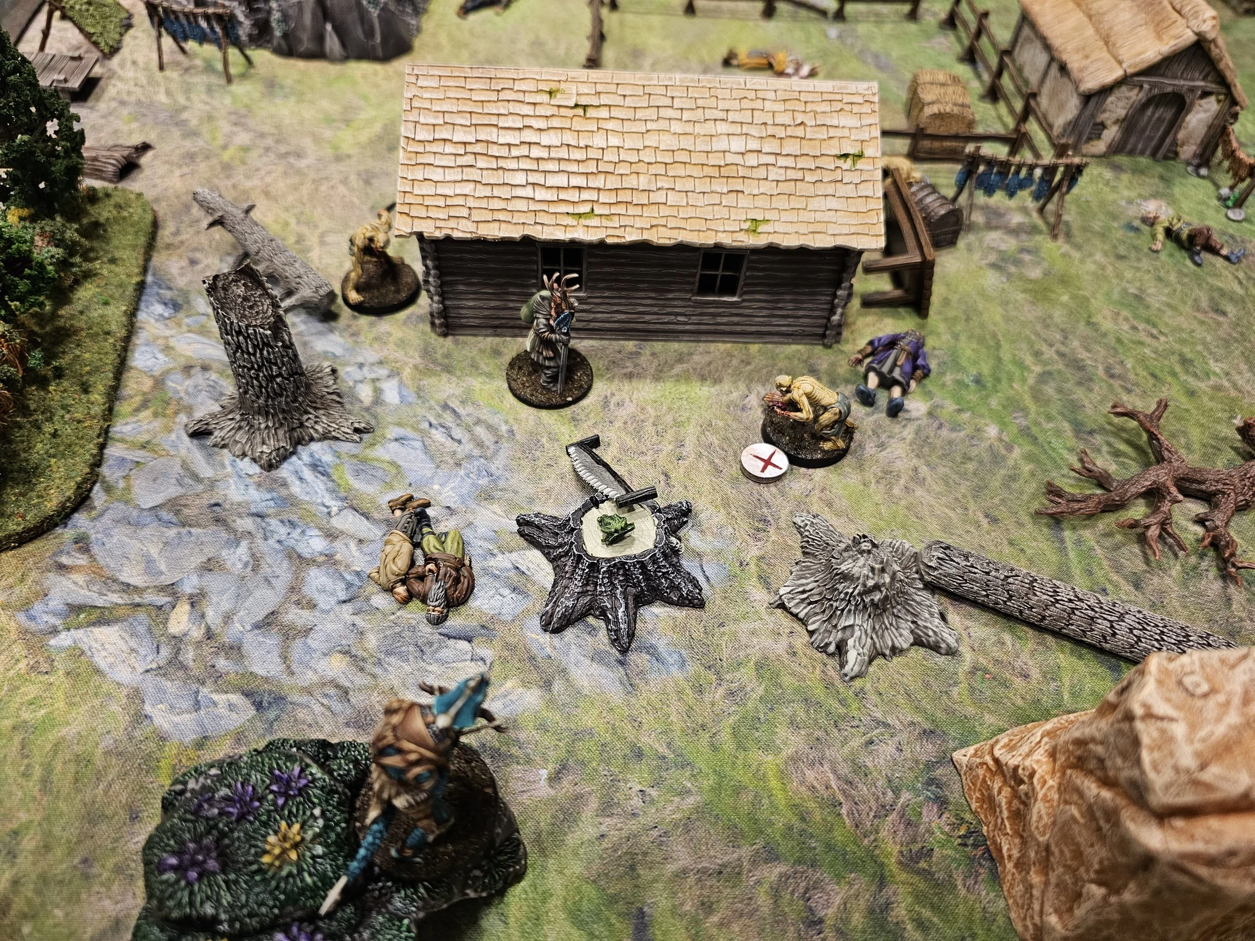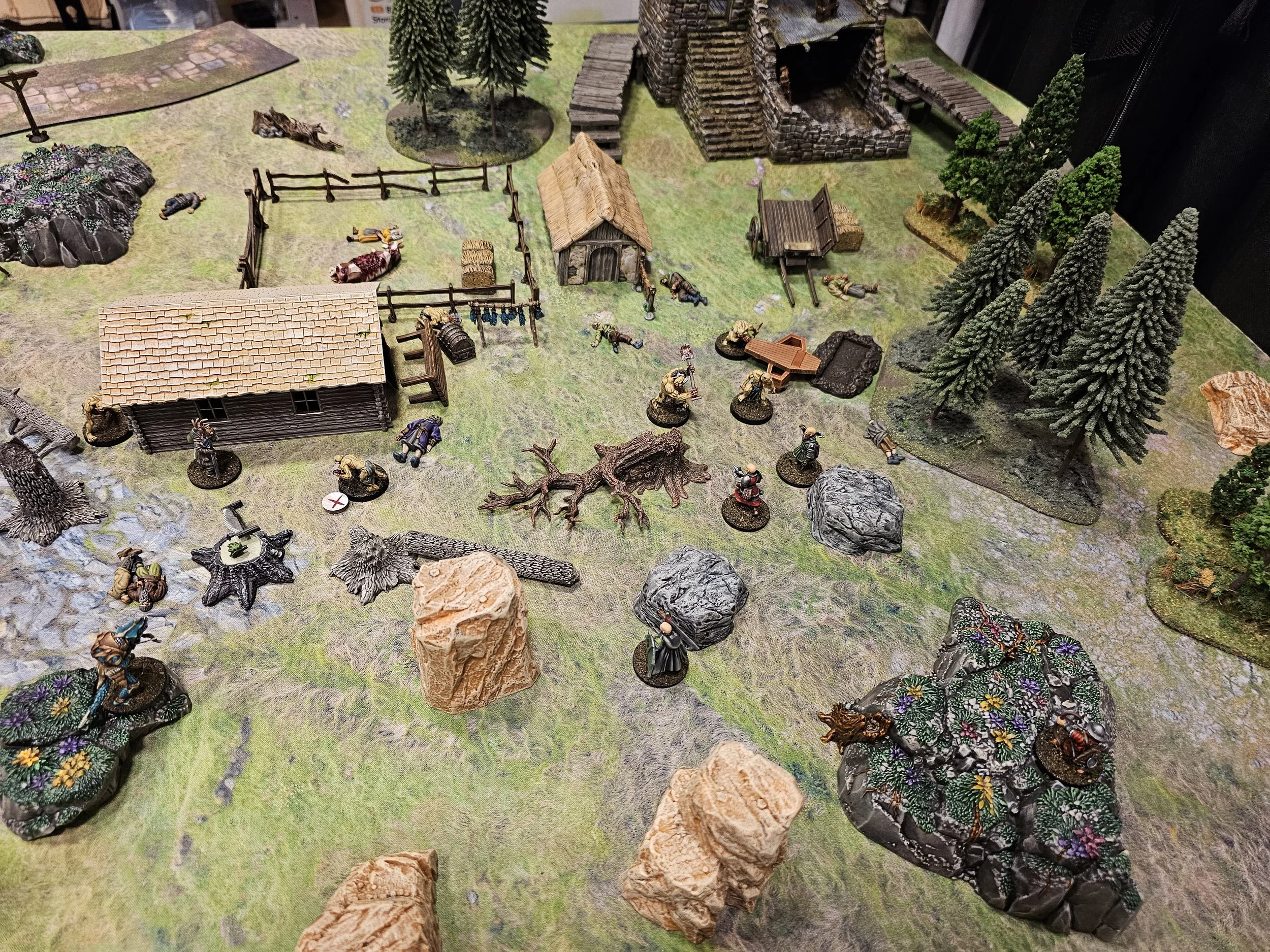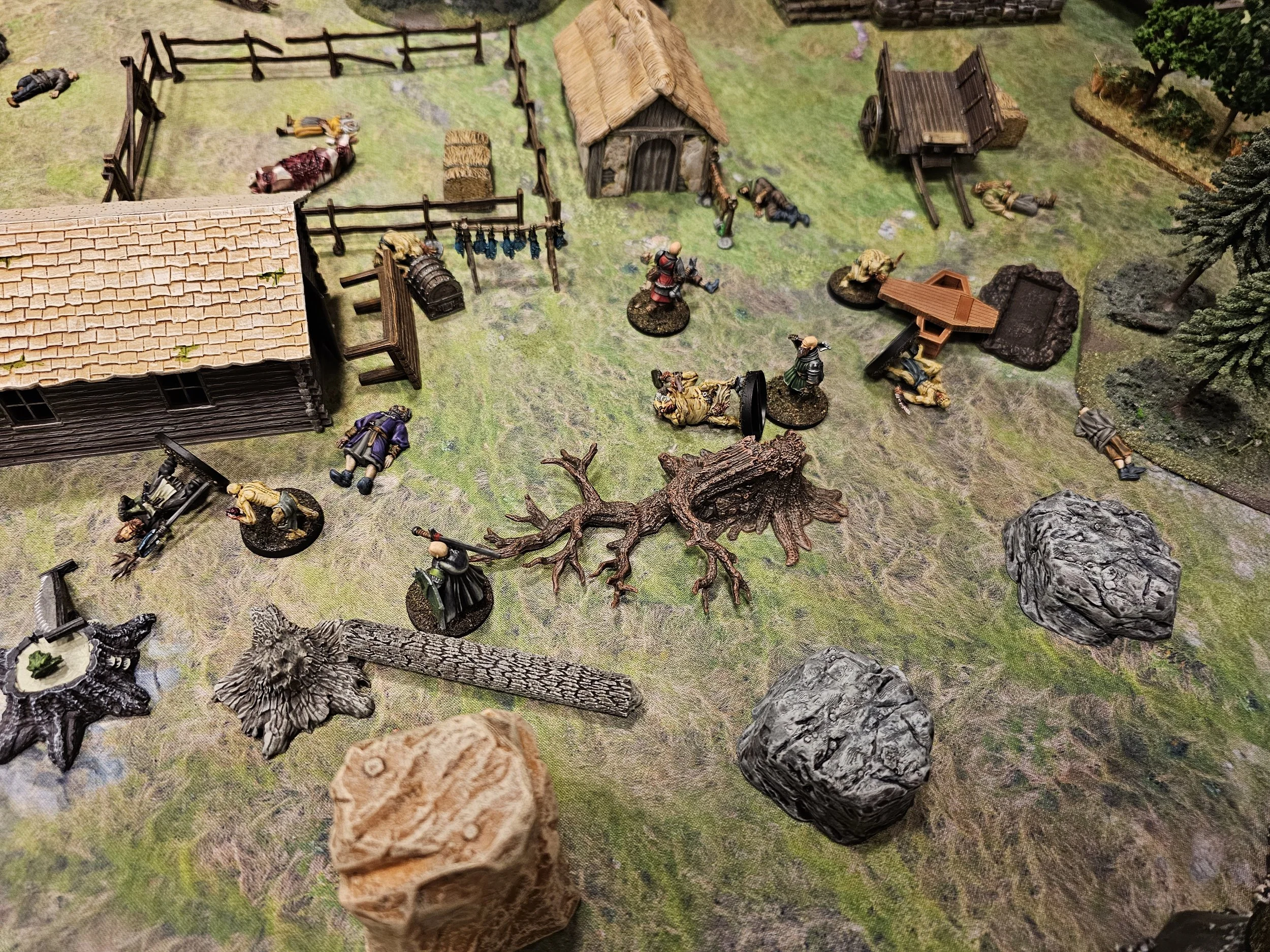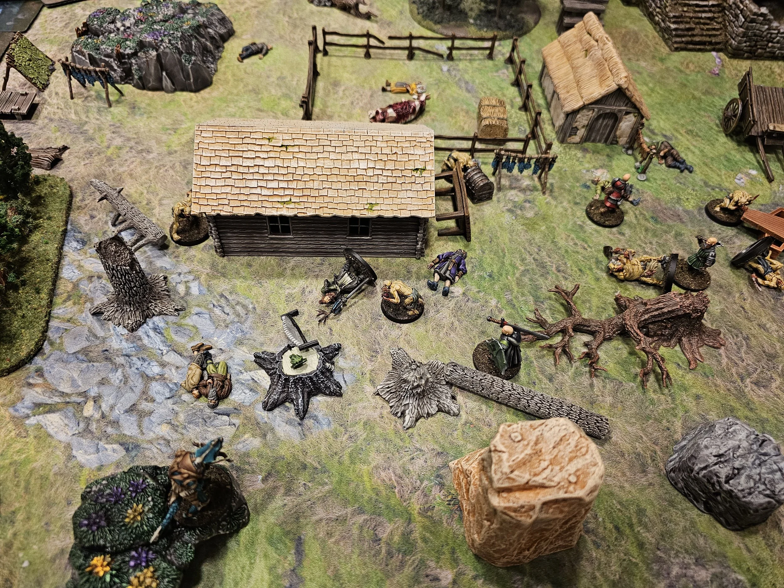 Mission details: Contract from villagers to investigate the Kettleford Farm family's prolonged absence from market. Deployment began in sneak-up phase with crew starting one inch from table edge. Objective was to investigate the farm and deal with discovered threats.