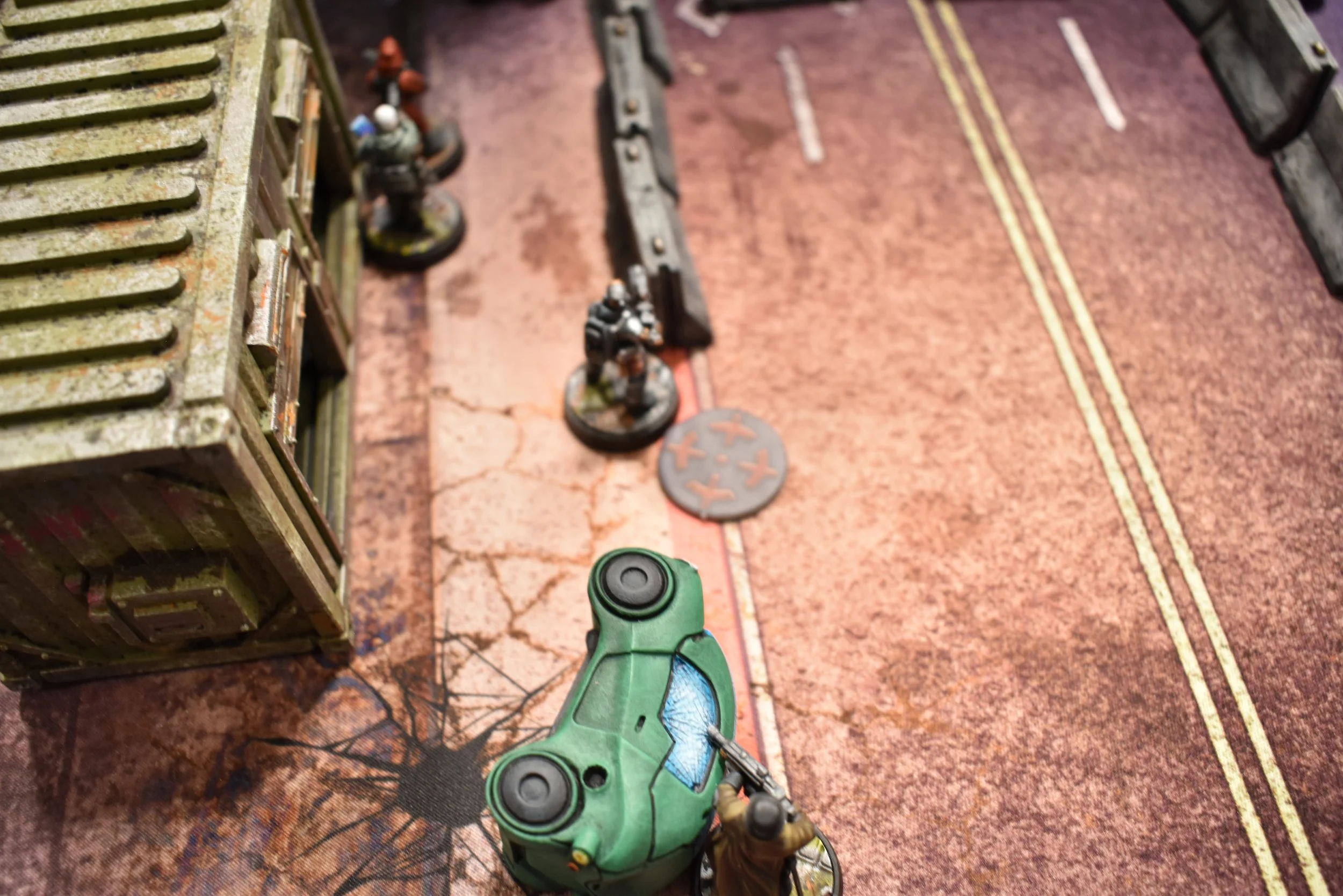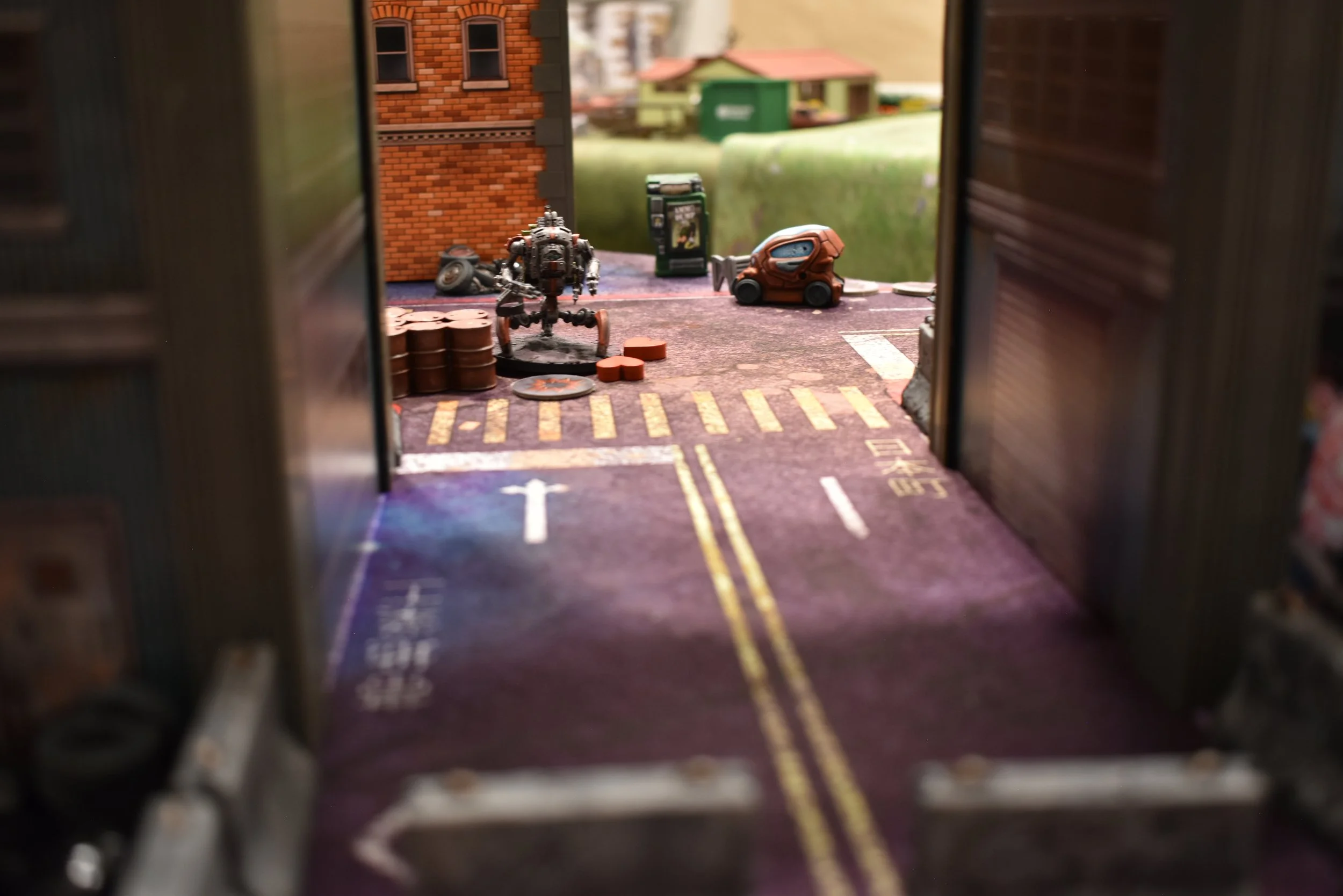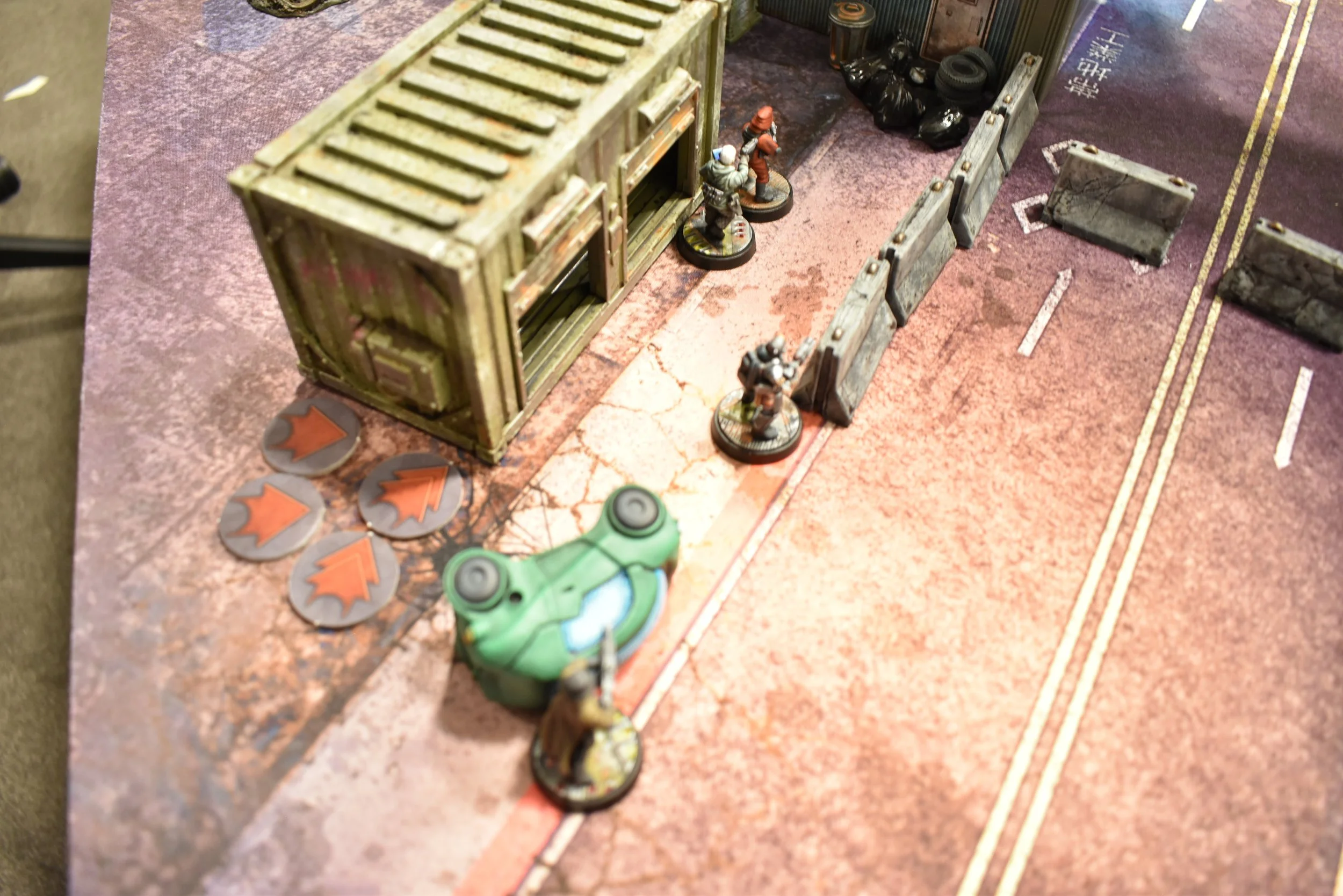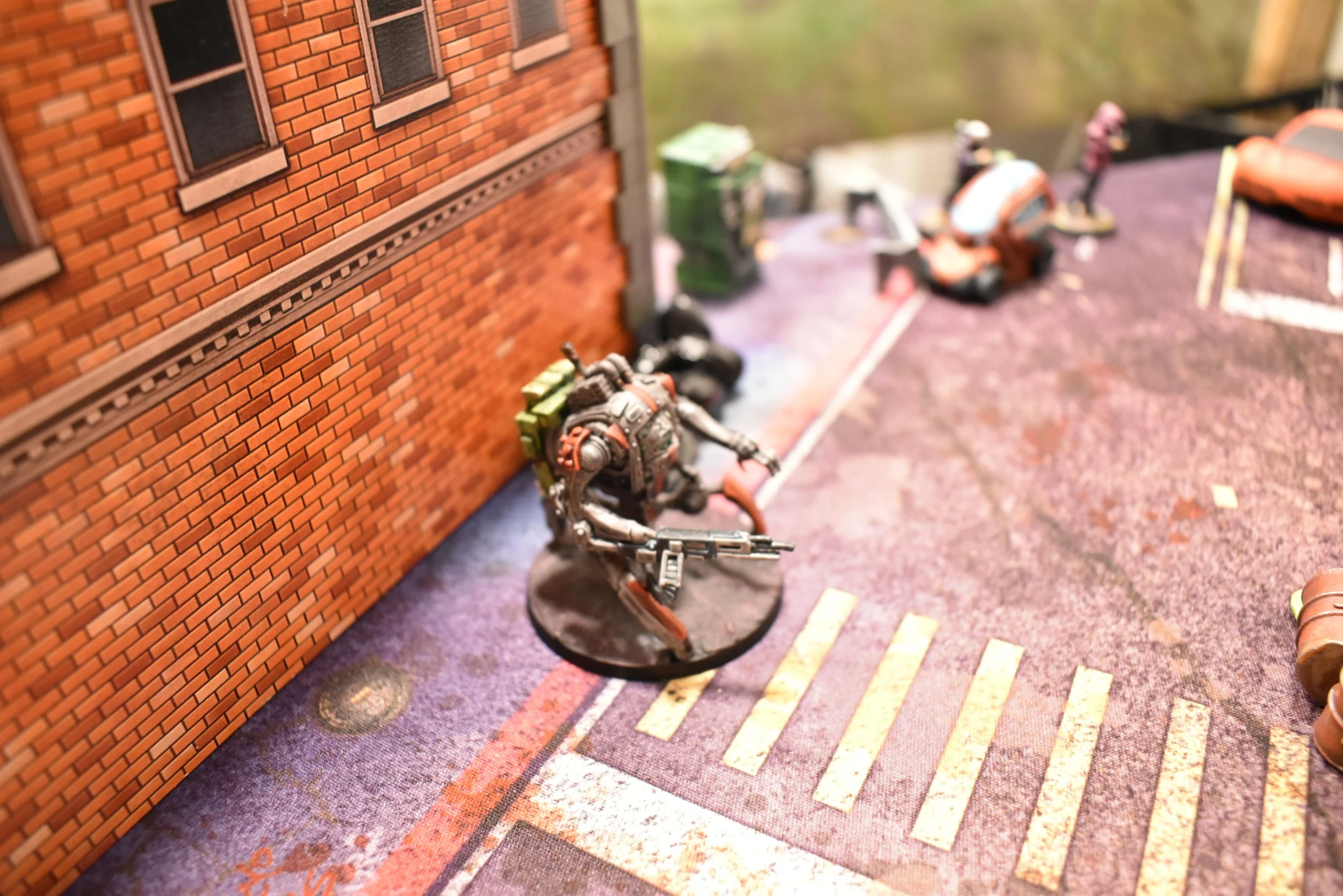 Slow Phase: The crew moved forward tactically. Krag and Rin ran across behind cover underneath a building on the right flank. Cade moved up behind the direct cars in the middle. XF2 moved behind a barricade while Mira and Jurgen advanced up the centre. XF2 took a shot at the Security Bot, scoring a hit but no damage, applying one stun. Cade followed up with his auto rifle, also hitting but causing no damage, leaving the bot with multiple stuns but still functional.
