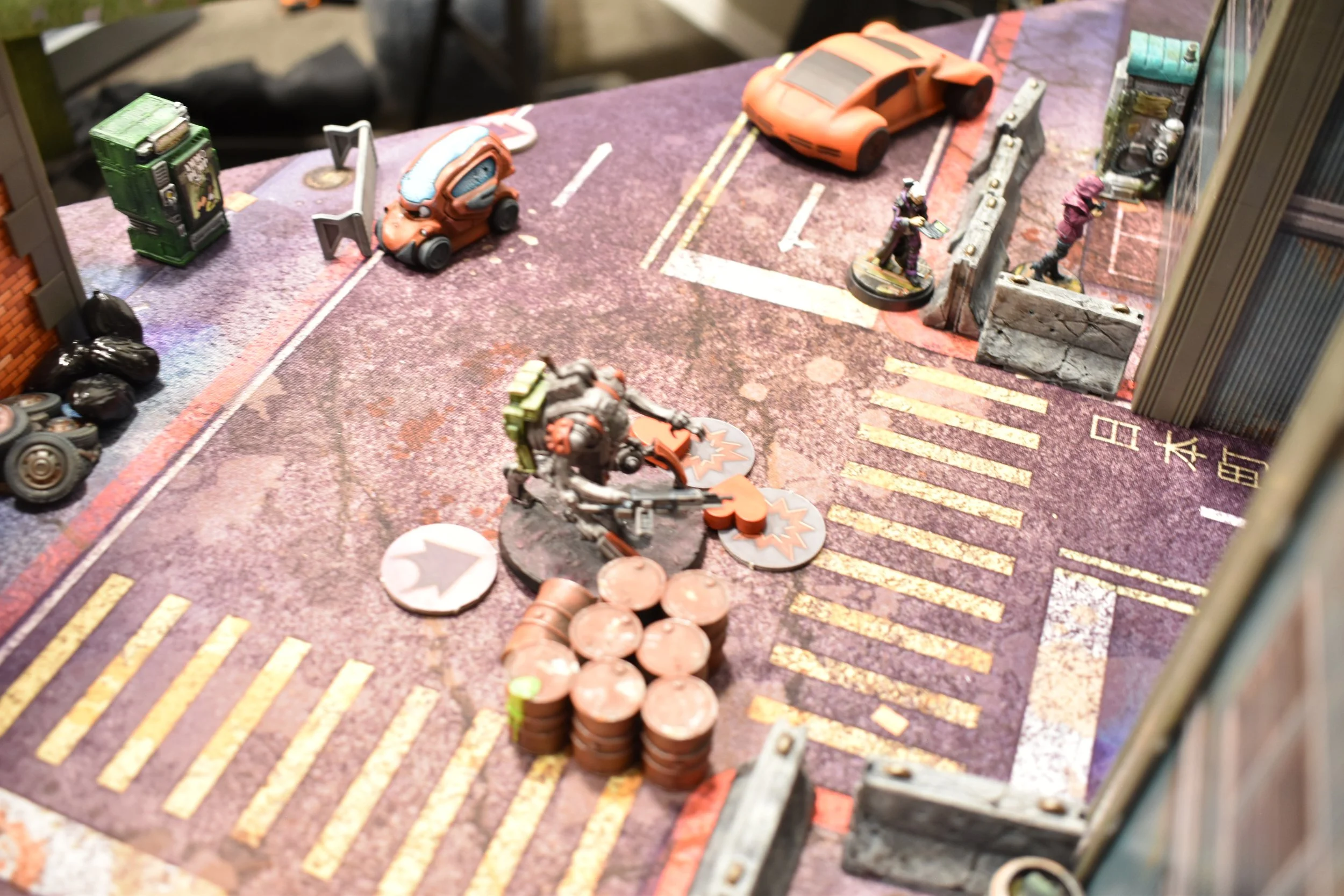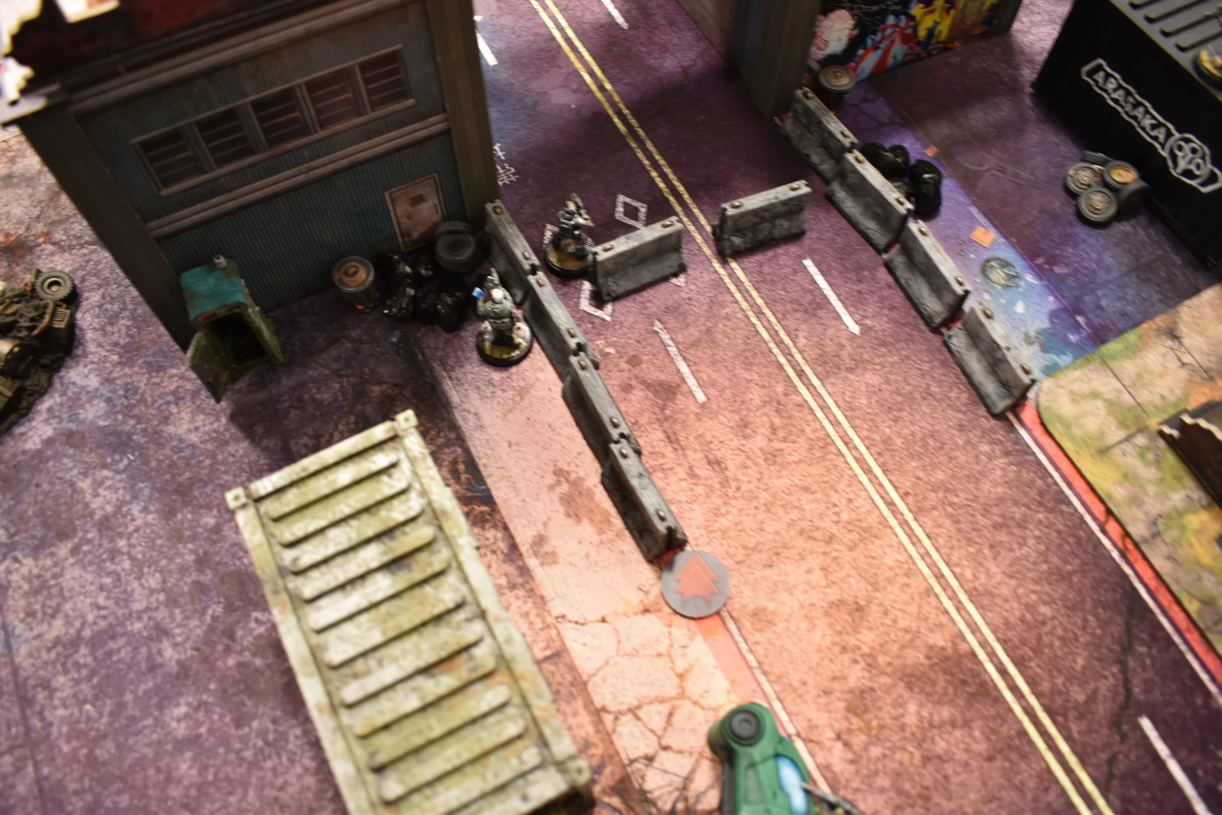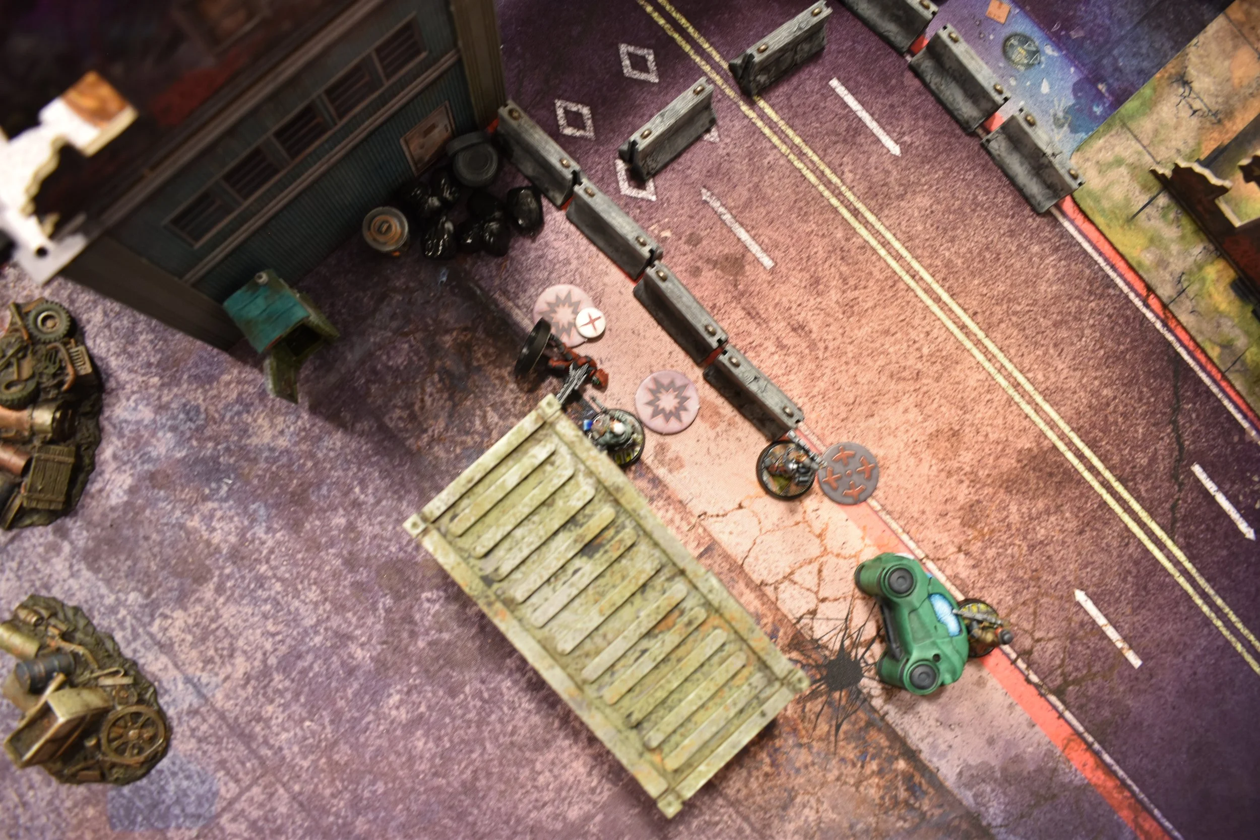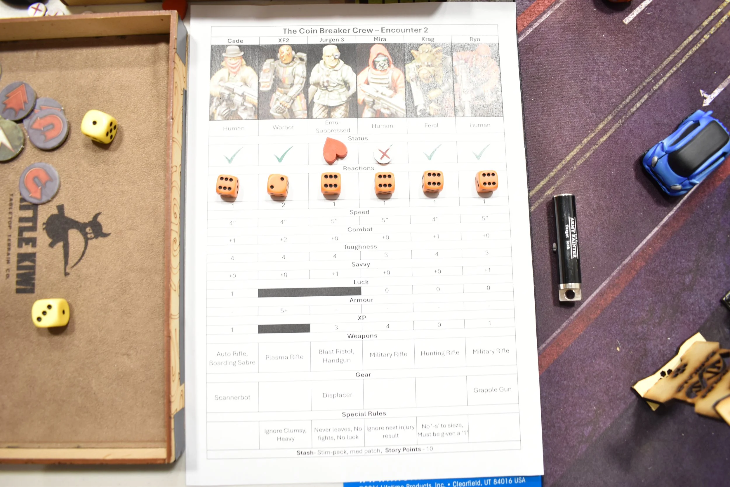 Slow Phase: The crew moved forward tactically. Krag and Rin ran across behind cover underneath a building on the right flank. Cade moved up behind the direct cars in the middle. XF2 moved behind a barricade while Mira and Jurgen advanced up the centre. XF2 took a shot at the Security Bot, scoring a hit but no damage, applying one stun. Cade followed up with his auto rifle, also hitting but causing no damage, leaving the bot with multiple stuns but still functional.