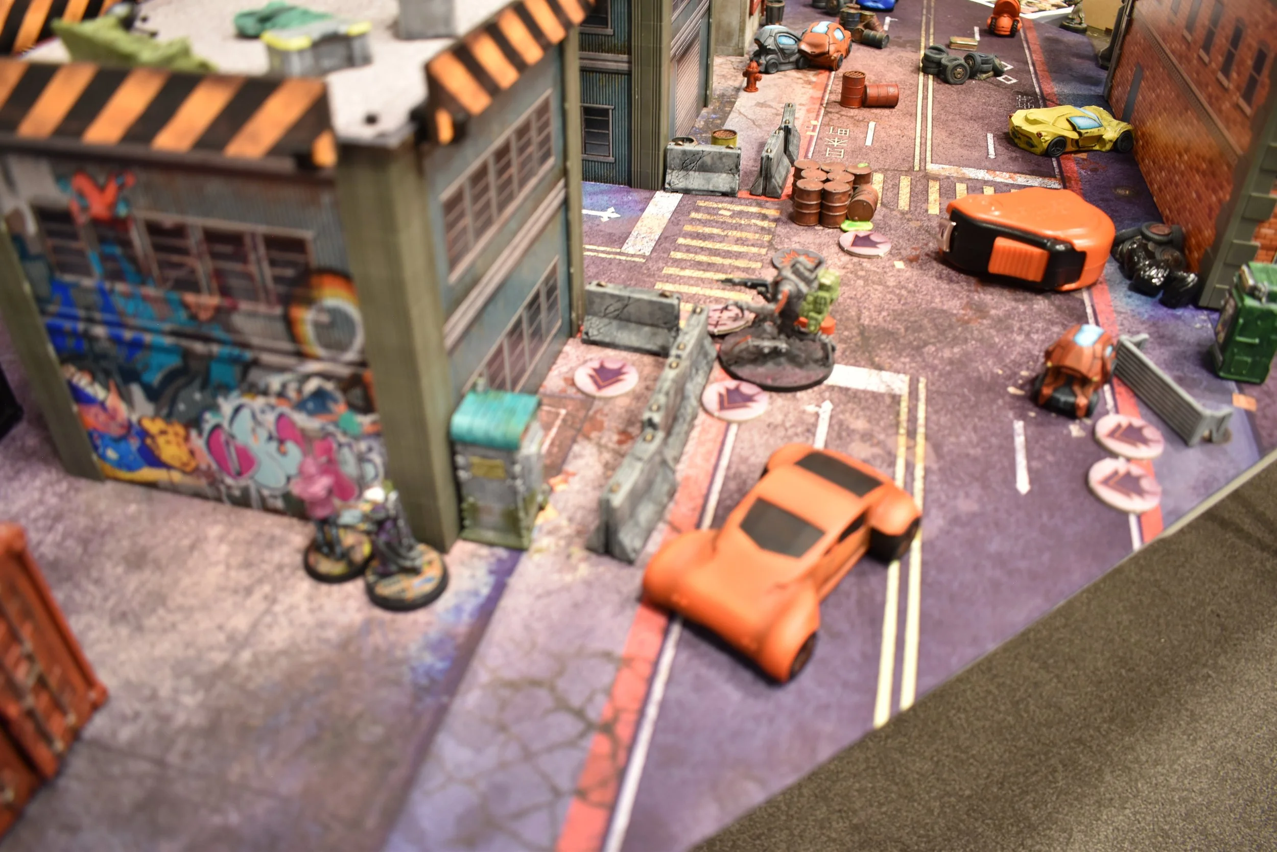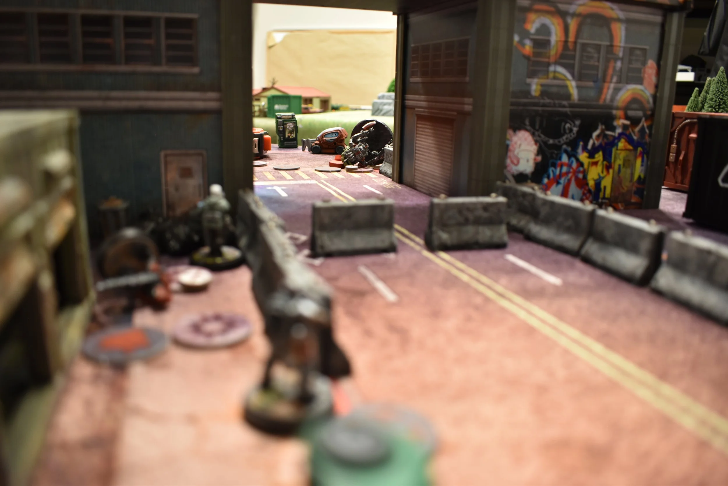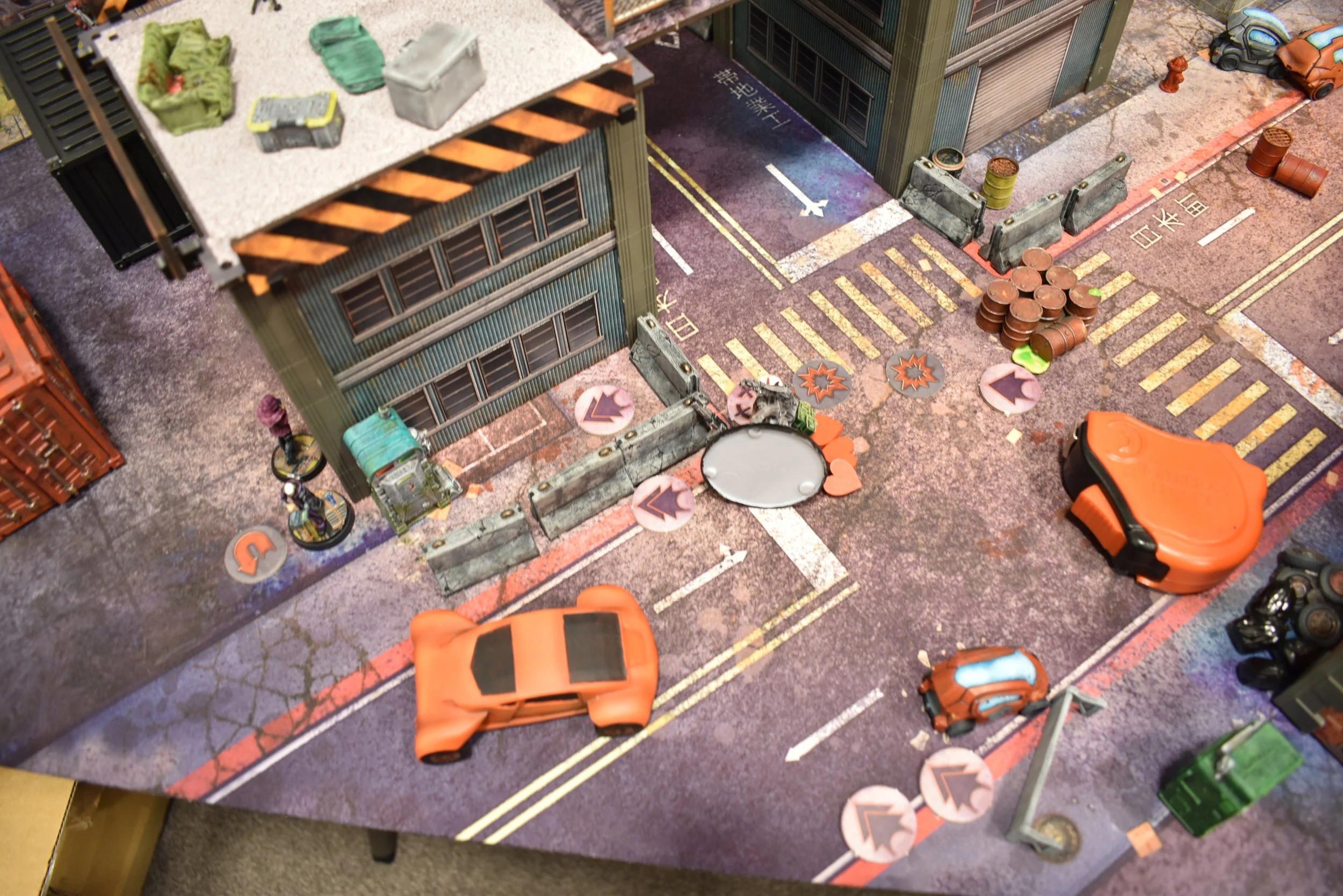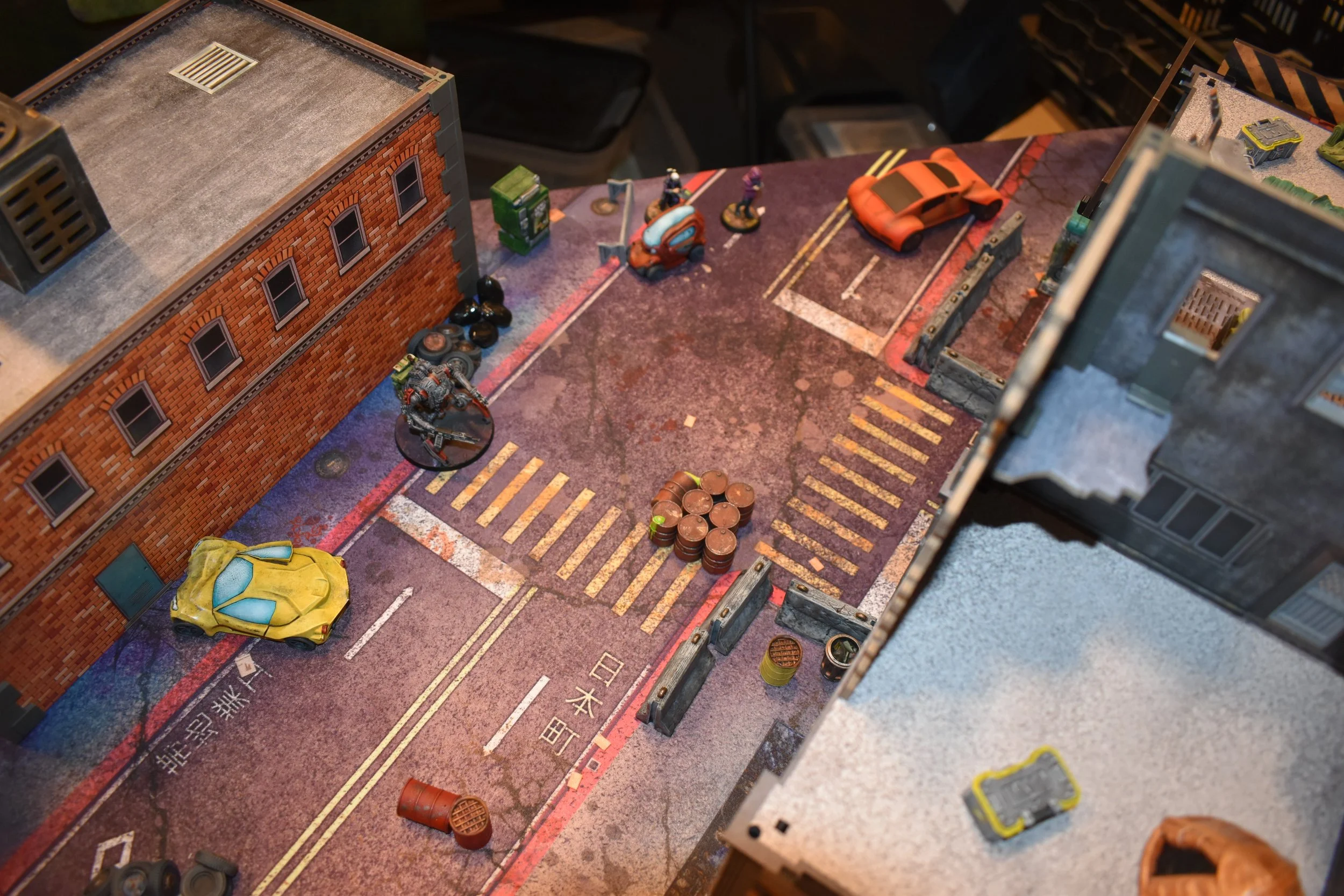 Slow Phase: The crew moved forward tactically. Krag and Rin ran across behind cover underneath a building on the right flank. Cade moved up behind the direct cars in the middle. XF2 moved behind a barricade while Mira and Jurgen advanced up the centre. XF2 took a shot at the Security Bot, scoring a hit but no damage, applying one stun. Cade followed up with his auto rifle, also hitting but causing no damage, leaving the bot with multiple stuns but still functional.