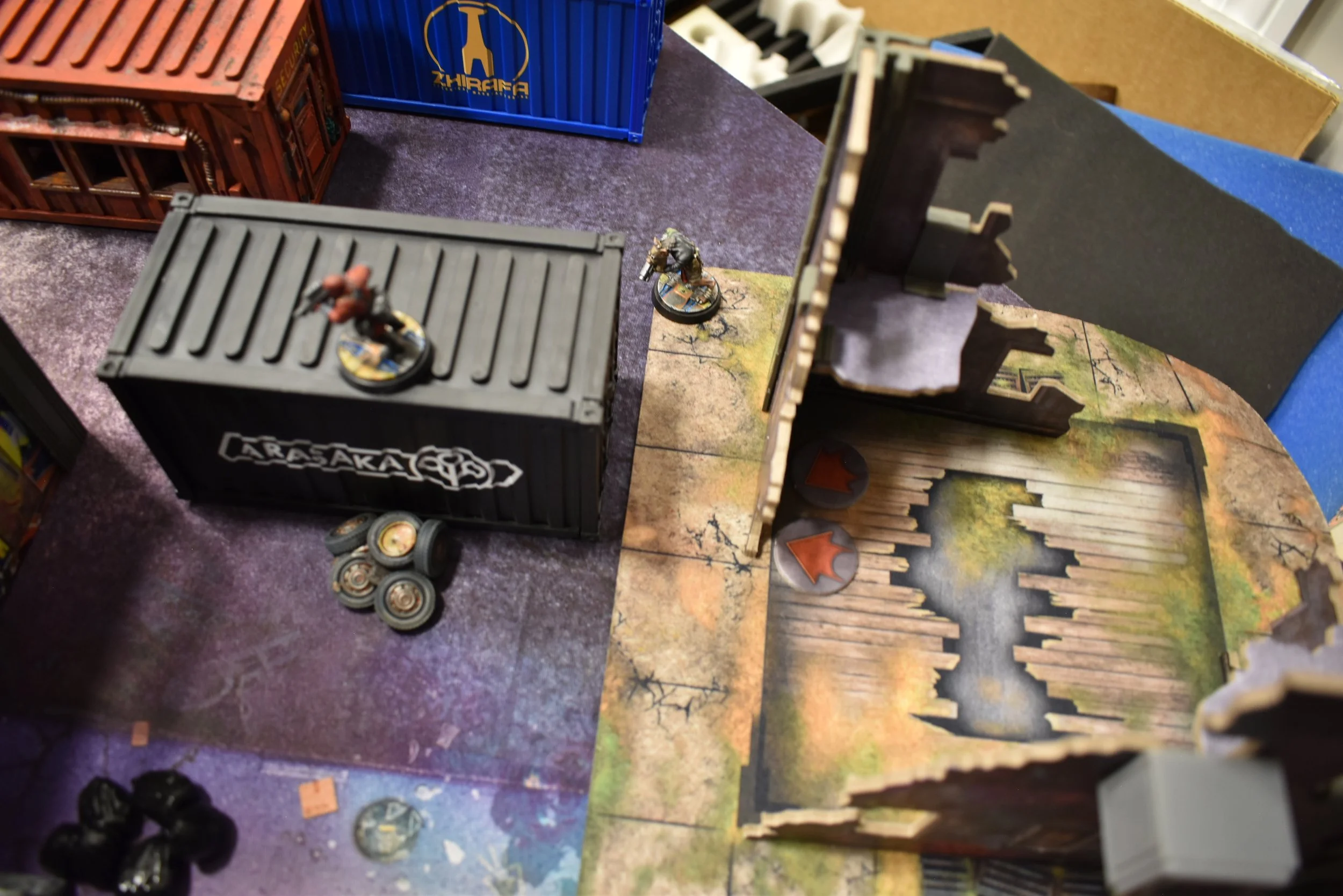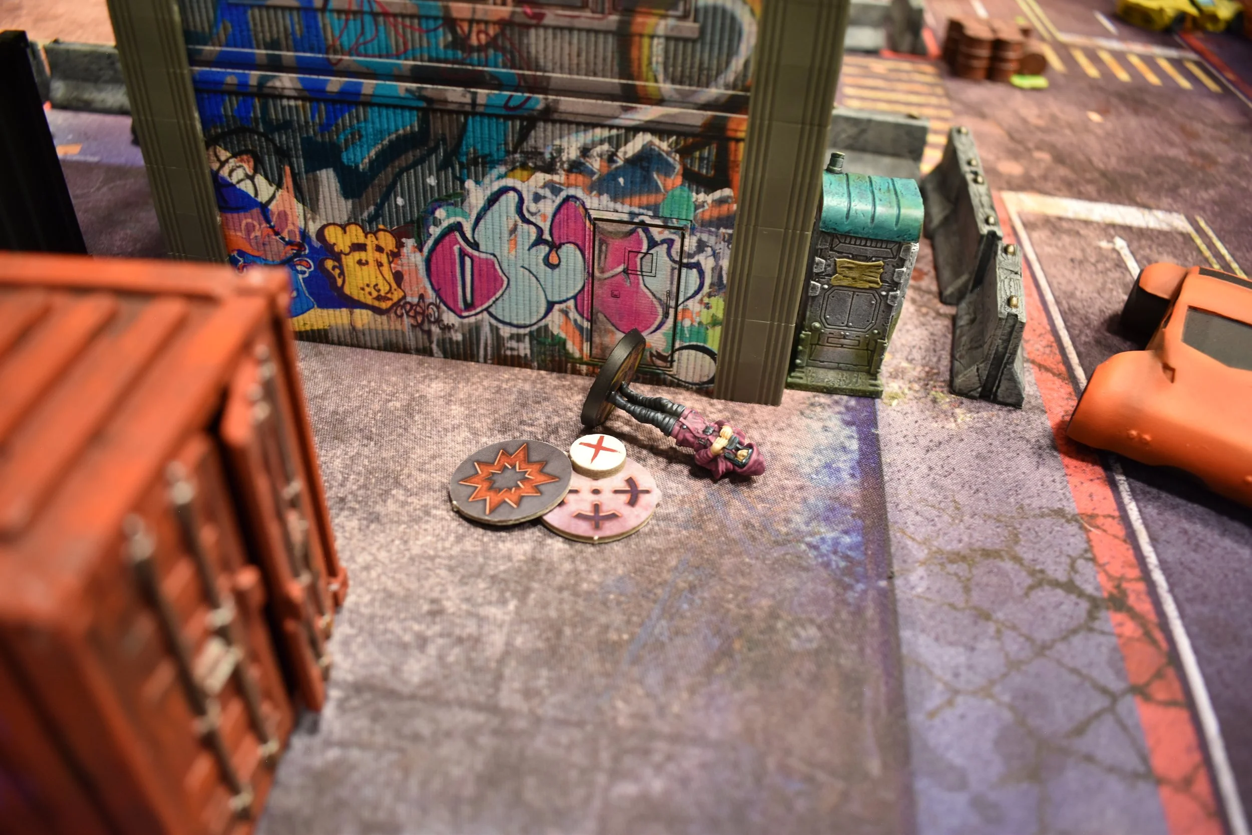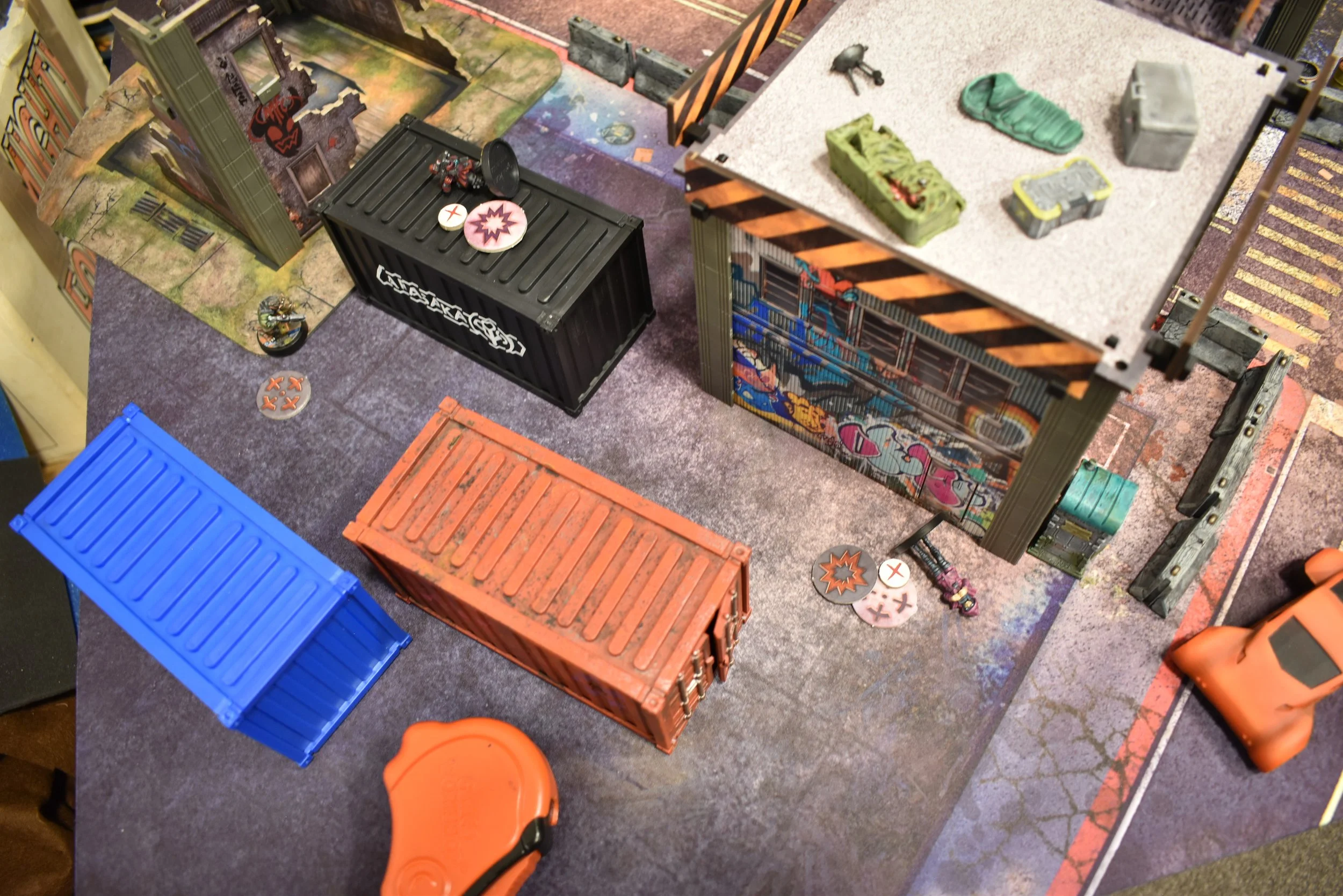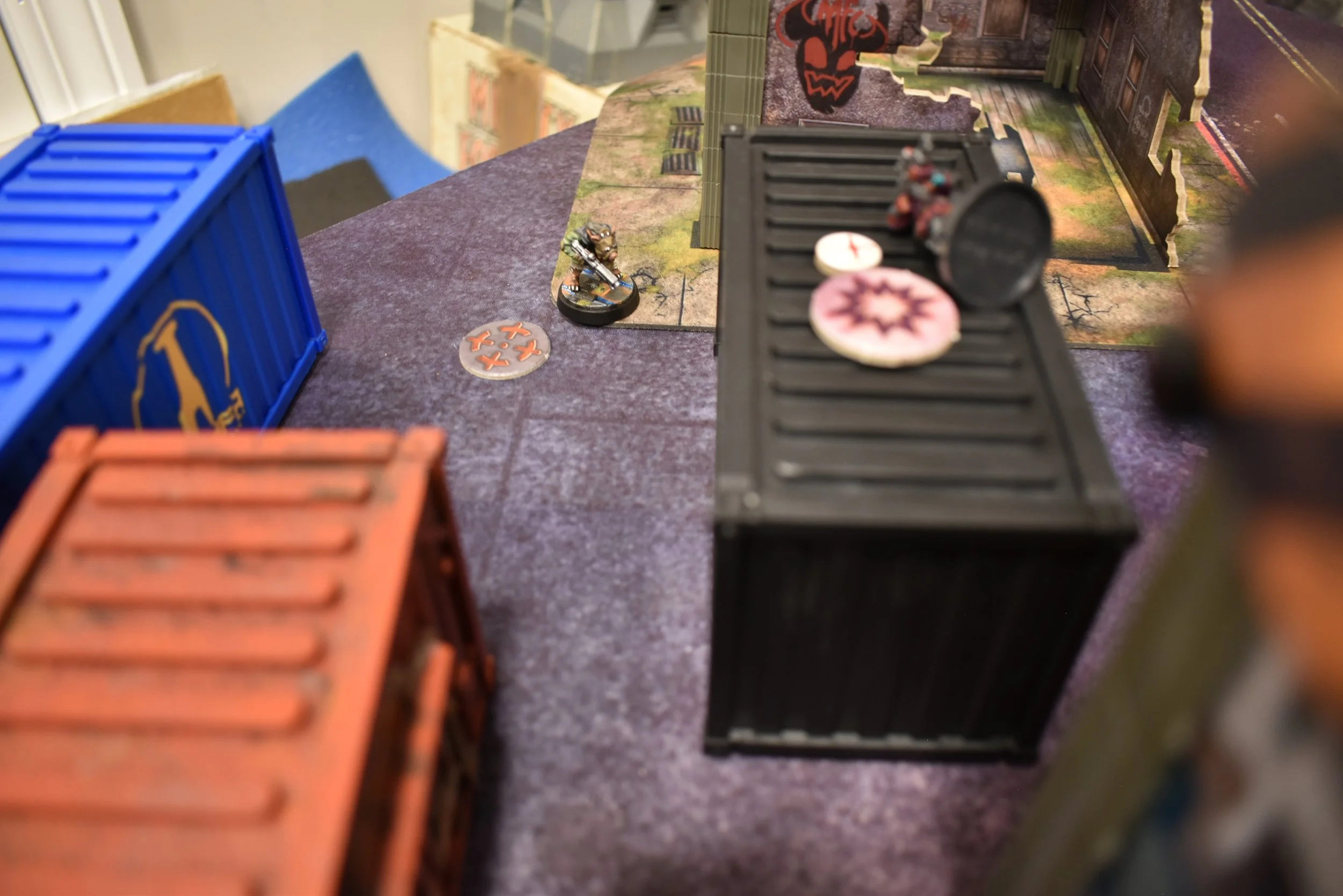 Slow Phase: Cade stood still to shoot, gaining an aiming reroll and scoring two hits on the Security Bot, bringing its total stuns to three and taking it out of action. On the right flank, Rin used her grappling hook to jump onto a container and take a shot at the priority target but missed. Krag ran around the corner with an aimed shot but also missed.