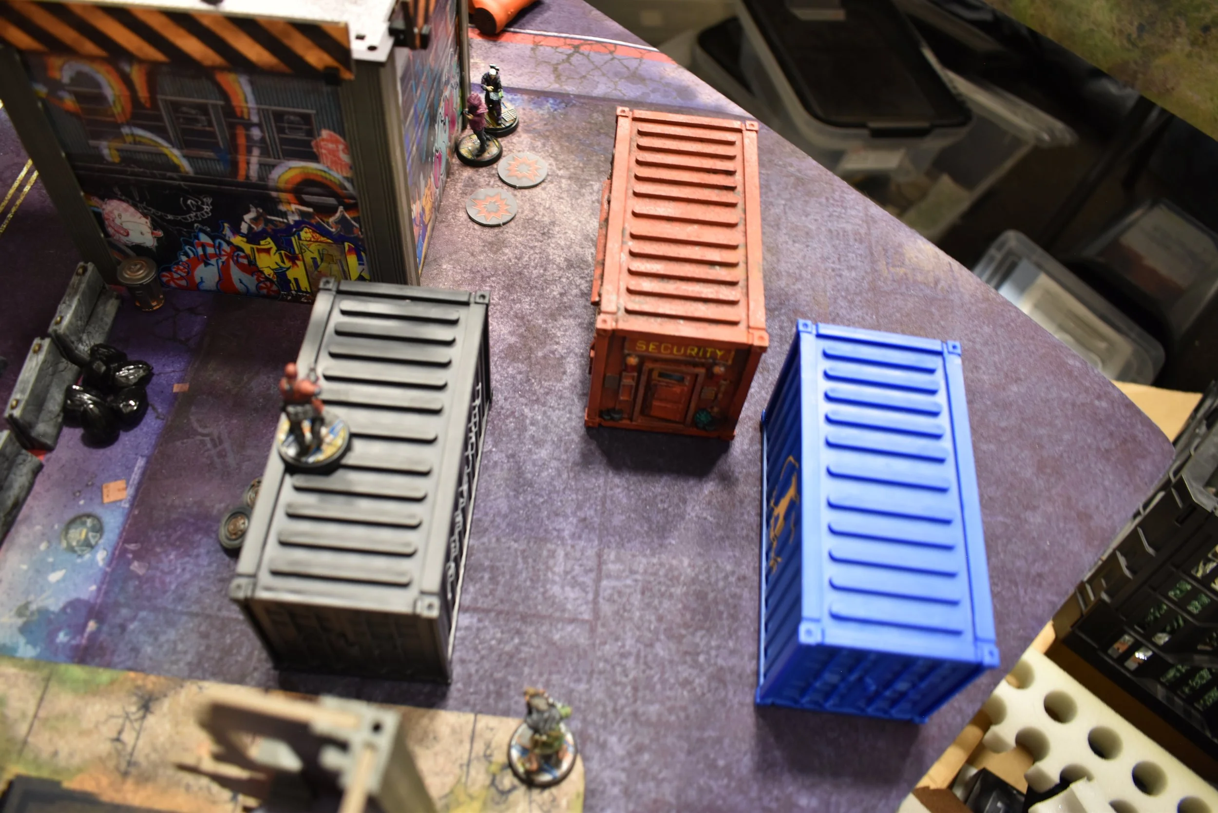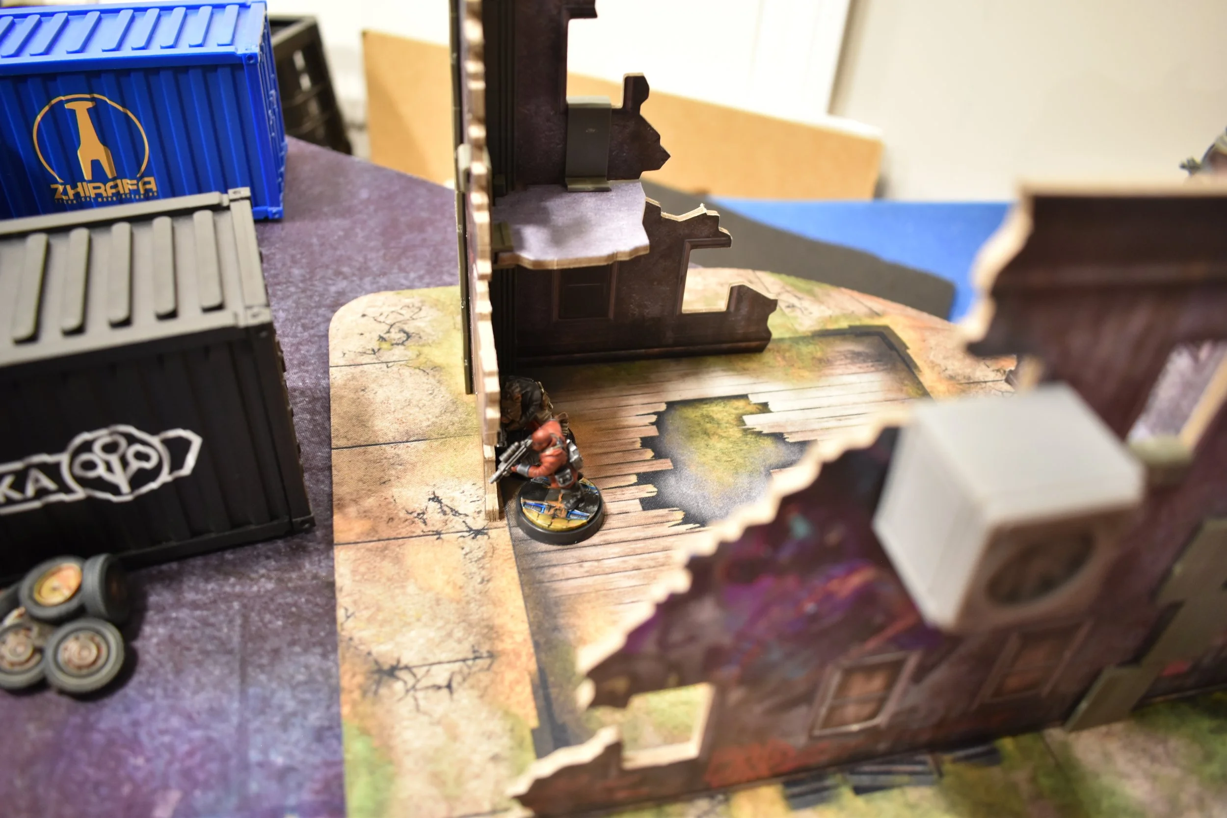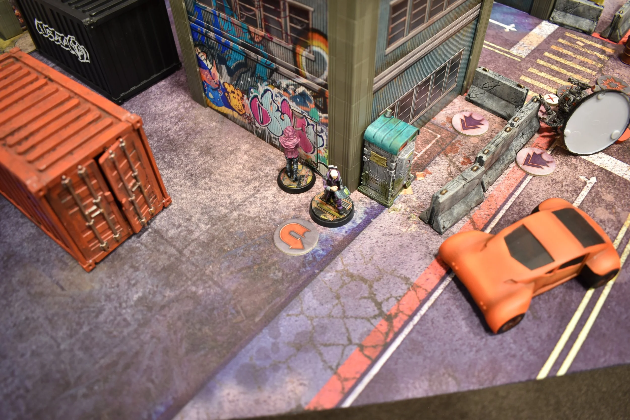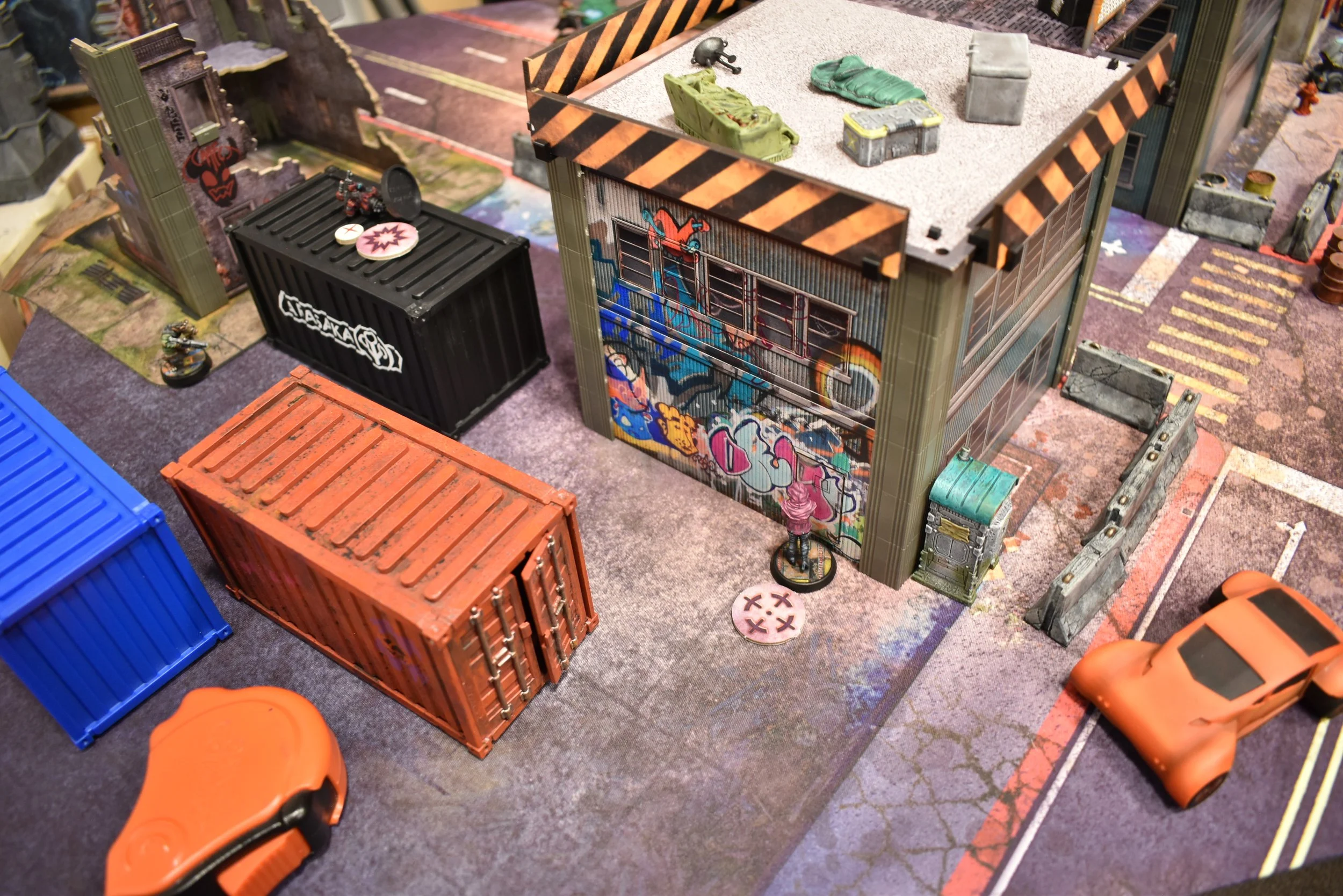 Slow Phase: Cade stood still to shoot, gaining an aiming reroll and scoring two hits on the Security Bot, bringing its total stuns to three and taking it out of action. On the right flank, Rin used her grappling hook to jump onto a container and take a shot at the priority target but missed. Krag ran around the corner with an aimed shot but also missed.