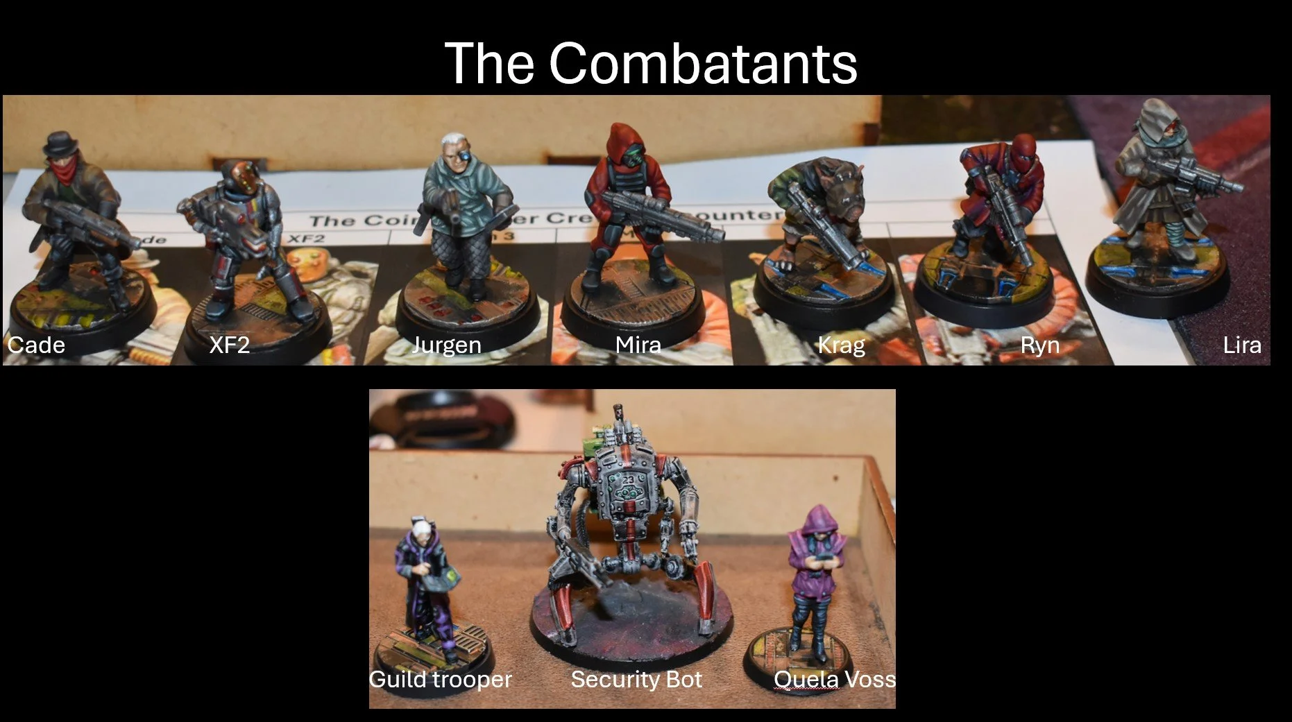 Enemy Phase: The two Guild troopers moved around the side of the building attempting a flanking manoeuvre. The Security Bot moved to a new position and opened fire with devastating effect—successfully taking out Mira (who avoided injury rolls due to a previous character event) and stunning Jurgen, who barely survived when the bot rolled a one.
