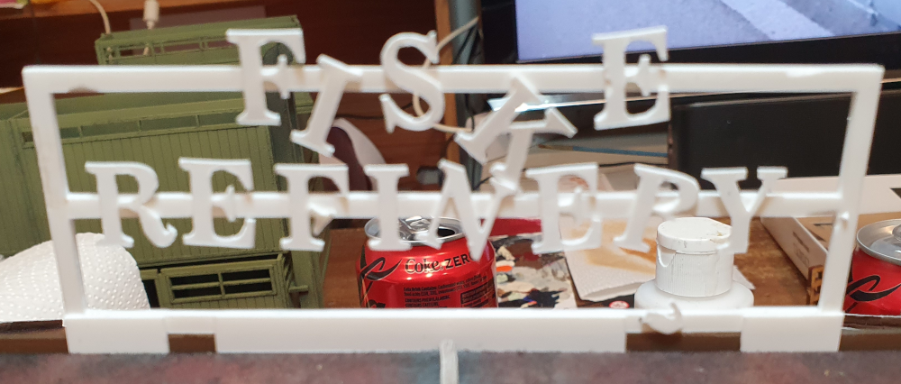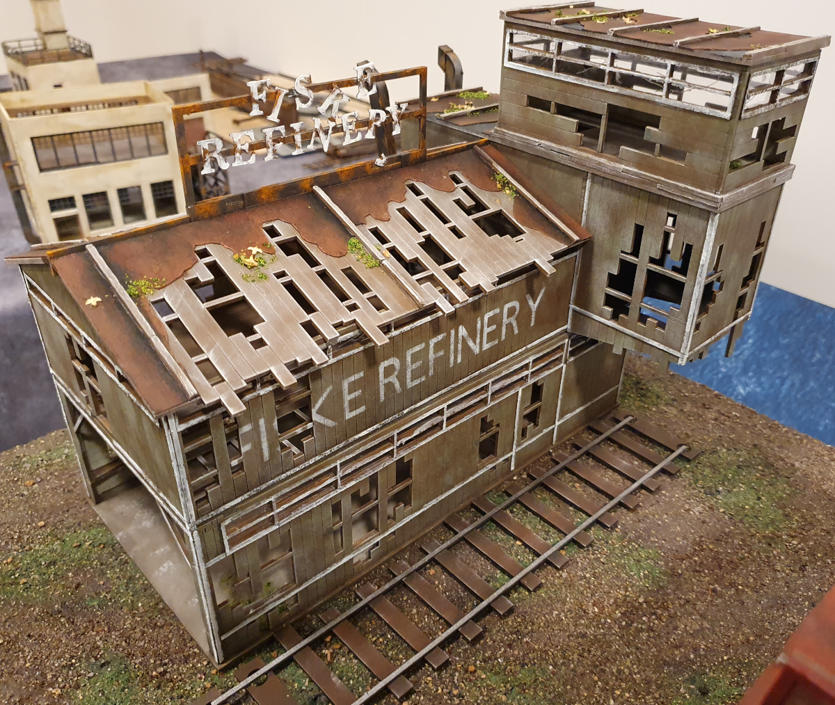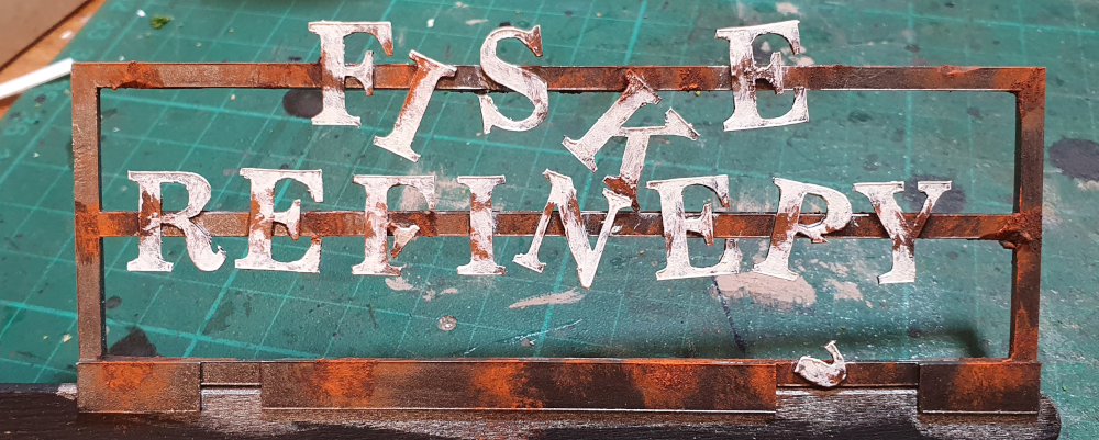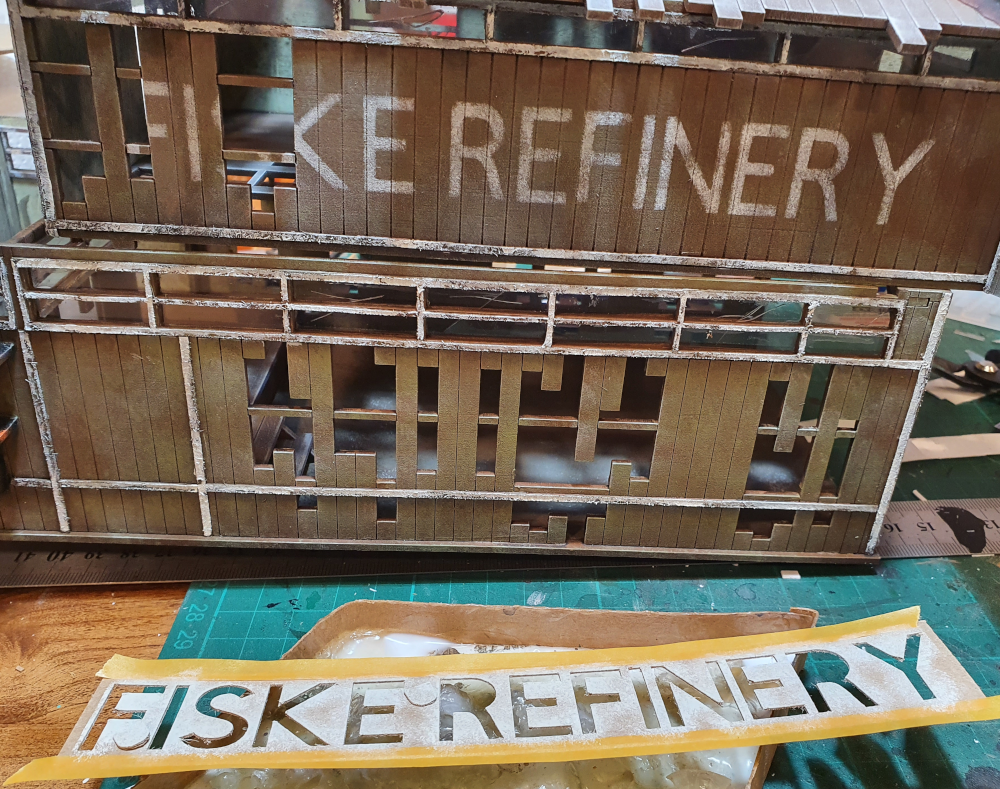 Just to add to the work, i used a test cutting of the refinery name from my Cricut and made a stencil from it which i used to stipple on to the side of the building.