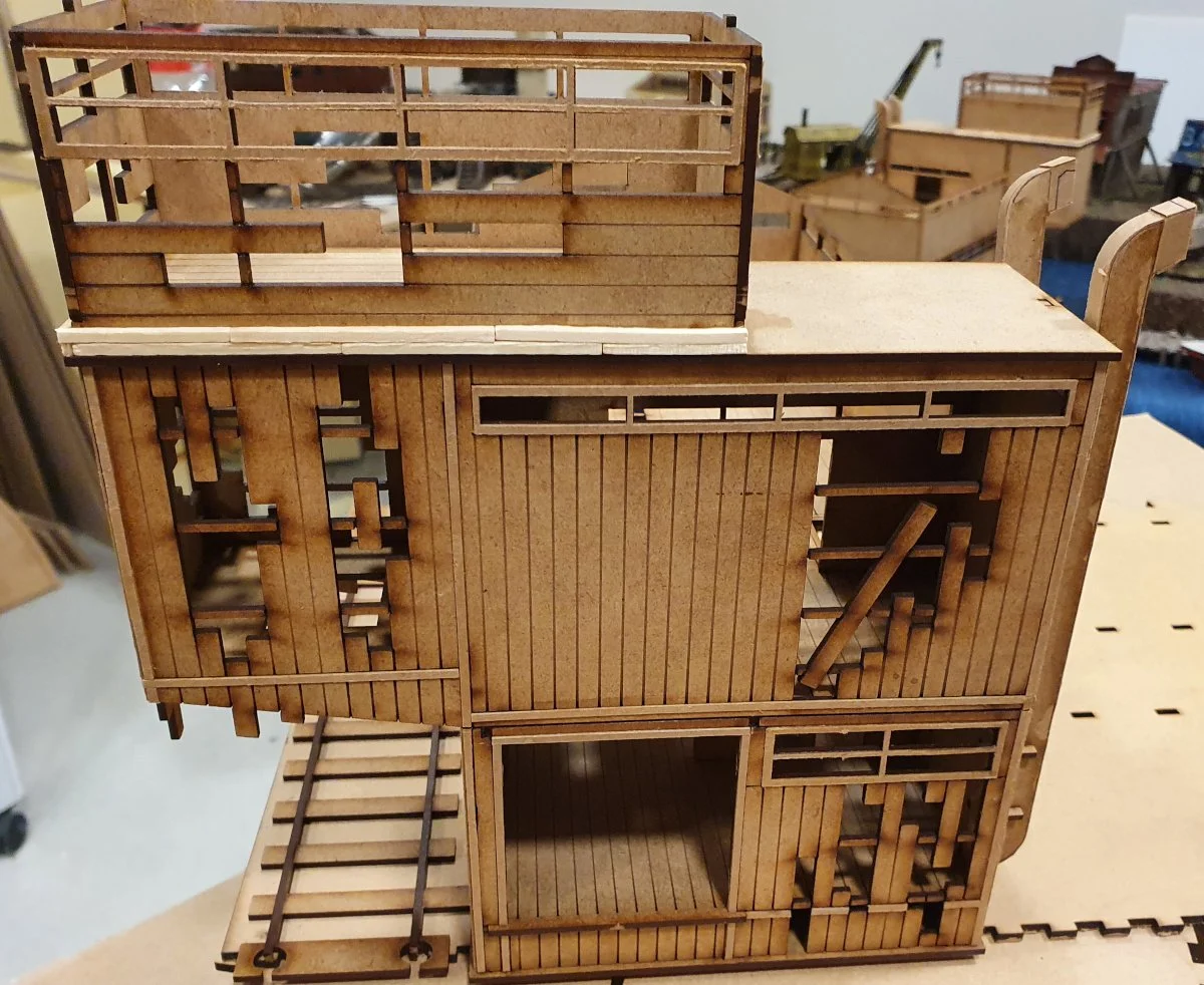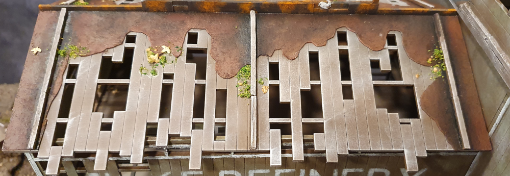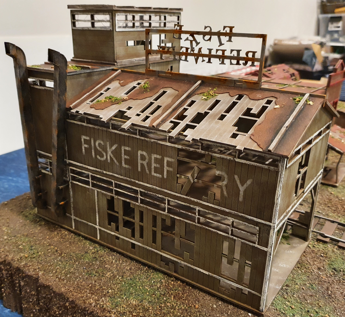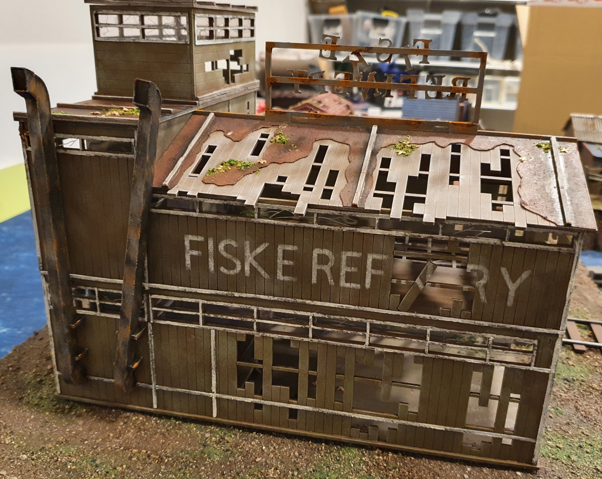 Just to add to the work, i used a test cutting of the refinery name from my Cricut and made a stencil from it which i used to stipple on to the side of the building.