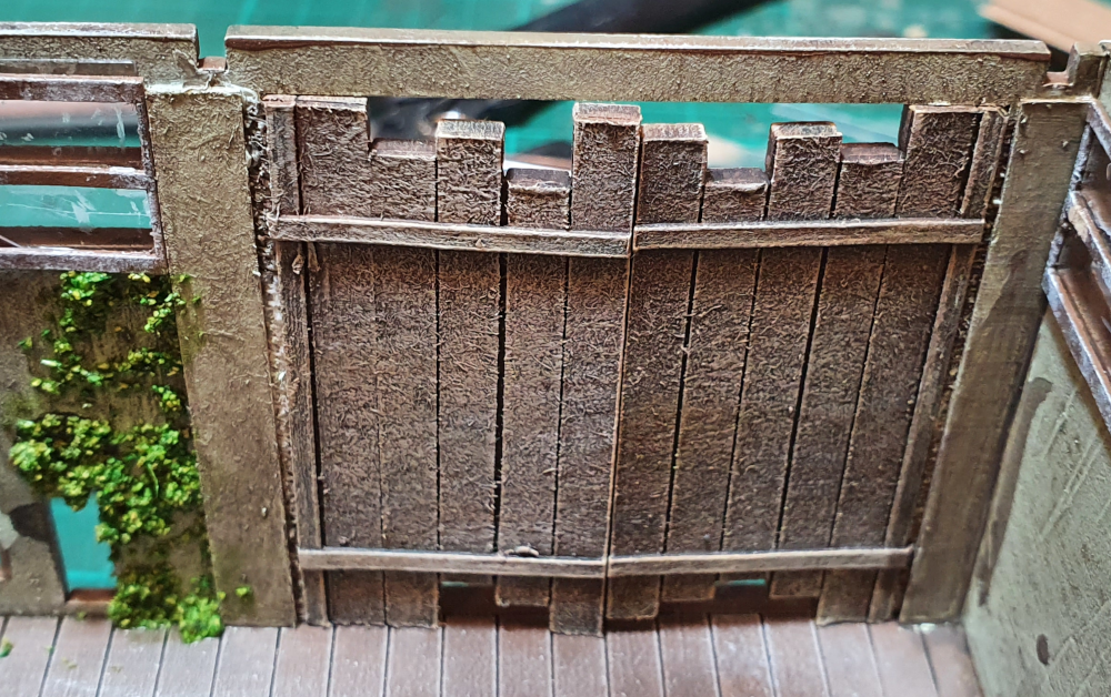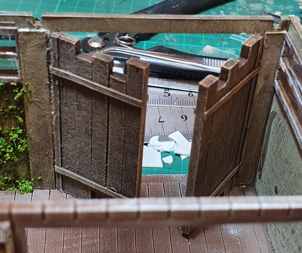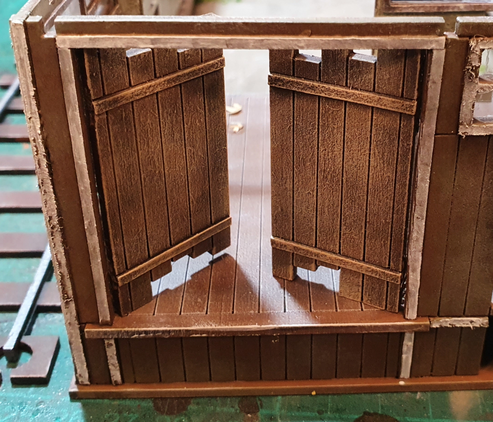 the weft was glued into the building and then covered with card to hide it. it provides a good hinge, though it does not stay all the way open. i used super glue for the small door but would not use this again and would use Mod podge as the super glue goes to far solidifying the weft.