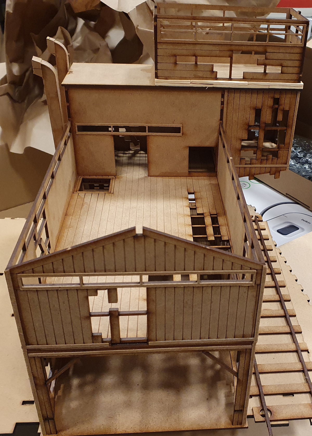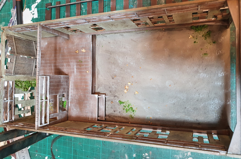 I also added match sticks around the base of the top floor and on the lining of the roof panels, and the roof pieces were done in card, to show a 3d effect of roof panels breaking apart to show the bare wood beneath. i forgot to get photos of the roof panels before painting, but you can see them in the painted photos.
