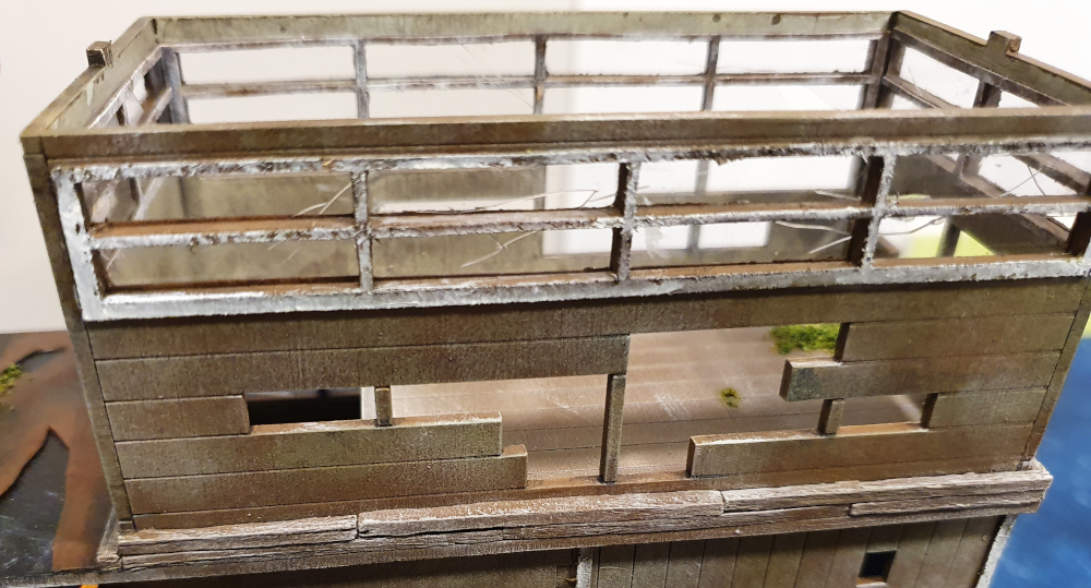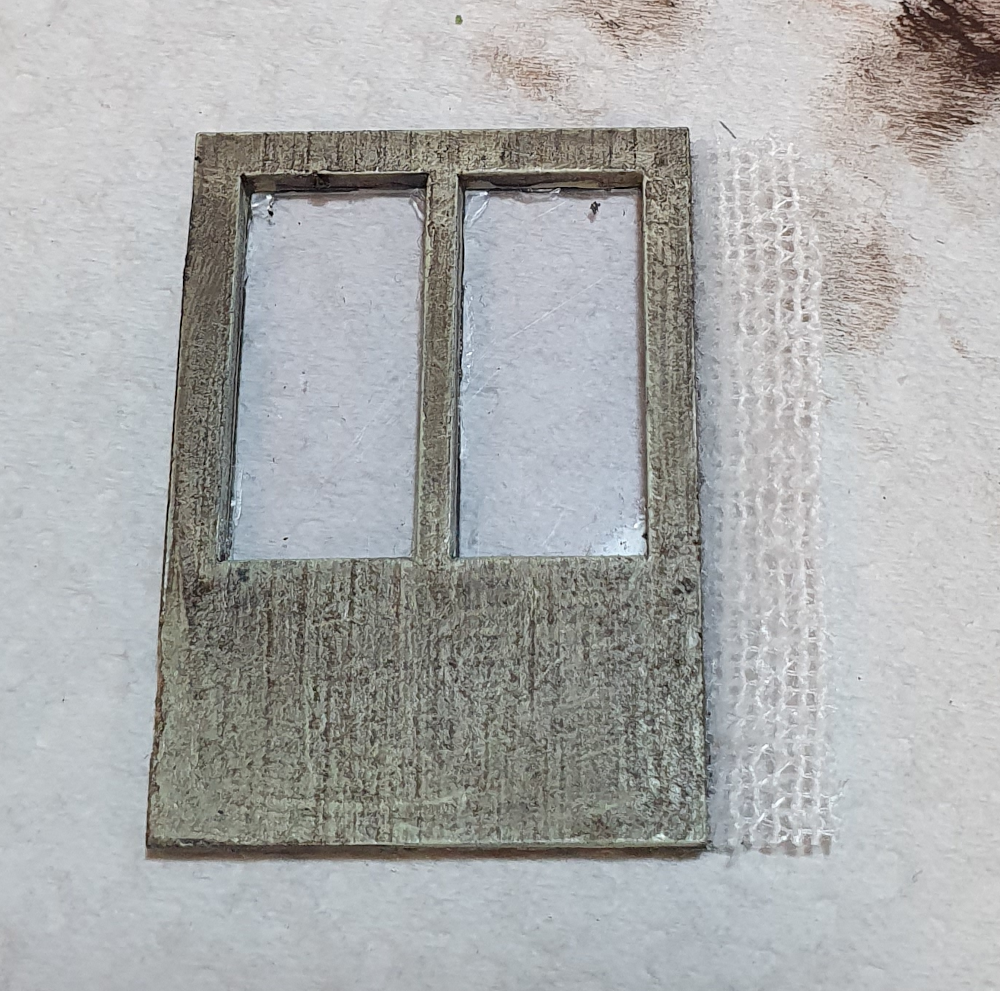 I cut out the window frames again and glued them on to acetate, after cutting scratches and holes, i glued to the inside of the windows to show them as glass. hard to see as they are clear, but you can see it in this photo. every window was done this way and the building has over 10. I may choose to weather them with sepia wash but its already pretty busy.