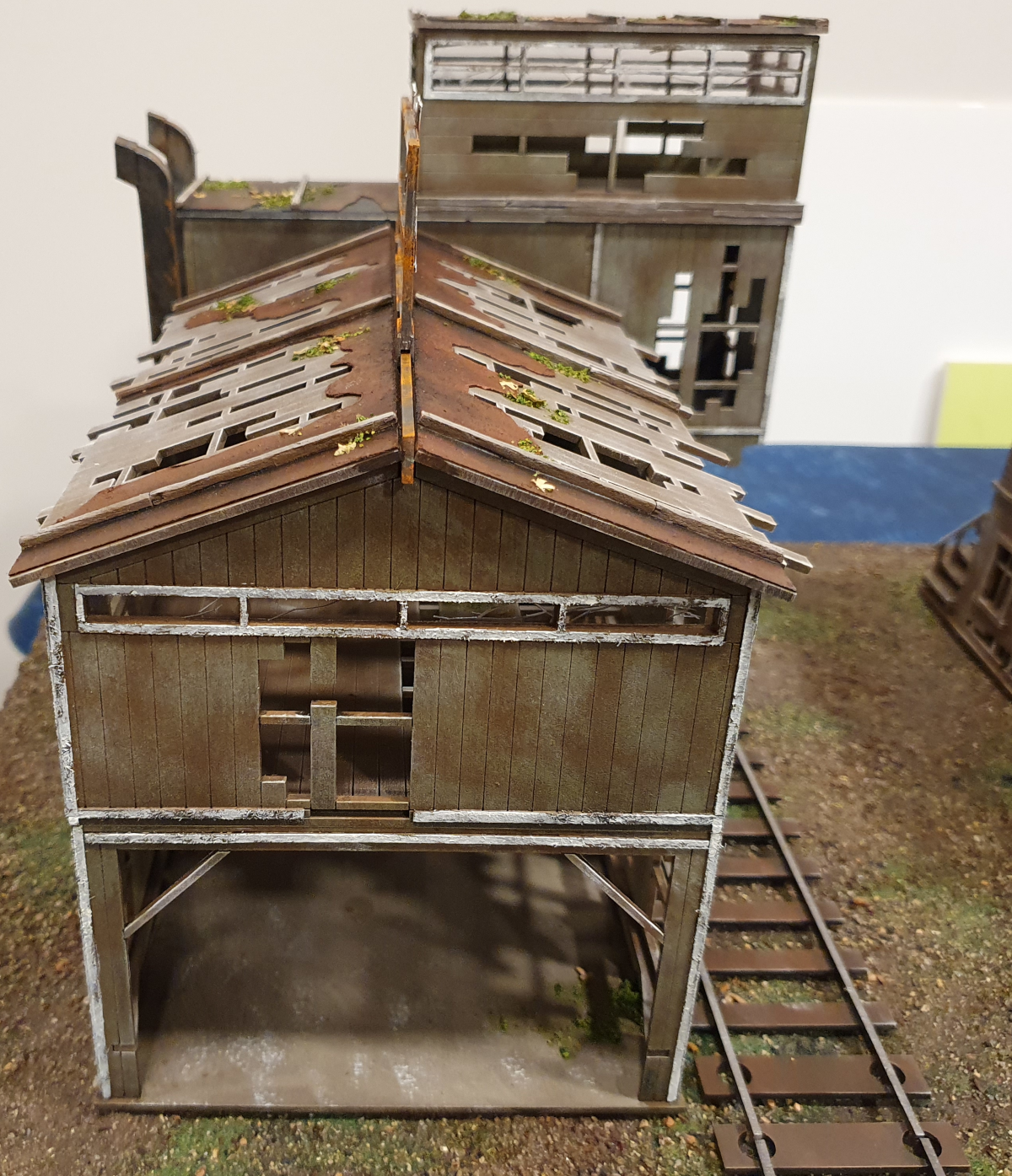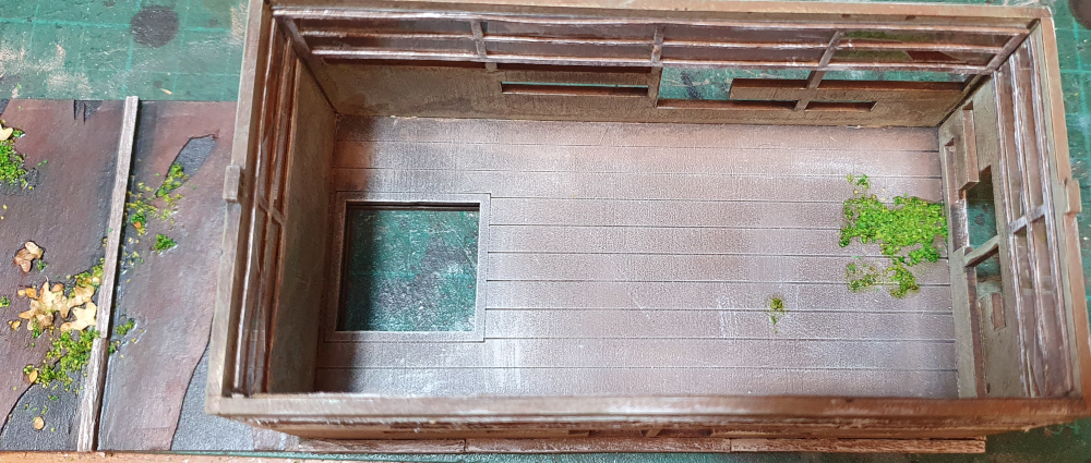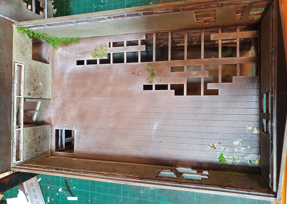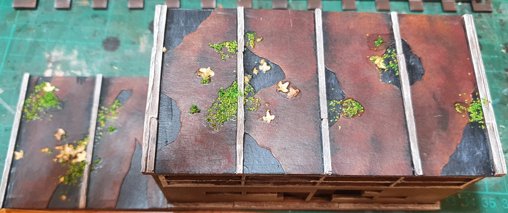 I base coated the building with Army Painter Leather brown, washed it with a black and brown wash and then heavy stippled on GW Death Guard Green (the non damaged version will start on Death Guard Green).