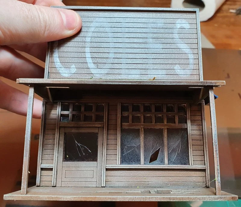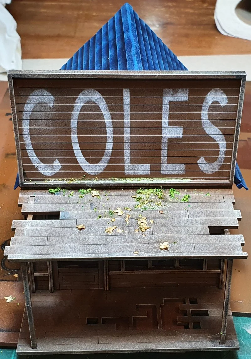 This is the first shack with the stencil. Coles is an Australian super market and its also one of my gaming groups last names so its a part in joke for the store. I might do some more stippling on the stencil to make it look dirtier or add some streaking but i think it looks ok.