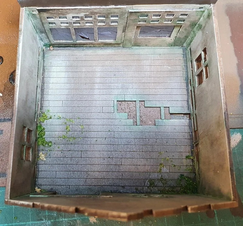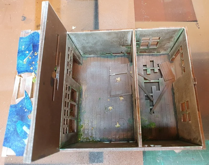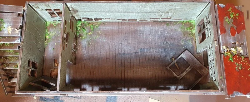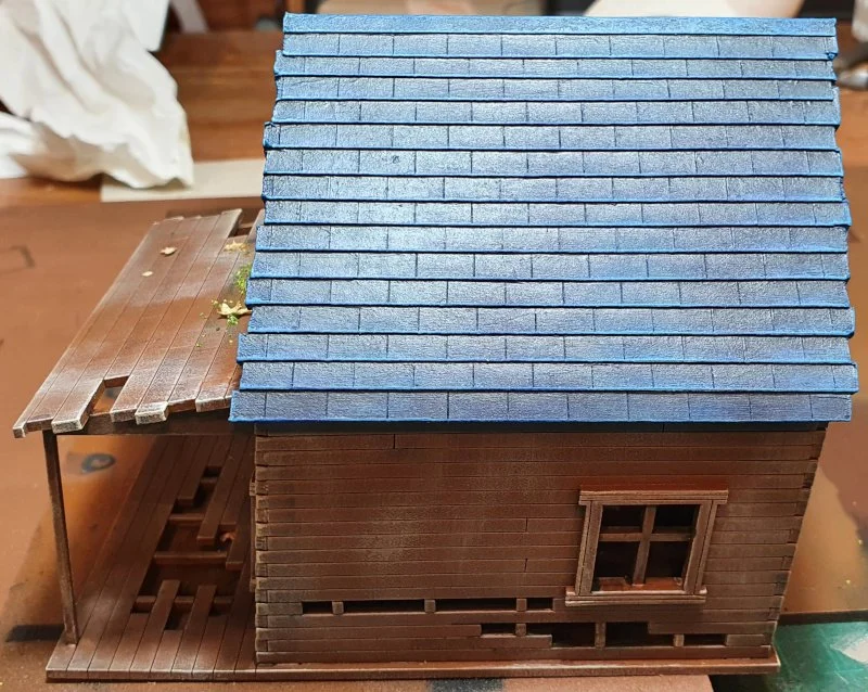 This one has both the iron roof and some of the card panels over the wood, so it was a bit of work. i used the same mix as the island bases for the exterior and then just grout for the interior floor.