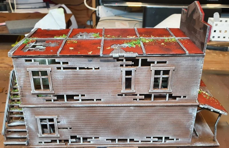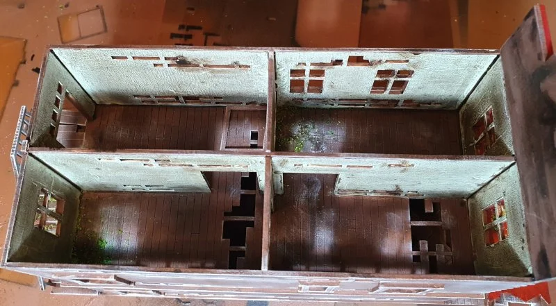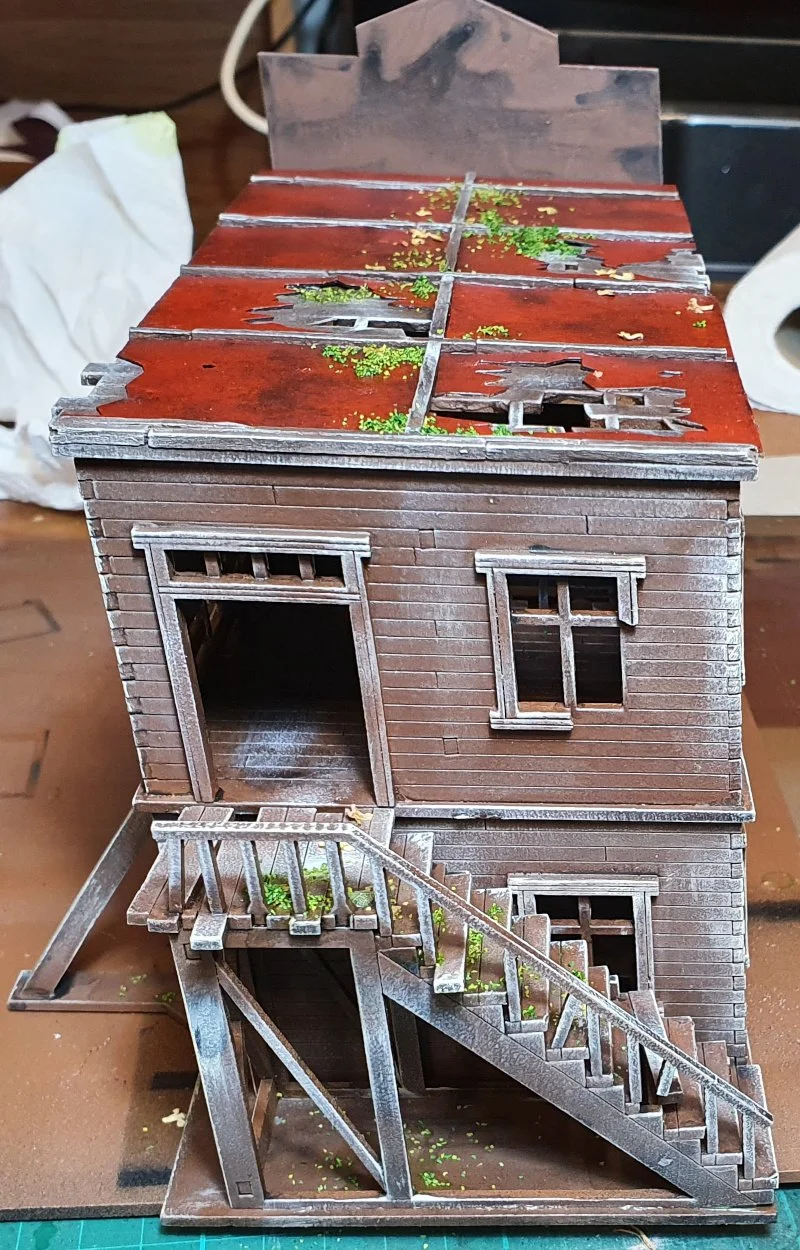 this kit was a pain, the spray paint i used originally would not let any other paint on it so i had to varnish it first. I did the same roof card and a stencil and internal scatter. i might add some grout under the stairs as dirt, i will see how i go.