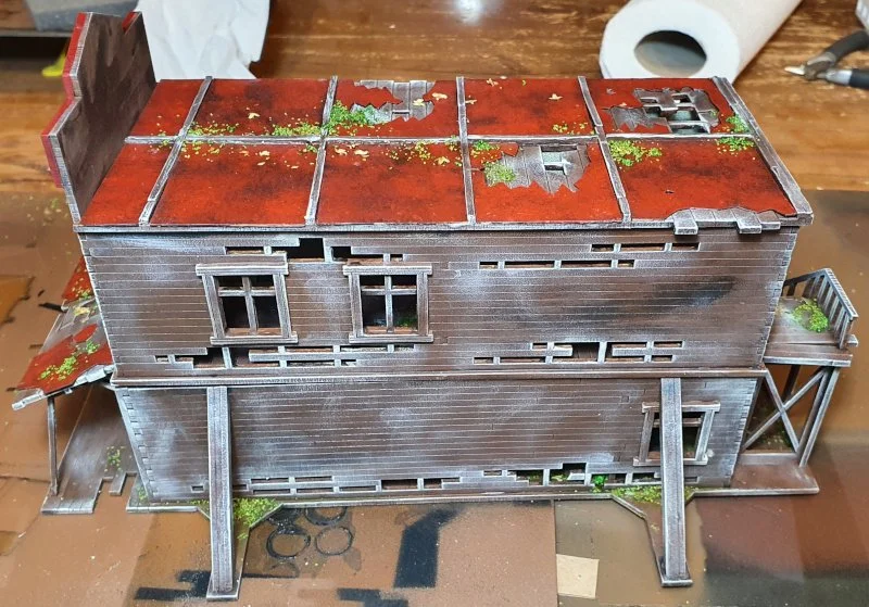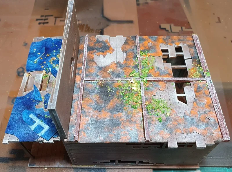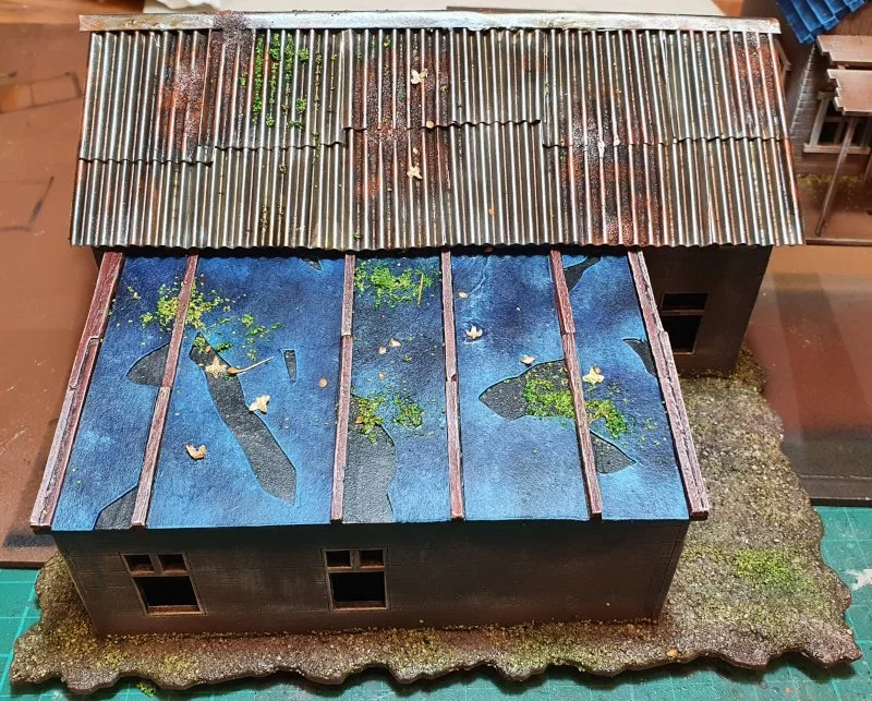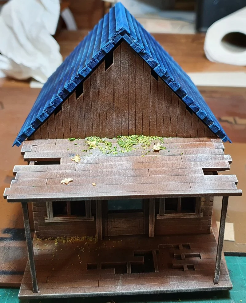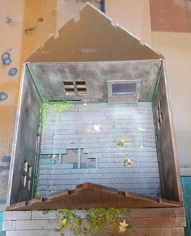 I sprinkled some silica sand on the roof to use for rust texture and glued down some flock and leaves for debris.