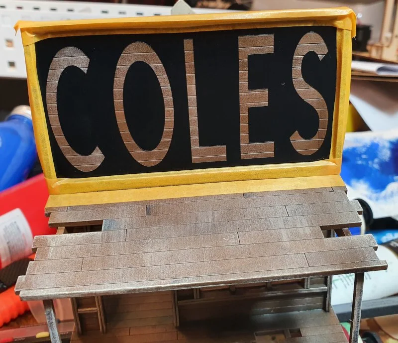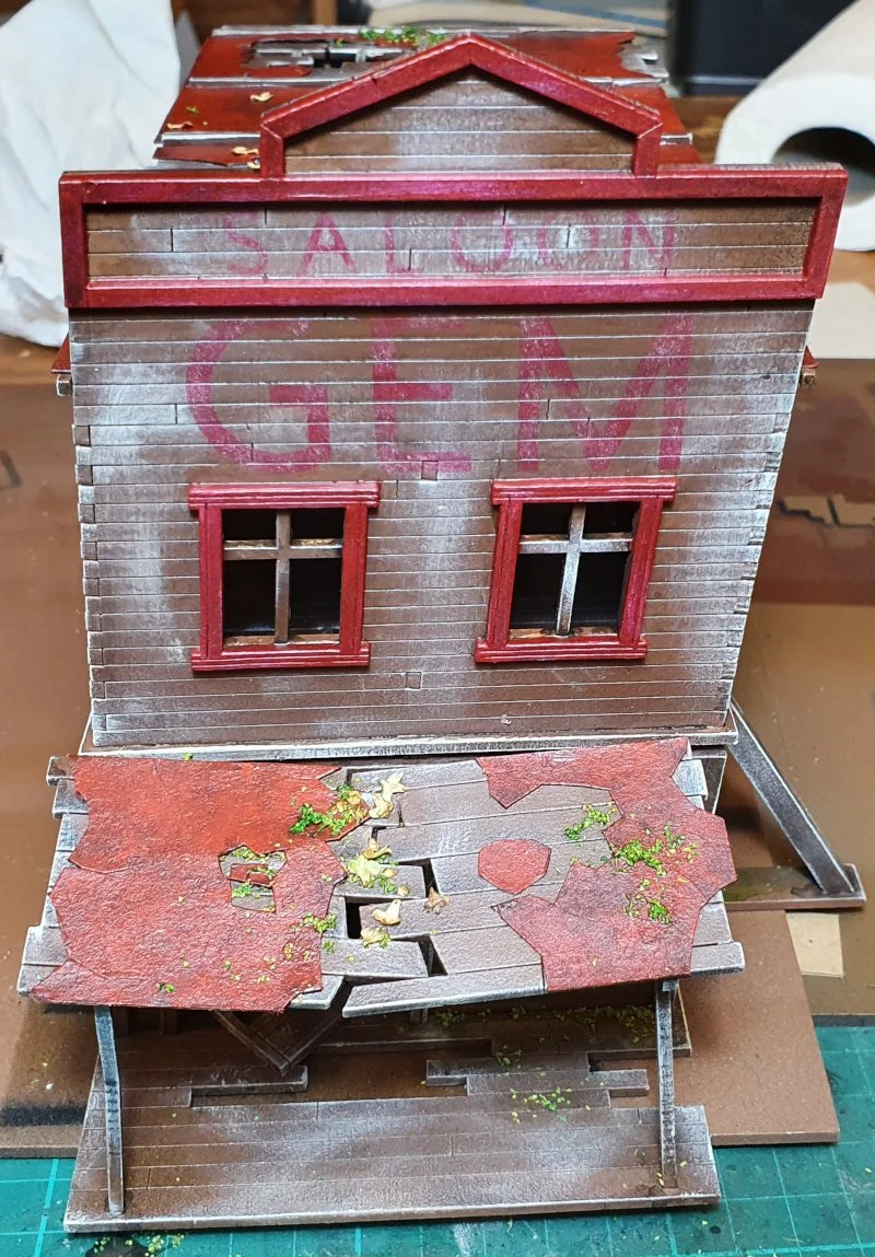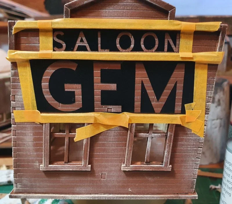 The on card is because that building was more run down so i wanted it to look like a sign that had fallen apart rather than painted directly on the wood. i got the length of card wrong (or the stencil too long), but as i was going to be cutting it up it was not a major issue.