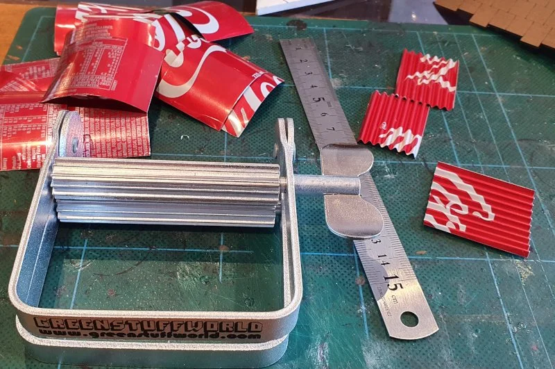 Corrugated Roof - then i got carried away and decided the boat shack should have a corrugated roof. i used a Roller i got from GSW and some of the many coke cans and made up the pieces. it was fine, but the aluminium did not like supe glue much and the overlaps got thick. the challenge with the roller is you need consistent pressure otherwise the rolls start to curve out. its not perfect but its meant to be rundown anyway. as i glued the last piece on and unstuck my finger i wondered if card would work as well, and its actually easier so the next roof i will do will be with Card. I wasted a bottle of super glue accelerant which just caused lumps, which looked bad but i used to make areas of rust.